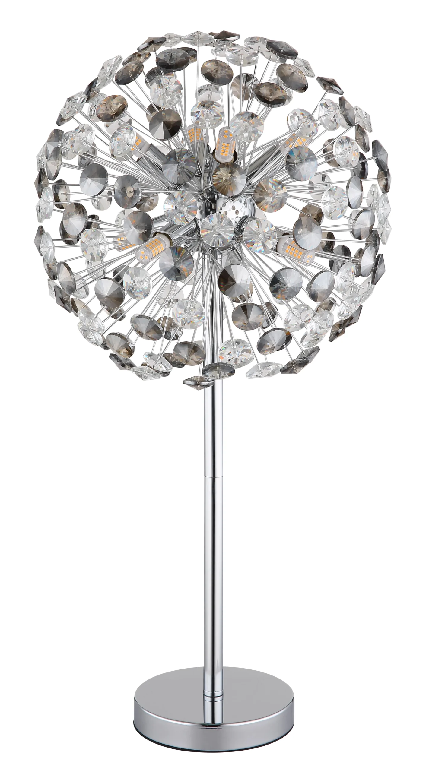 Otkrijte bezvremensku lepotu okrugle stone lampe „KATRINA“, koja stvara elegantnu atmosferu svojim hromiranim metalnim kućištem i dimljenim, providnim K9 kristalima. Ova izvrsno dizajnirana rasveta ima 8XG9 LED sijalica koje proizvode toplu svetlosnu temperaturu od 3000K i pružaju osvetljenost od 350 lumena. Abažur napravljen od K9 kristala prelama svetlost na umetnički način i obezbeđuje magično rasejanje svetlosti u prostoriji. Praktični prekidač na kablu omogućava praktično rukovanje. Bilo da je postavljena na noćnom stočiću, u dnevnoj sobi ili na komodi, stona lampa „KATRINA“ se harmonično uklapa u svaki enterijer i daje vašoj sobi glamurozan dodir. Savršena za ljubitelje tradicionalnog zanatstva i bezvremenske elegancije.