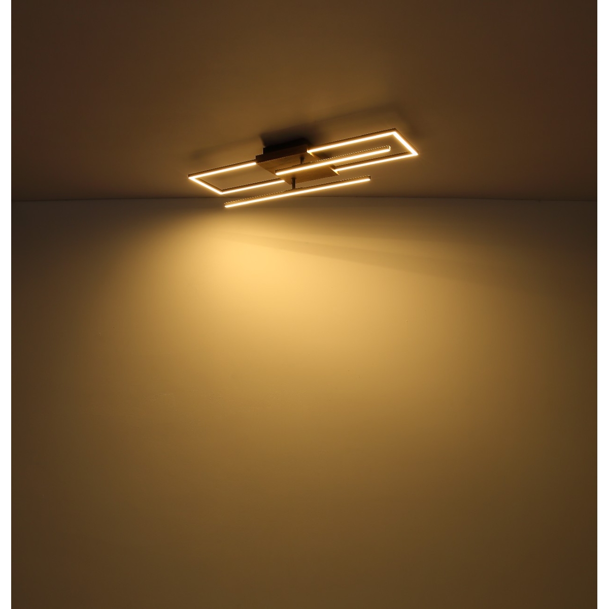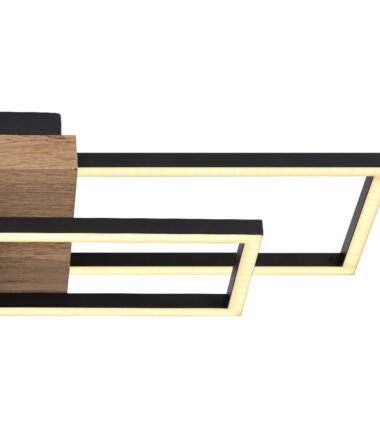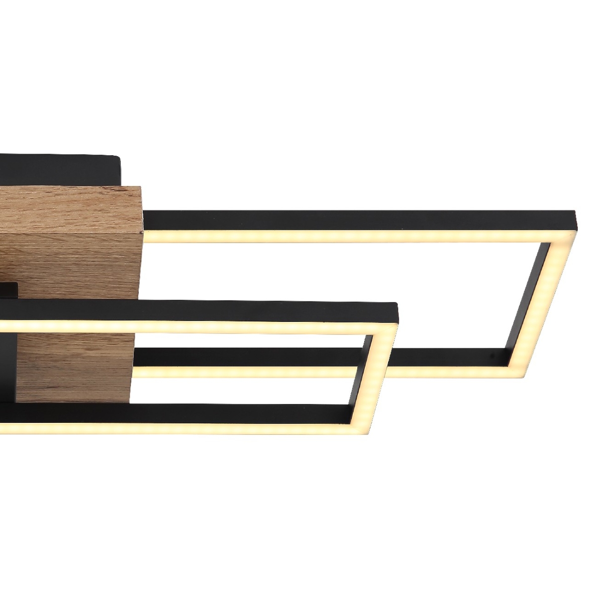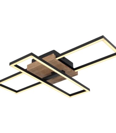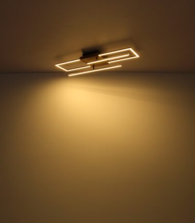 Ova impresivna plafonska lampa ubeđuje sjajnim dizajnom i postaje centar vaših soba. Na crno mat plafonskoj osnovi sa prelepom dekoracijom nalik drvetu postoje dva pravougaona rama različite veličine (60x15cm) sa integrisanim LED panelima. Oni emituju 3000 Kelvina toplo belu svetlost i tako obezbeđuju prijatnu atmosferu.
