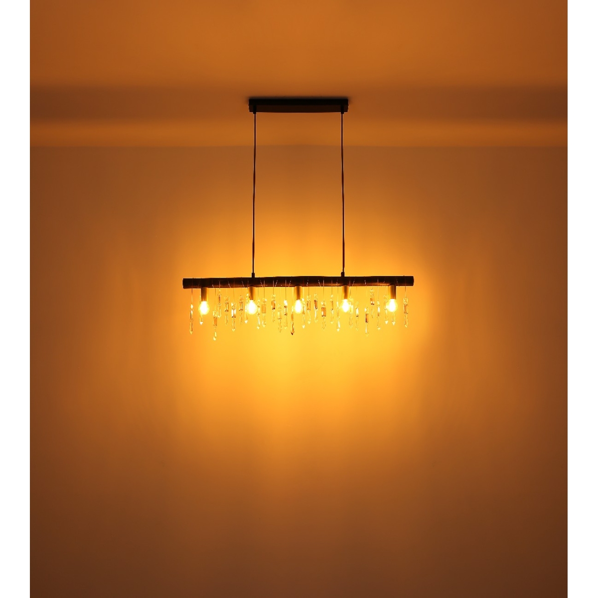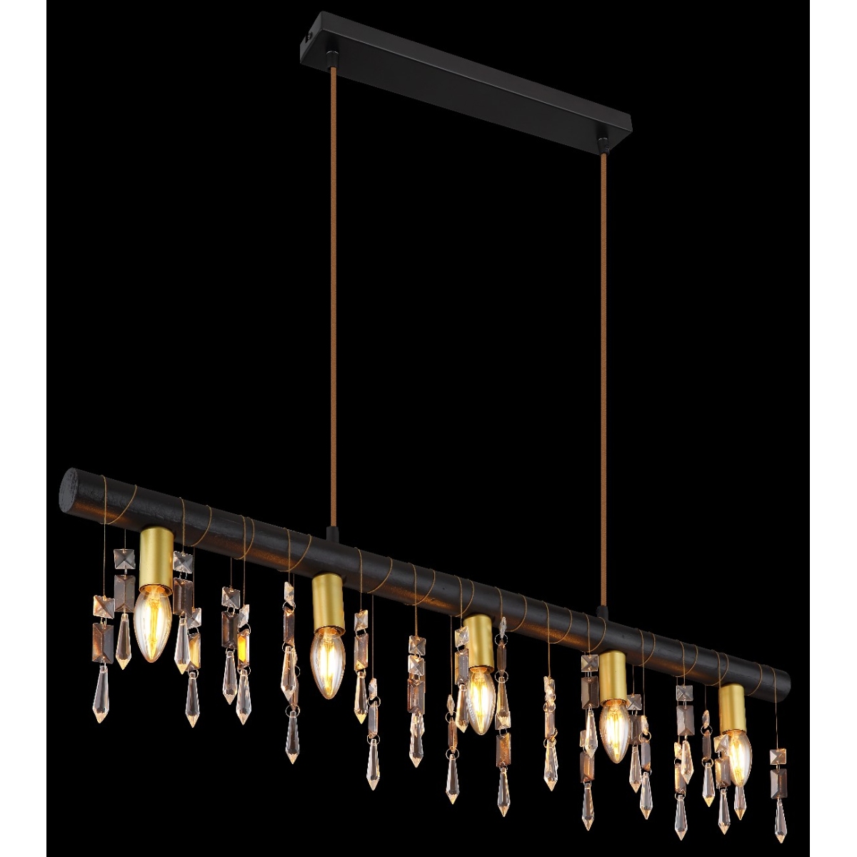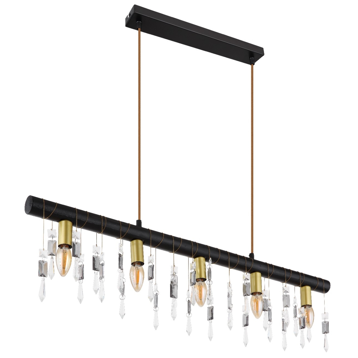 Ova visilica iz serije KIRA I može se divno montirati preko stola zbog svog izduženog oblika, koji potom doživljava jednoobrazno osvetljenje. Visilica dužine 90 cm sastoji se od crne drvene šipke suspendovane sa plafona na dva kabla i opremljena sa pet grla E14 obloženih zlatnim metalom. Mogu biti opremljena odgovarajućim sijalicama po vašem izboru, što vam pruža mogućnost da pojedinačno odredite boju svetla i jačinu. Stakleni kristali koji vise sa šipke takođe doprinose savršeno oblikovanom izgledu lampe. Pored toga, visina lampe može da se podesi i do 120 cm. Uz ostale modele Kira I-serije možete upotpuniti celokupnu sliku u svoja četiri zida i obezbediti udobnu atmosferu.