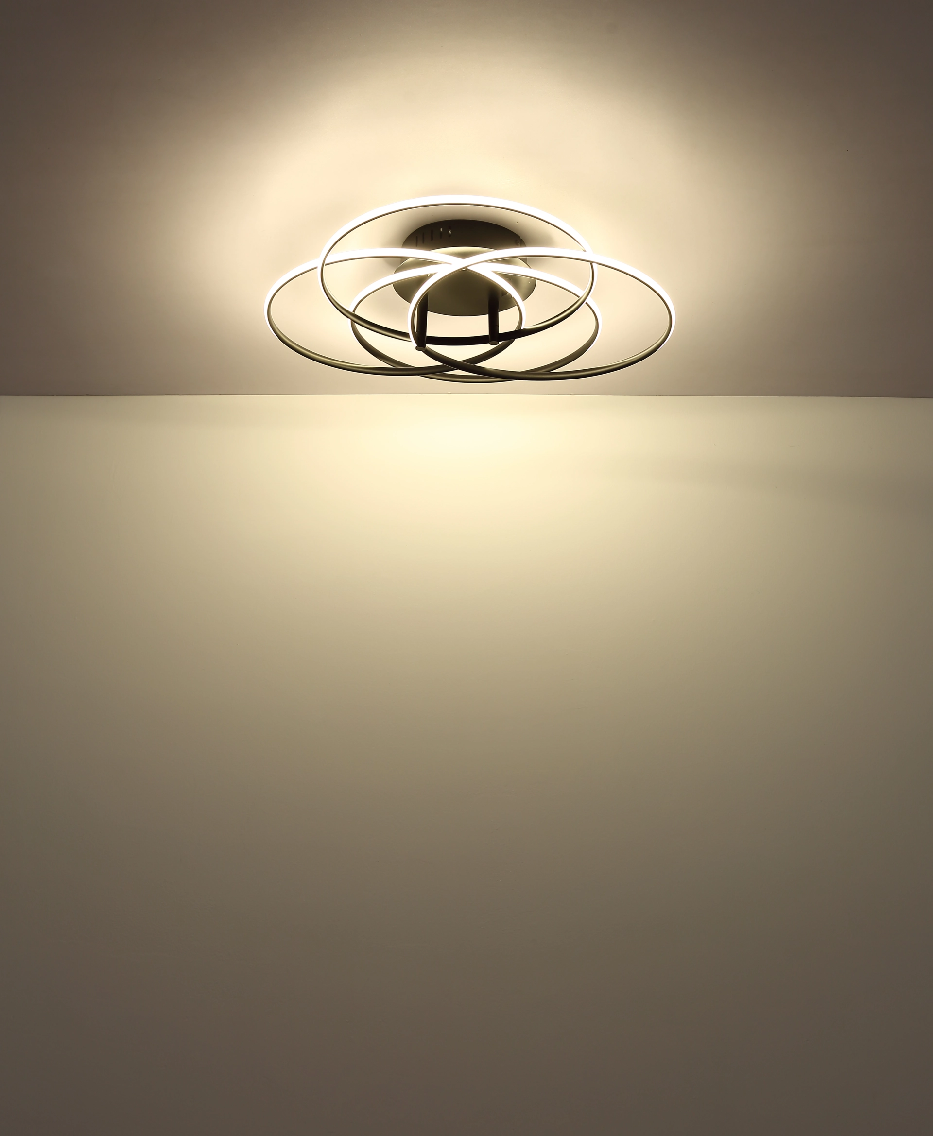 Plafonska lampa KOMBOS impresionira svojim modernim dizajnom, koji raspoređuje četiri prstena jedan iznad drugog. Telo napravljeno od crnog, mat metala i abažur od crnog aluminijuma i opal plastike daju lampi elegantan, savremen izgled. Sa prečnikom od 515 mm, idealna je za veće prostorije kao što su dnevne sobe, trpezarije ili hodnici. Visoka lumenska snaga od 3750 lumena obezbeđuje snažno, ravnomerno osvetljenje, dok temperatura boje od 4000 K obezbeđuje neutralno, prijatno svetlo – savršeno za razne aktivnosti. Plafonska lampa KOMBOS opremljena je LED sijalicama koje štede energiju, koje ne samo da nude dug vek trajanja, već i obezbeđuju efikasno osvetljenje. Ova lampa kombinuje moderan dizajn sa funkcionalnošću i odličan je izbor za stilske i dobro osvetljene prostorije.