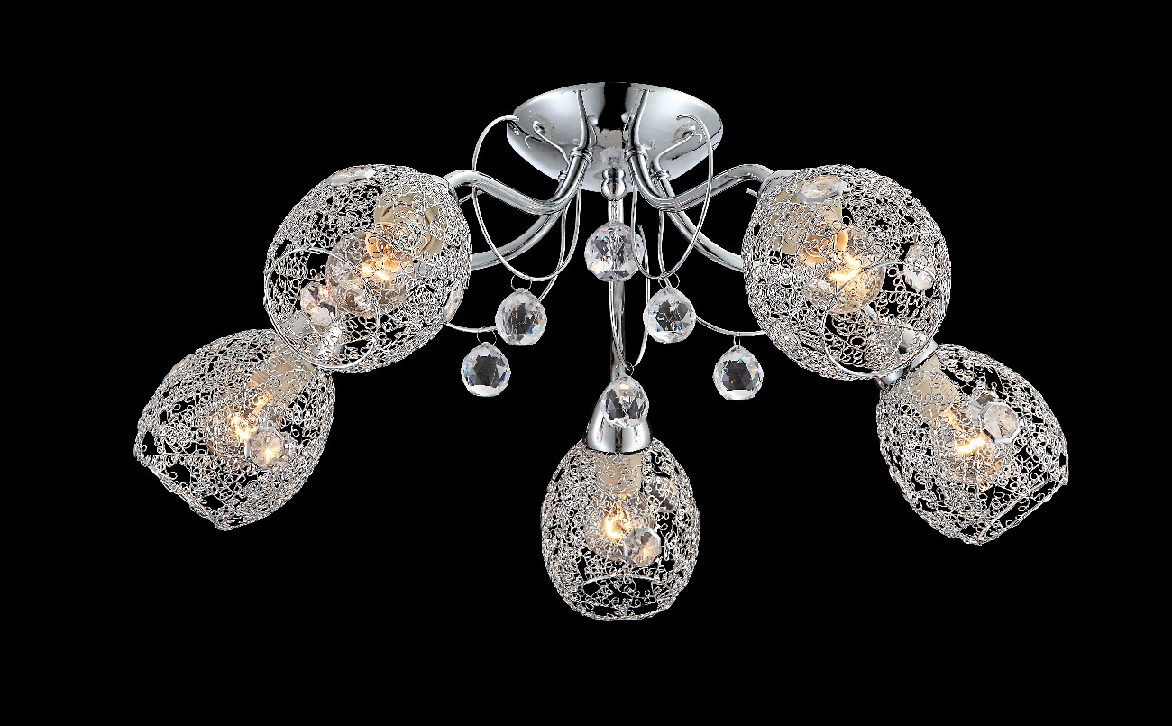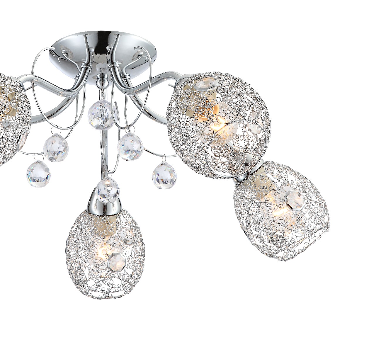 Sa svojim elegantnim dizajnom, ova okrugla plafonska lampa, iz serije Kordula, prečnika 54 cm, privlači pažnju u svakoj prostoriji. Prelep hrom čini osnovu. Pet zakrivljenih krakova imaju reflektore, koji su opremljeni hromiranom pletenicom. Dekorativni akcenti su postavljeni staklenim kristalima i akrilnim kristalnim ukrasima, što ovu lampu čini jedinstvenom po svom izgledu. Pet sijalica za grla E14 mogu se slobodno birati do maksimalne snage od 40 vati. Zbog uštede energije i dugog veka trajanja, preporučujemo LED lampe.