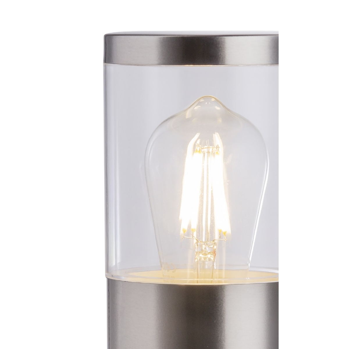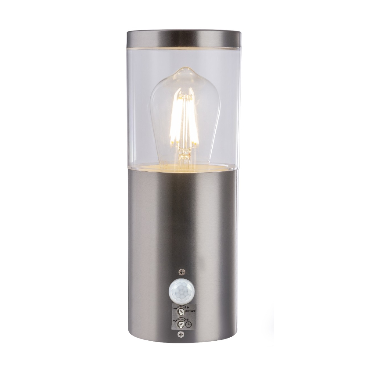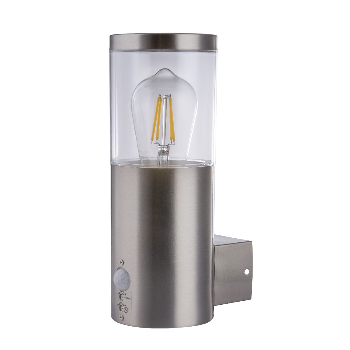 Ovo je skoro 30cm velika klasična zidna spoljna lampa od nerđajućeg čelika sa providnim plastičnim staklom. Funkcija ugrđenog detektora pokreta upotpunjuje (domet 2-8 metara) ovu vanvremensku spoljnu lampu. U zavisnosti od vaših želja, posebno svetlo može ispratiti letnje večeri na vašoj terasi (IP44) pomoću filament sijalica (E27, max.60W). U suprotnom, preporučili bismo LED sijalice zbog njihove uštede energije i dugovečnosti. Uz ostale svetiljke ove serije možete upotpuniti sliku na otvorenom prostoru.