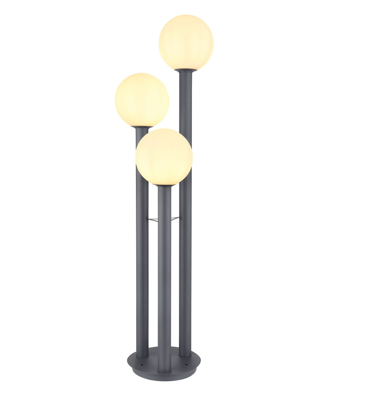 Ova spoljašnja lampa (ø 45 cm) impresionira svojim elegantnim dizajnom napravljenim od nerđajućeg čelika u boji antracita i aluminijuma livenog pod pritiskom. Lampa na otvorenom veličine 160 cm sastoji se od okrugle podloge na koju su fiksirane tri grane različitih veličina. One imaju tri opalne staklene sfere, koje sadrže E27 grla. One mogu biti opremljene odgovarajućim LED sijalicama po vašem izboru, što vam omogućava da pojedinačno odredite laganu boju i jačinu. Kroz nekoliko artikala iste serije možete da kreirate udobnu atmosferu u svom otvorenom prostoru i upotpunite celokupnu sliku.