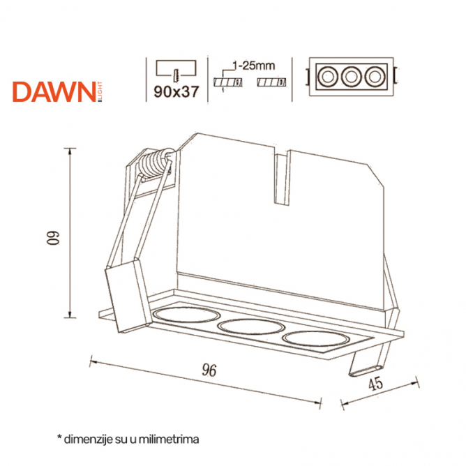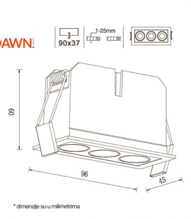 Ugradna LED svetiljka bele boje. Poseduje dva spot svetla koja emituju toplo belu svetlost ukupne snage 9w.