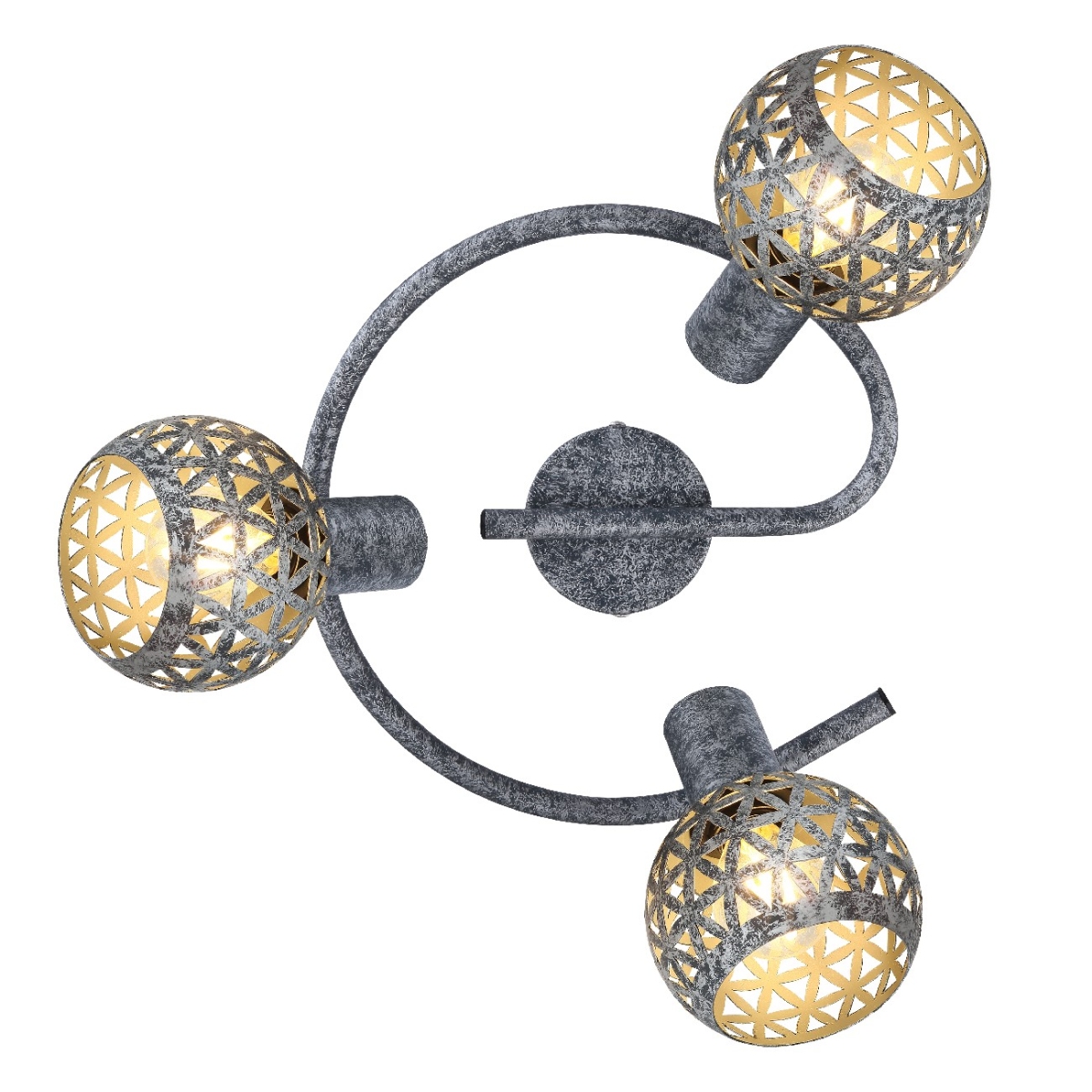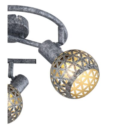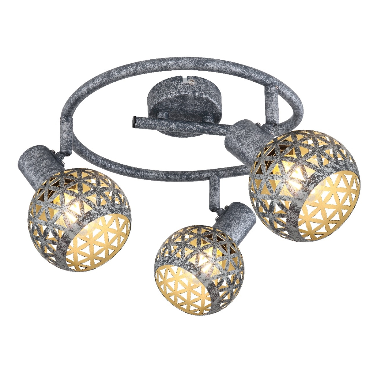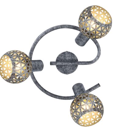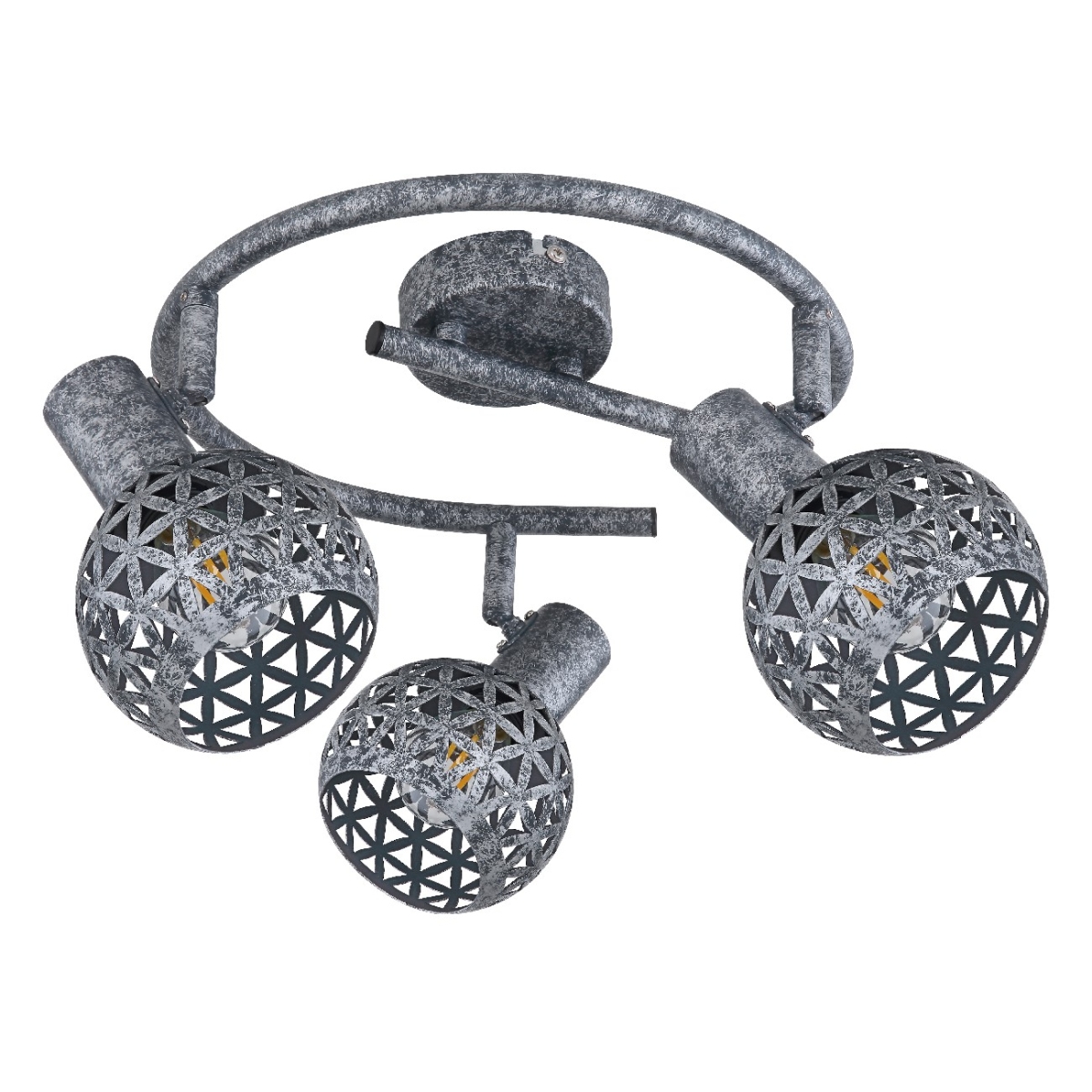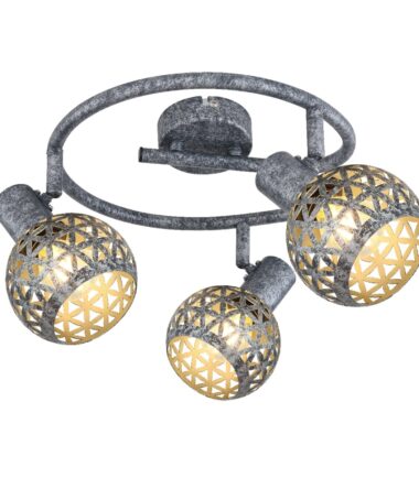 Ovaj plafonski reflektor iz serije LELA (ø 26 cm) ističe se svojim prelepim dizajnom napravljenim od starinskog sivog metala. Sastoji se od spiralno zakrivljene metalne grane na kojoj su raspoređena tri E27 grla, koja su obezbeđena prelepo zakrivljenim metalnim abažurima sa trouglastim prorezima. Ona mogu biti opremljena odgovarajućim lampama po vašem izboru, što vam pruža mogućnost da pojedinačno odredite boju svetla i jačinu. Sa ostalim modelima iste serije možete upotpuniti celokupnu sliku u svom enterijeru i napraviti elegantan ambijent.