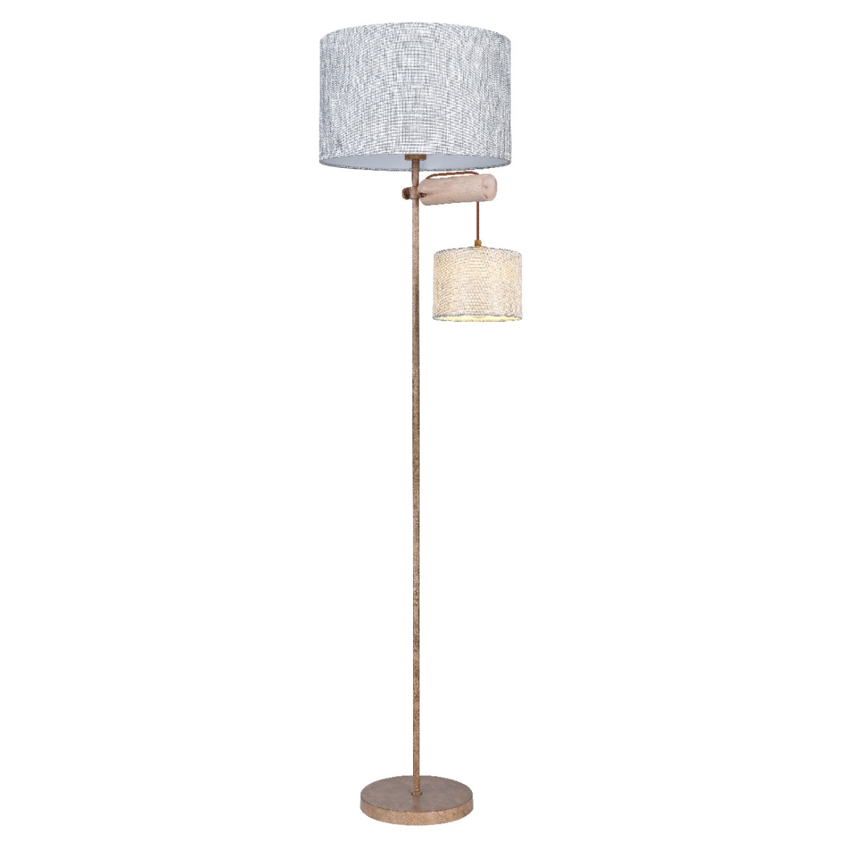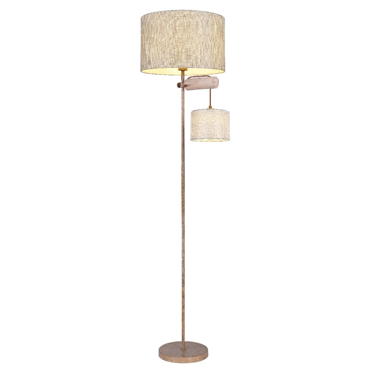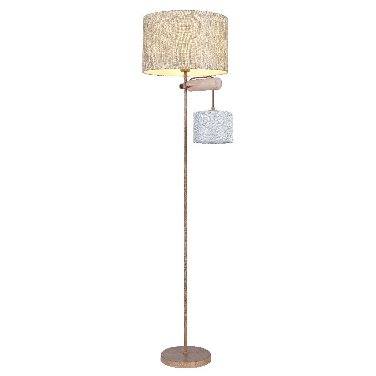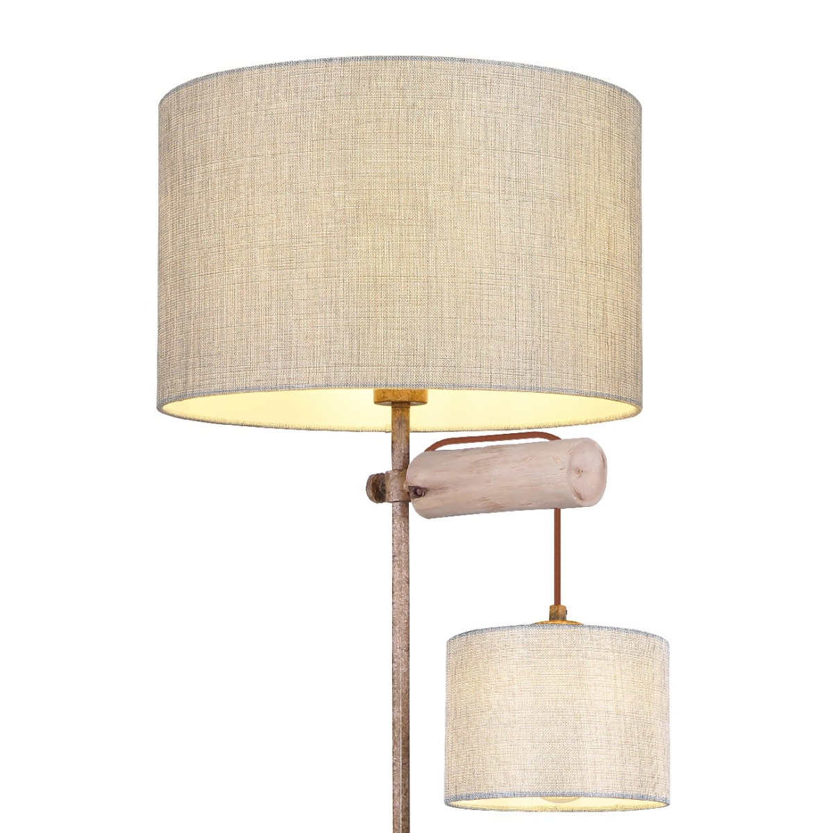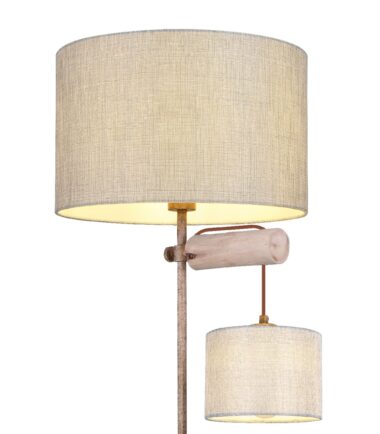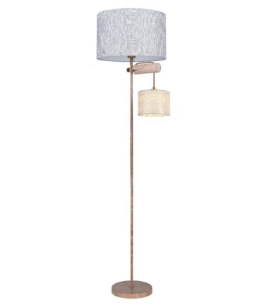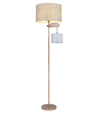 Ova elegantna podna lampa, visine 165 cm sastoji se od okrugle metalne baze boje rđe, koja obezbeđuje divnu stabilnost i na koju je fiksirana metalna šipka u boji rđe, a na sebi ima divne tekstilne abažure. Ispod velikog abažura je drvena šipka na kojoj visi još jedan, manji tekstilni abažur. Dva E27 grla unutar abažura mogu biti opremljena odgovarajućim sijalicama po vašem izboru, što vam pruža mogućnost da u skladu sa svojim idejama odredite boju svetla i jačinu. Pored toga, podna lampa je opremljena integrisanim prekidačem sa kojim možete posebno uključiti i isključiti obe sijalice. Pomoću ove podne lampe možete postaviti elegantne akcente u svoja četiri zida i upotpuniti celokupnu sliku.