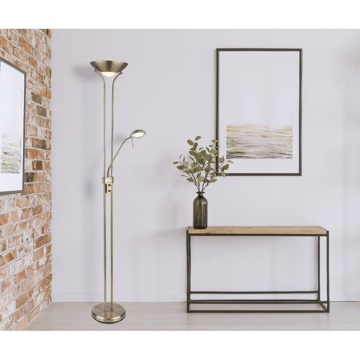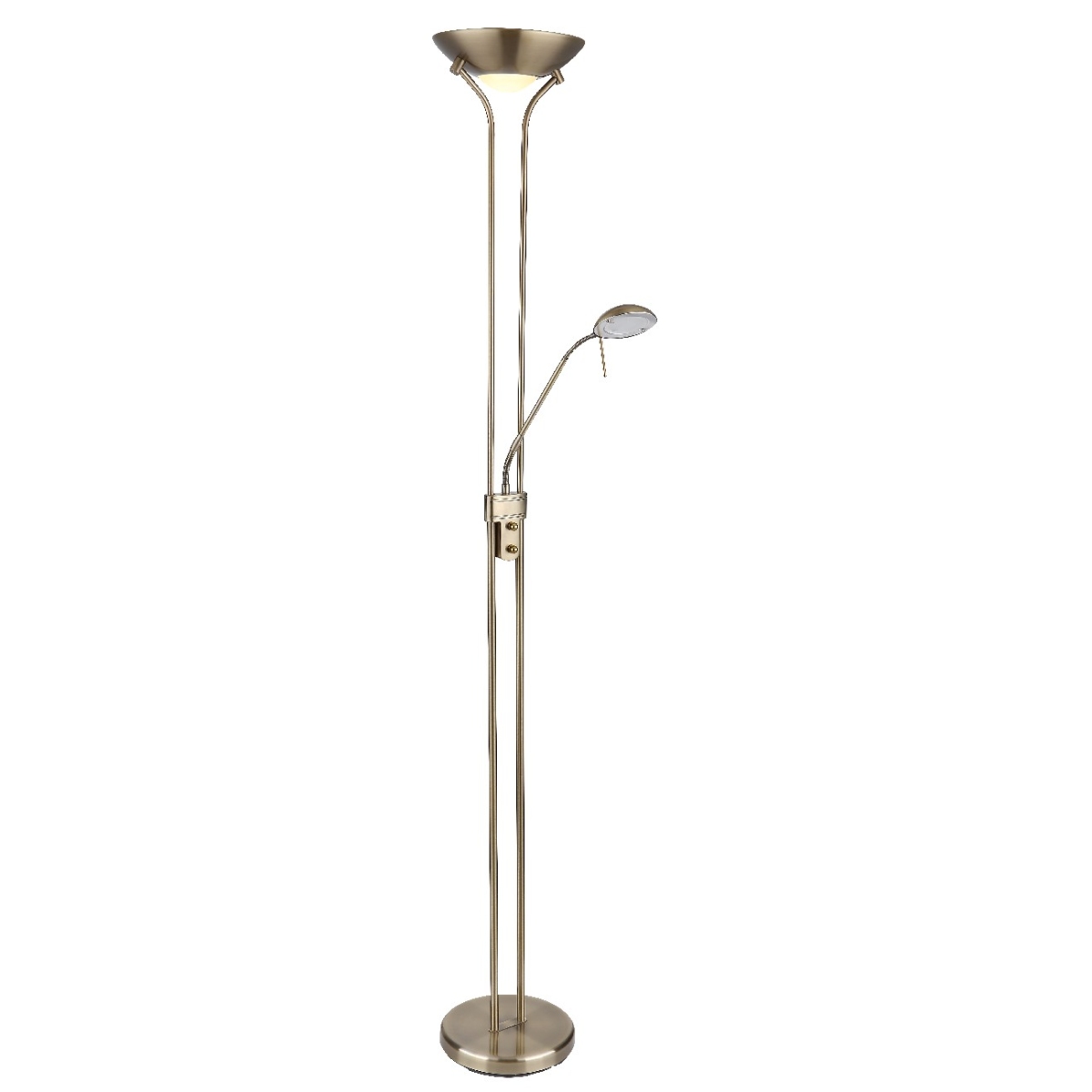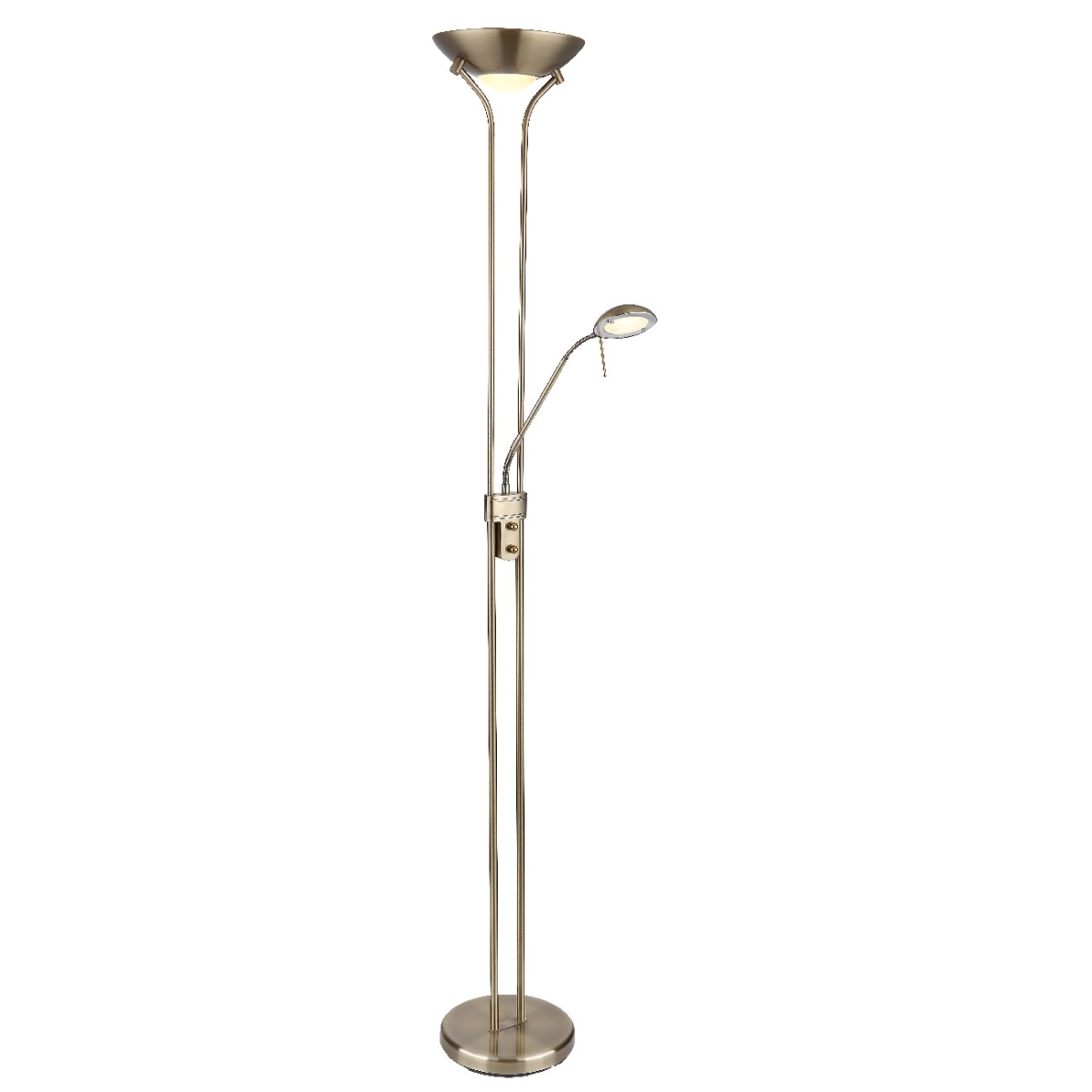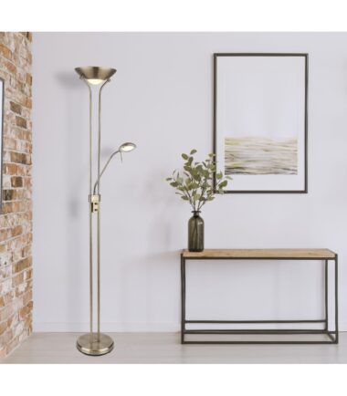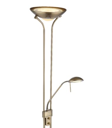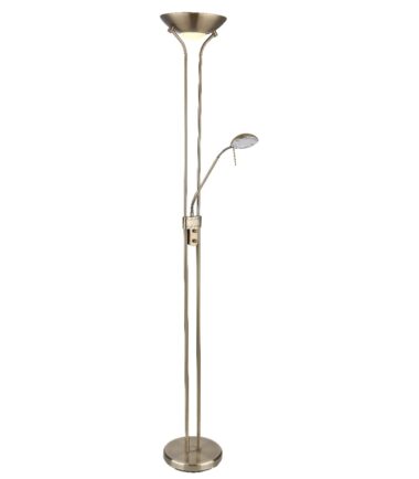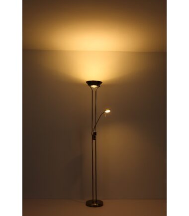 Ova podna lampa iz serije LEONAS (ø 25,5 cm) impresionira svojim jednostavnim dizajnom napravljenim od starog mesinganog metala. 180 cm visoka lampa sa mogućnošću zatamnjivanja sastoji se od dve metalne šipke fiksirane za okruglu bazu. Na vrhu ima okrugli metalni komad sa staklom, koji pokriva uključene LED sijalice. One obezbeđuju 1440 lumena svetlosti sa svetlom bojom od 3000 Kelvina (topla bela). Pored toga, pokretno svetlo za čitanje služi kao korisna karakteristika, sa kojom možete stvoriti udoban ambijent u svom enterijeru.