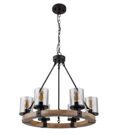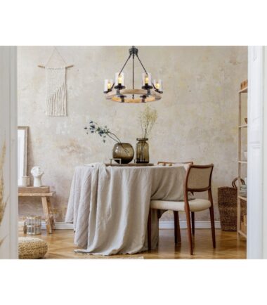 Ova prelepa visilica inspiriše sjajnim, staromodnim dizajnom. Od okruglog plafonskog nosača nastavlja se se lanac do tri crna kabla koji nose okrugli drveni okvir (Ø59cm). Na drvenom okviru se nalazi 8 E27 grla, od kojih svako ima staklenu kuglu u boji dima cilindričnog oblika. Zbog slobodnog izbora izvora svetlosti, možete sami odrediti boju svetla i jačinu do maksimalnog izlaza od 60 vati. Postavite nove akcente u svojim prostorijama.