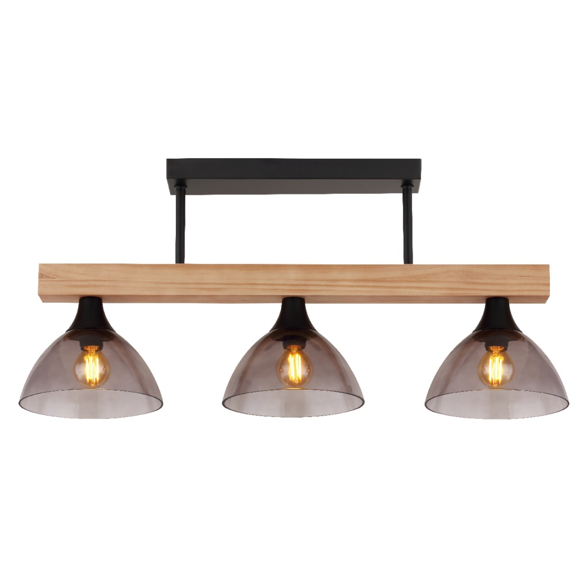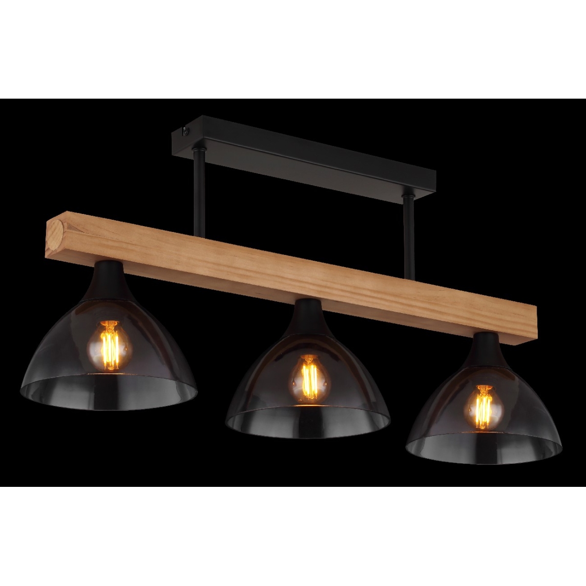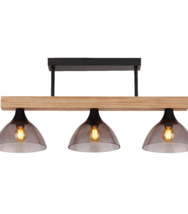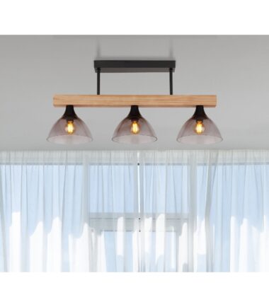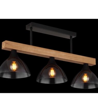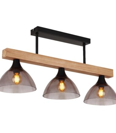 Ova sjajna visilica LINDI serije impresionira svojim elegantnim dizajnom. Od pravougaonog crnog plafonskog nosača, dve crne mat metalne šipke se nastavljaju do drvene grede dužine 65 cm. Na njoj se nalase tri E27 grla i svako sa oblikovanim staklenim abažurom u boji dima. E27 grla vam omogućavaju da sami odredite boju svetla i jačinu do maksimalnog izlaza od 15 vati. Zbog dugovečnosti i uštede energije preporučujemo LED sijalice.