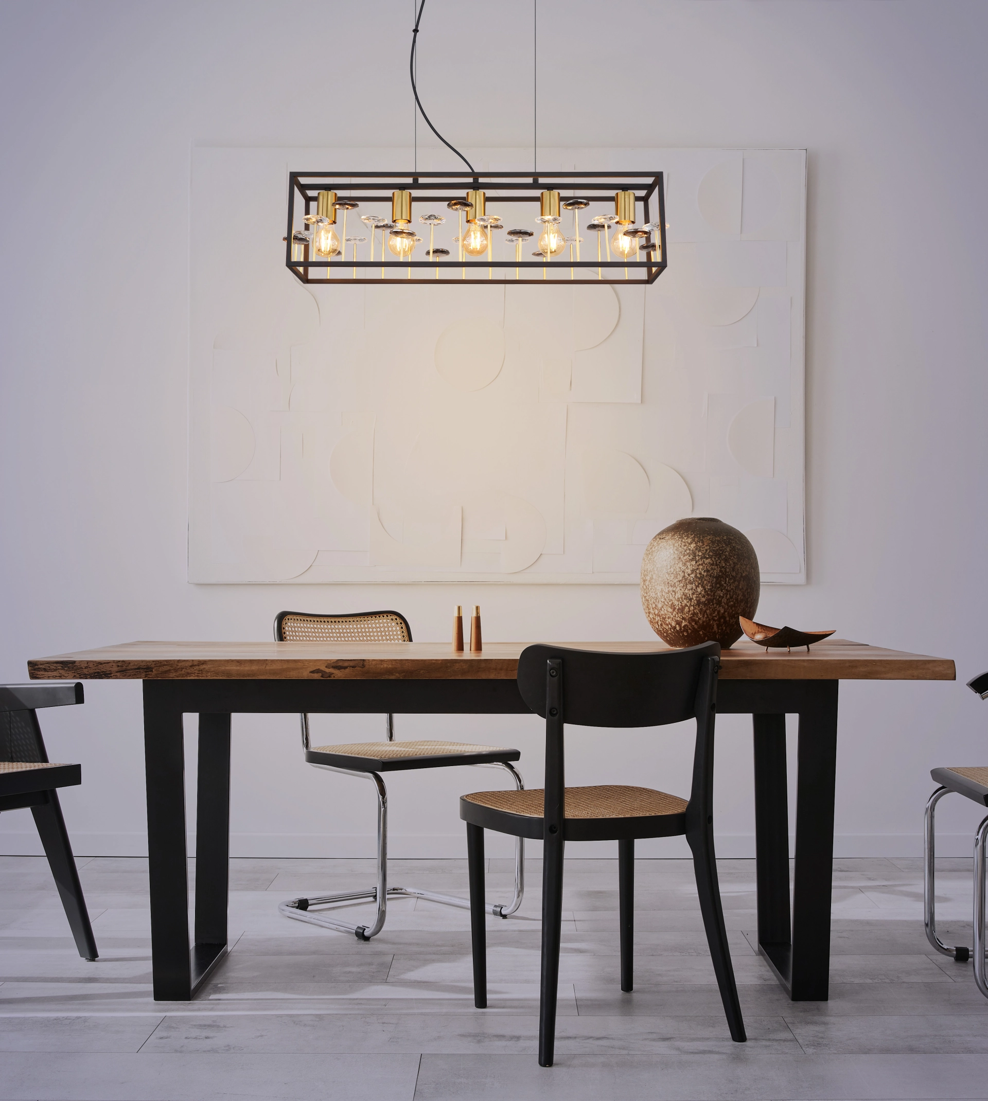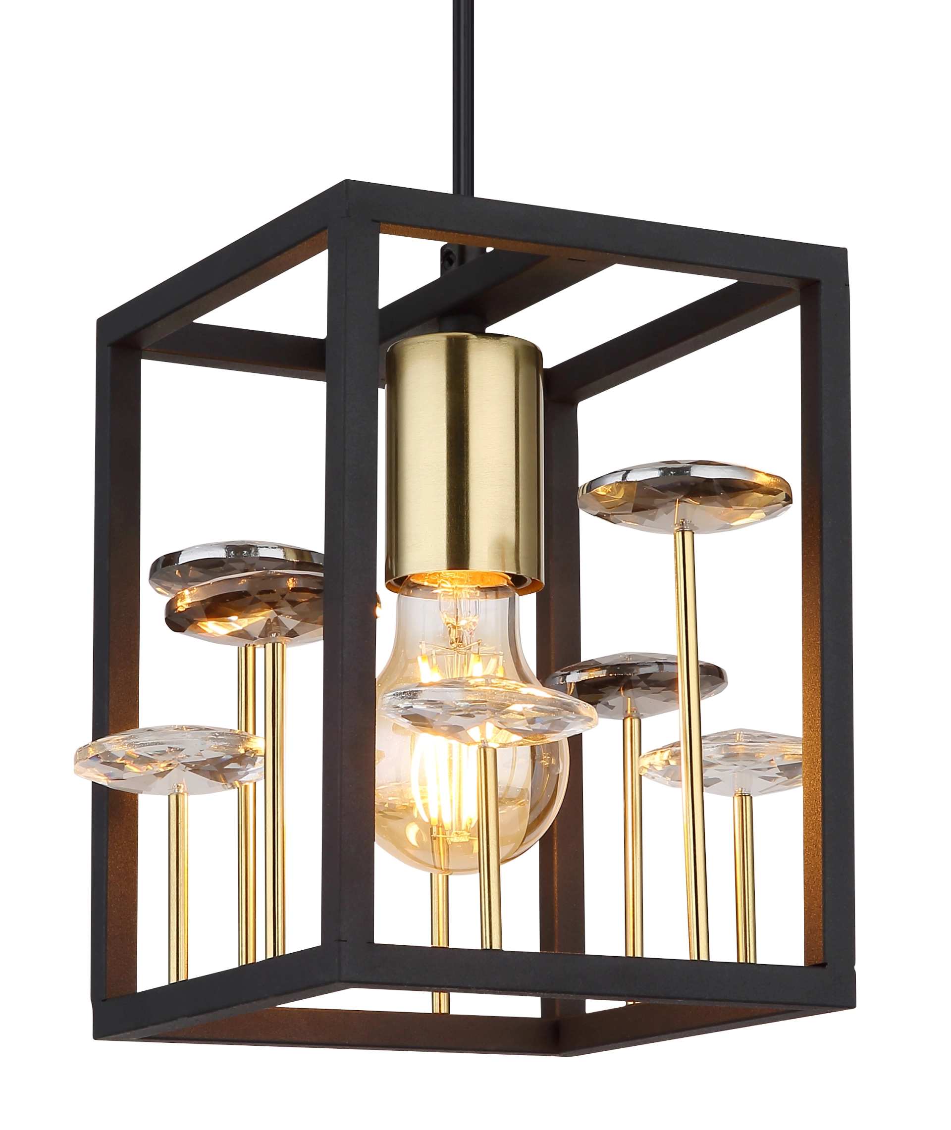 Uronite u svet vintage stila uz ovu zapanjujuću kvadratnu viseću lampu. Crna mat metalna kocka i zlatni abažur dodaju bezvremensku eleganciju svakoj prostoriji. Unutar kocke nalaze se providni stakleni kristali i dimljeni K9 kristali koji pružaju glamurozno osvetljenje. Viseća lampa ima E27 grlo, koje pruža dovoljnu osvetljenost. Sa dužinom i širinom od po 150 mm, ispunjava prostoriju toplim, prijatnim svetlom. Crno metalno kućište je čvrsto i izdržljivo. Pored toga što je funkcionalna, ova viseća lampa je pravi dragulj koji će svakoj prostoriji dodati luksuznu atmosferu.