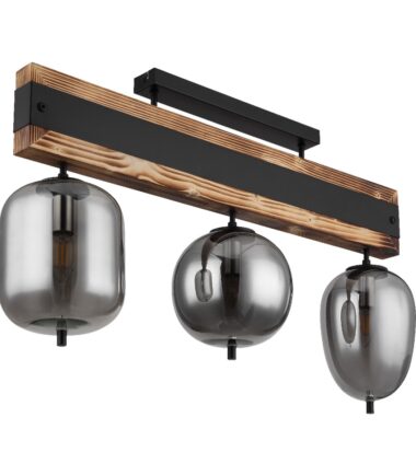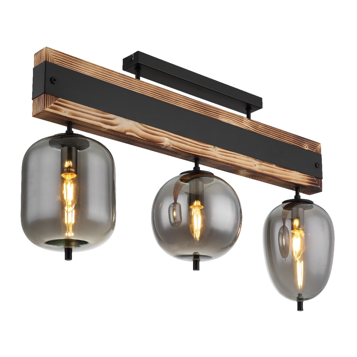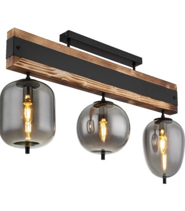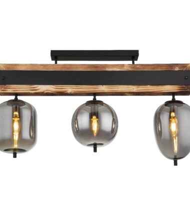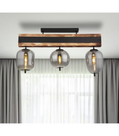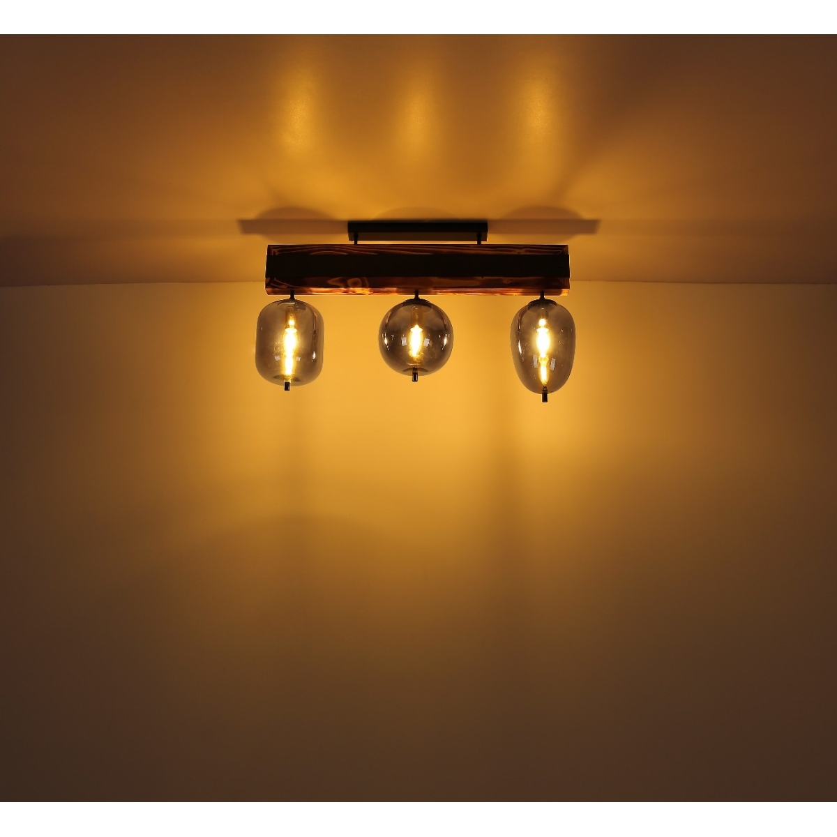 Ova moderna plafonska lampa inspiriše sjajnim dizajnom. Na pravougaonom plfonskim nosaču je oblikovana drvena greda dužine 77.5 cm na kojoj se nalaze tri grla E14, svako sa staklom u boji dima različitog oblika. Grlo E14 vam omogućava da sami odaberete sijalicu do maksimalne snage od 40W, samim tim odredite boju svetla i jačinu. Zbog dugovečnosti i ušede energije preporučujmo LED sijalice.