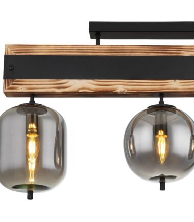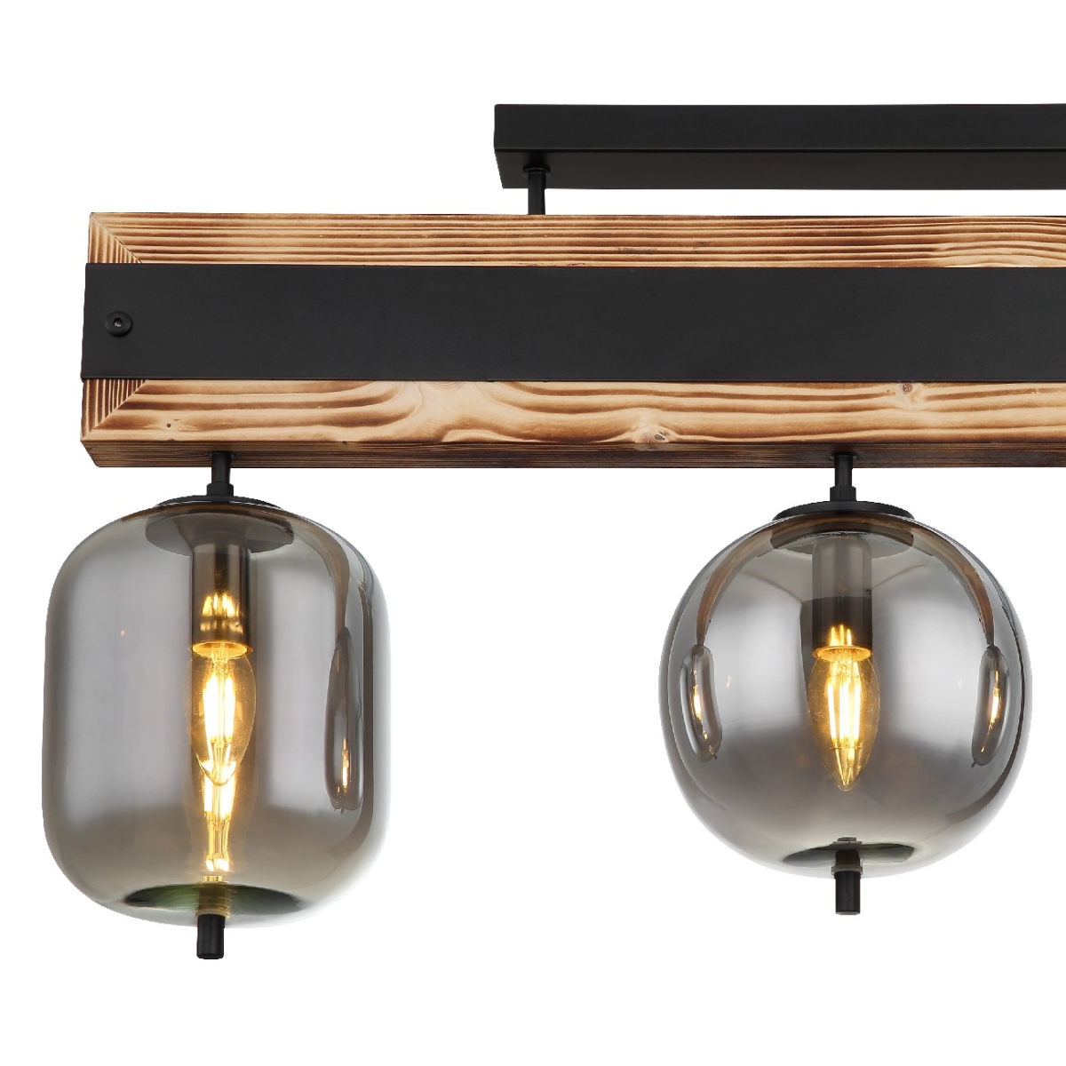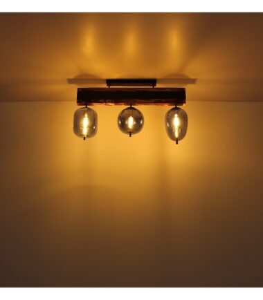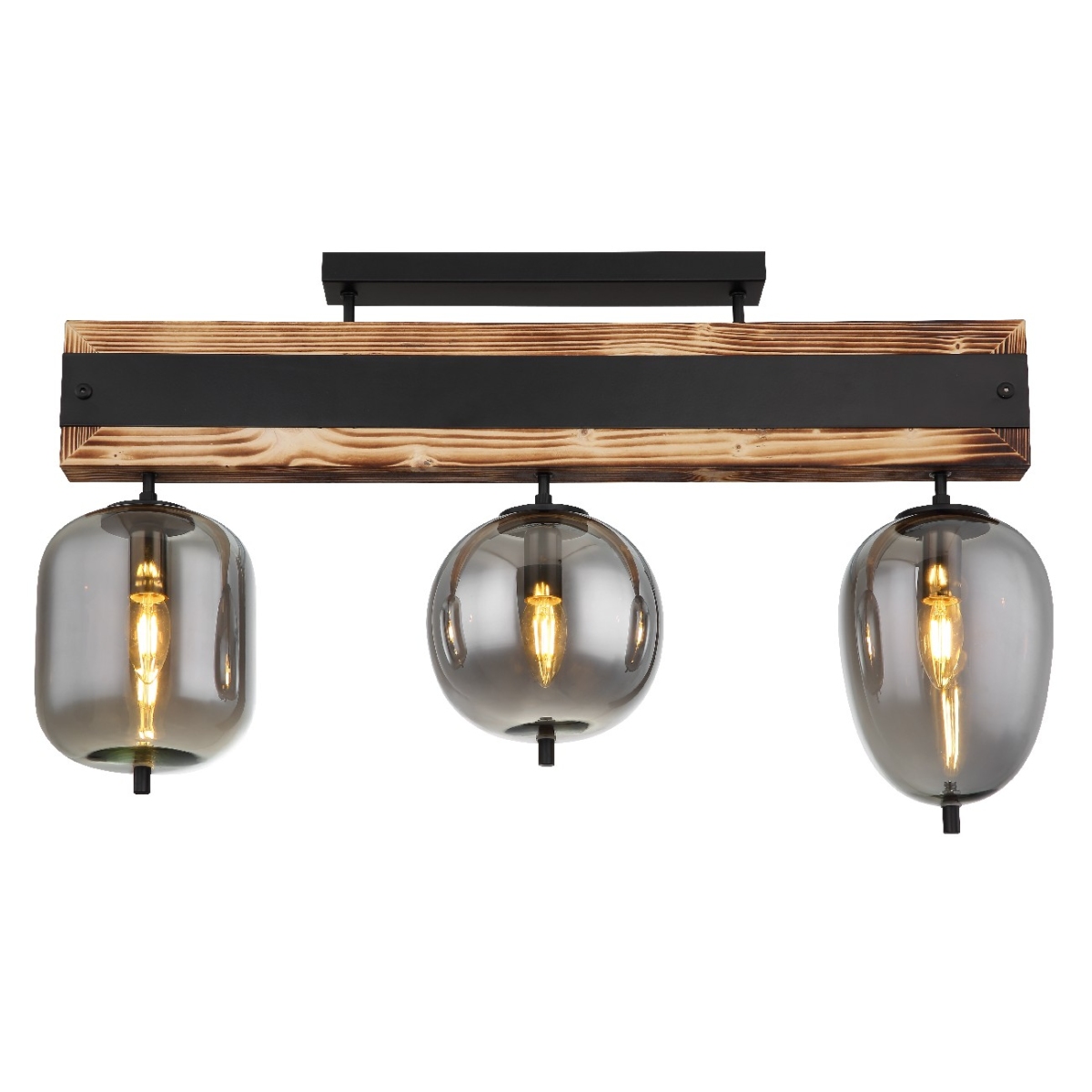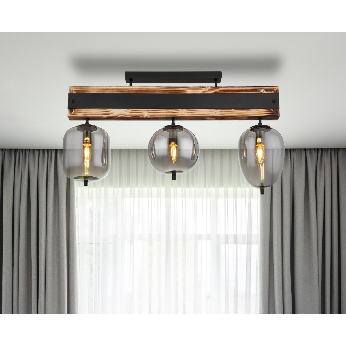 Ova moderna plafonska lampa inspiriše sjajnim dizajnom. Na pravougaonom plfonskim nosaču je oblikovana drvena greda dužine 77.5 cm na kojoj se nalaze tri grla E14, svako sa staklom u boji dima različitog oblika. Grlo E14 vam omogućava da sami odaberete sijalicu do maksimalne snage od 40W, samim tim odredite boju svetla i jačinu. Zbog dugovečnosti i ušede energije preporučujmo LED sijalice.
