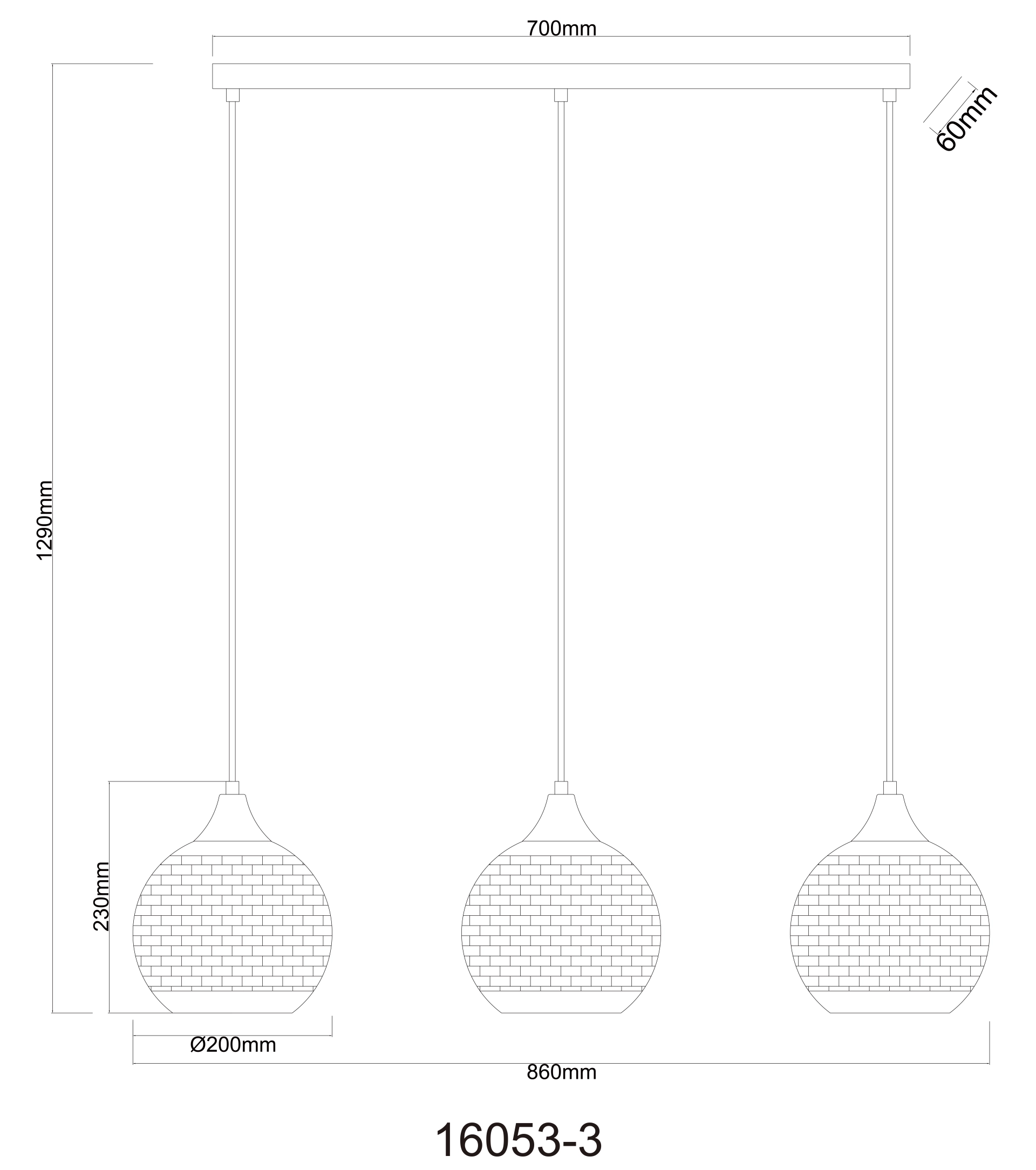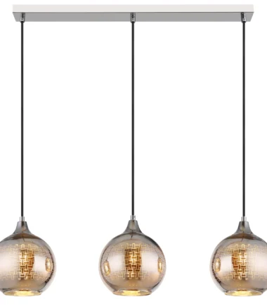 Viseća lampa LOURDES sa tri sfere i kariranim dekorom je stilski izbor za moderne životne prostore. Sa dužinom od 860 mm i širinom od 200 mm, pruža atraktivno osvetljenje. Belo metalno kućište se savršeno usklađuje sa hromiranim staklenim kuglicama. Ova viseća lampa je idealna za trpezarije i kuhinje, gde deluje i kao izvor svetlosti i kao dekorativni element. Kombinacija dizajna i funkcionalnosti čini je privlačnom za pogled u vašem domu.