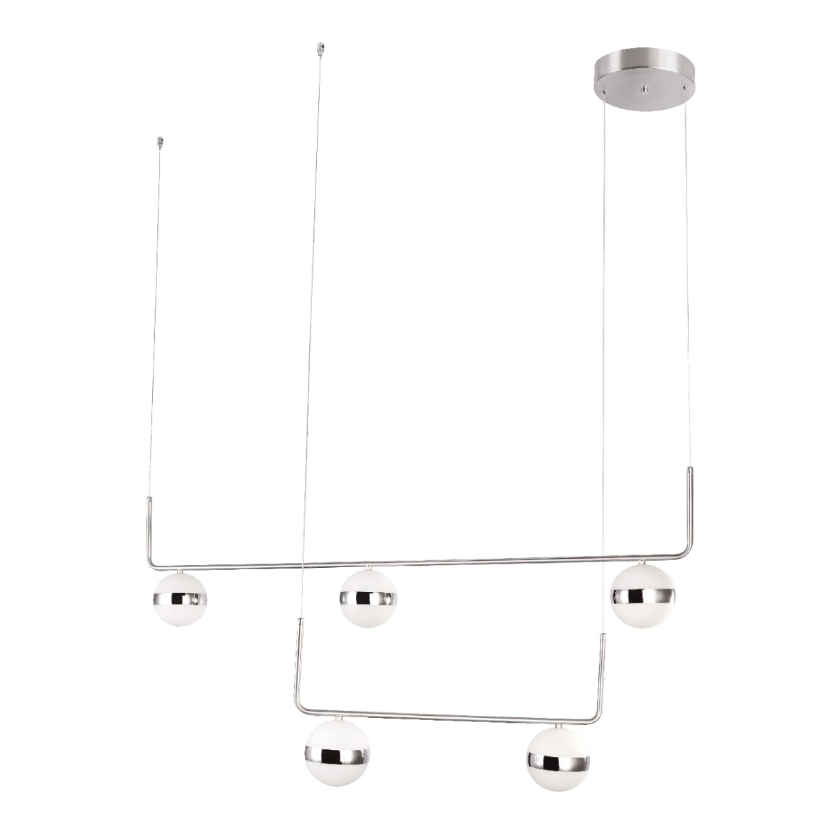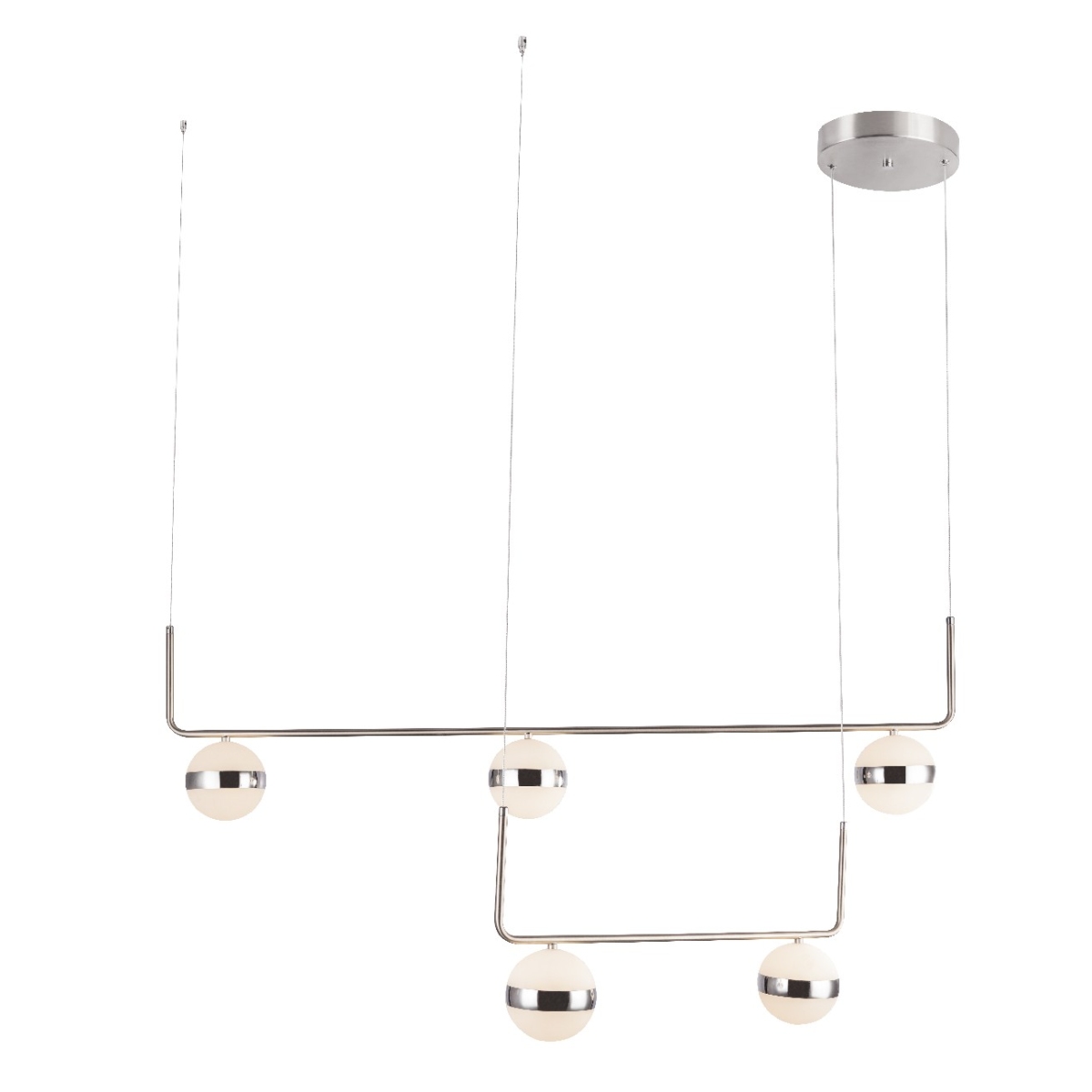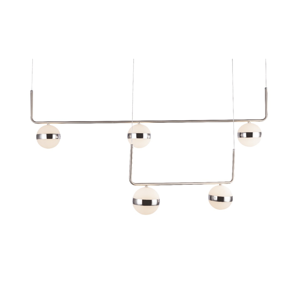 Ova elegantna visilica LOVEST napravljena od nikla impresionira svojim oblikom. Pet okruglih staklenih kugli, zakačenih za konopce i grane na dve različite visine, vraćaju svetlost u vaš dnevni boravak. Opalna stakla su obložena uskim hromiranim prstenom. Ovo unutrašnje svetlo pruža 3000 lumena jake svetlosti. Uključena LED sijalica (40W) obećava uštedu energije. Ova visilica unosi udobno toplo-belo svetlo od 3000K u sobu. Sa ostalim modelima ove serije, ništa ne stoji na putu vašem individualnom dizajnu životnog prostora.
