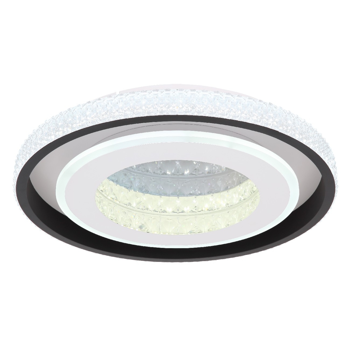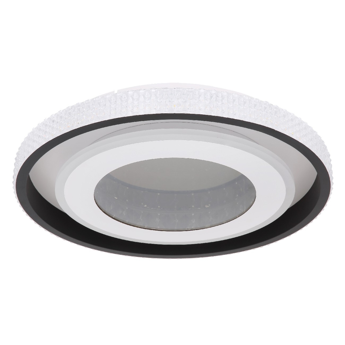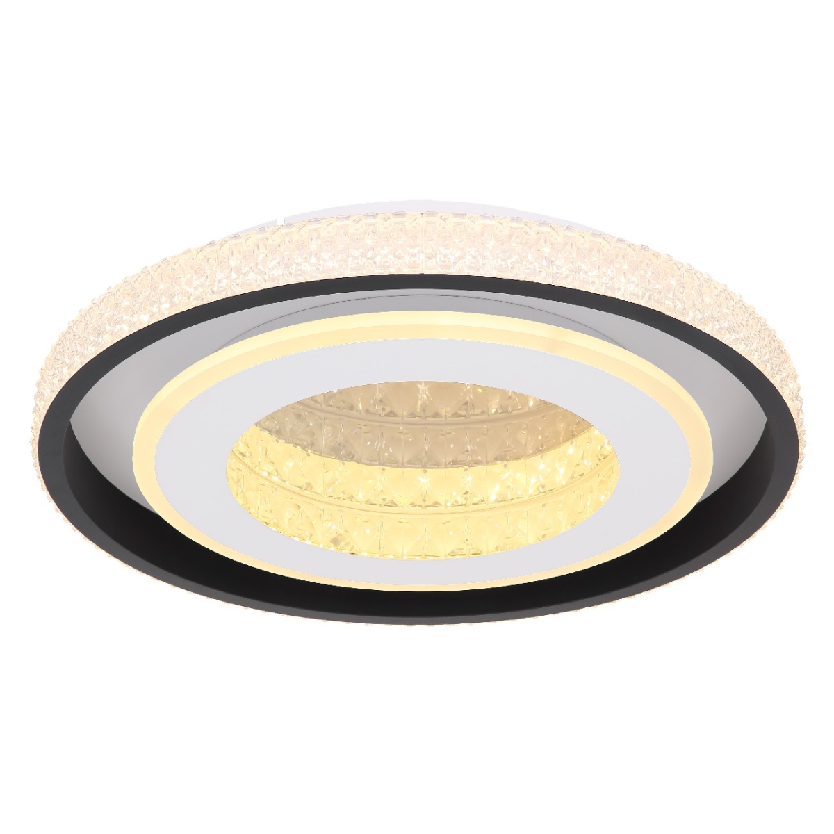 Ova prelepa plafonska lampa serije LUCKY ima impresivan dizajn i mnoštvo funkcija. Okrugli crni metalni abažur sa sklopljenim akrilnim kristalima formira prečnik od 50cm. LED sijalica u obliku prstena divno uklapa unutar lampe i naglašava akrilne kristale. Daljinskim upravljačem možete pojedinačno podesiti svetlo od toplo bele 2700K do 6500K hladno bele svetlosti i takođe ima funkciju memorije, noćni režim i može se zatamniti ili fiksirati.