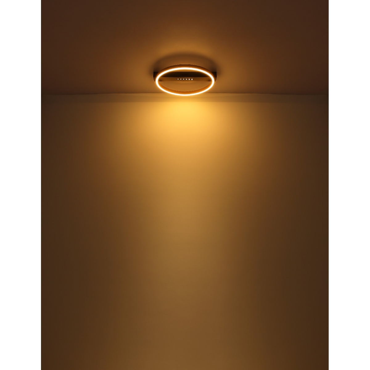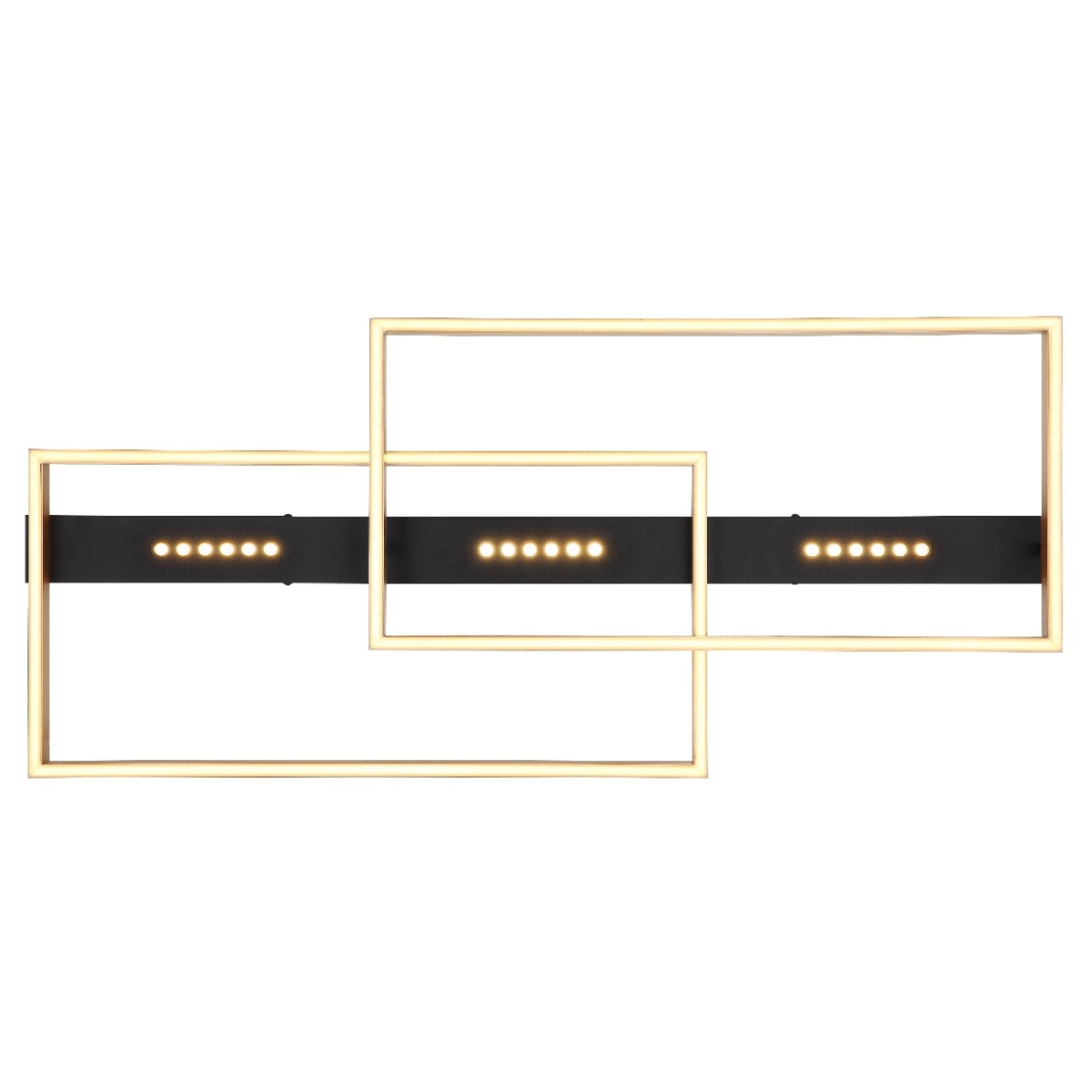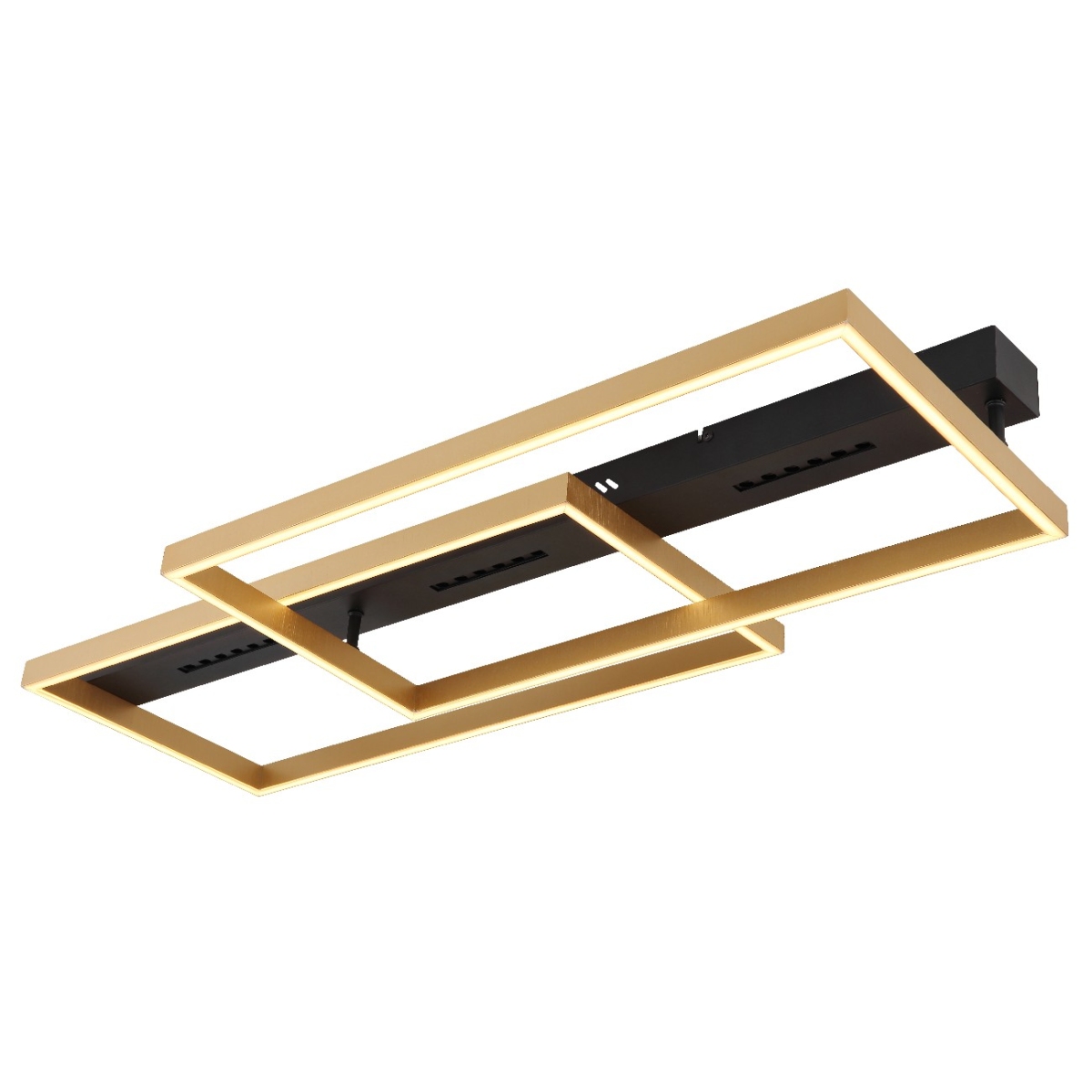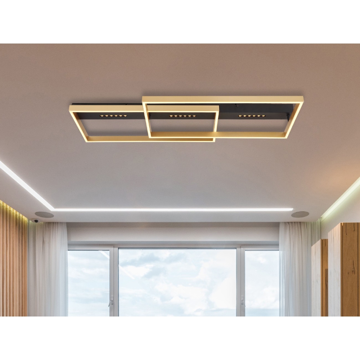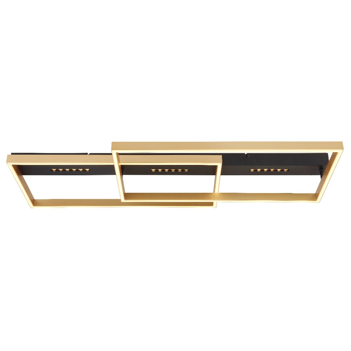 Ova moderna plafonska lampa impresionira odličnim dizajnom. Na 90 cm dugačkoj crno mat plafonskoj osnovi postoji dva pravougaona LED panela zlatne boje koji emituju toplo belu svetlost od 3000 Kelvina i tako pružaju prijatnu atmosferu.