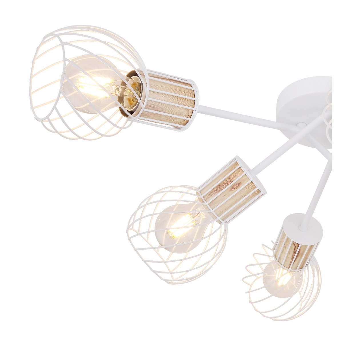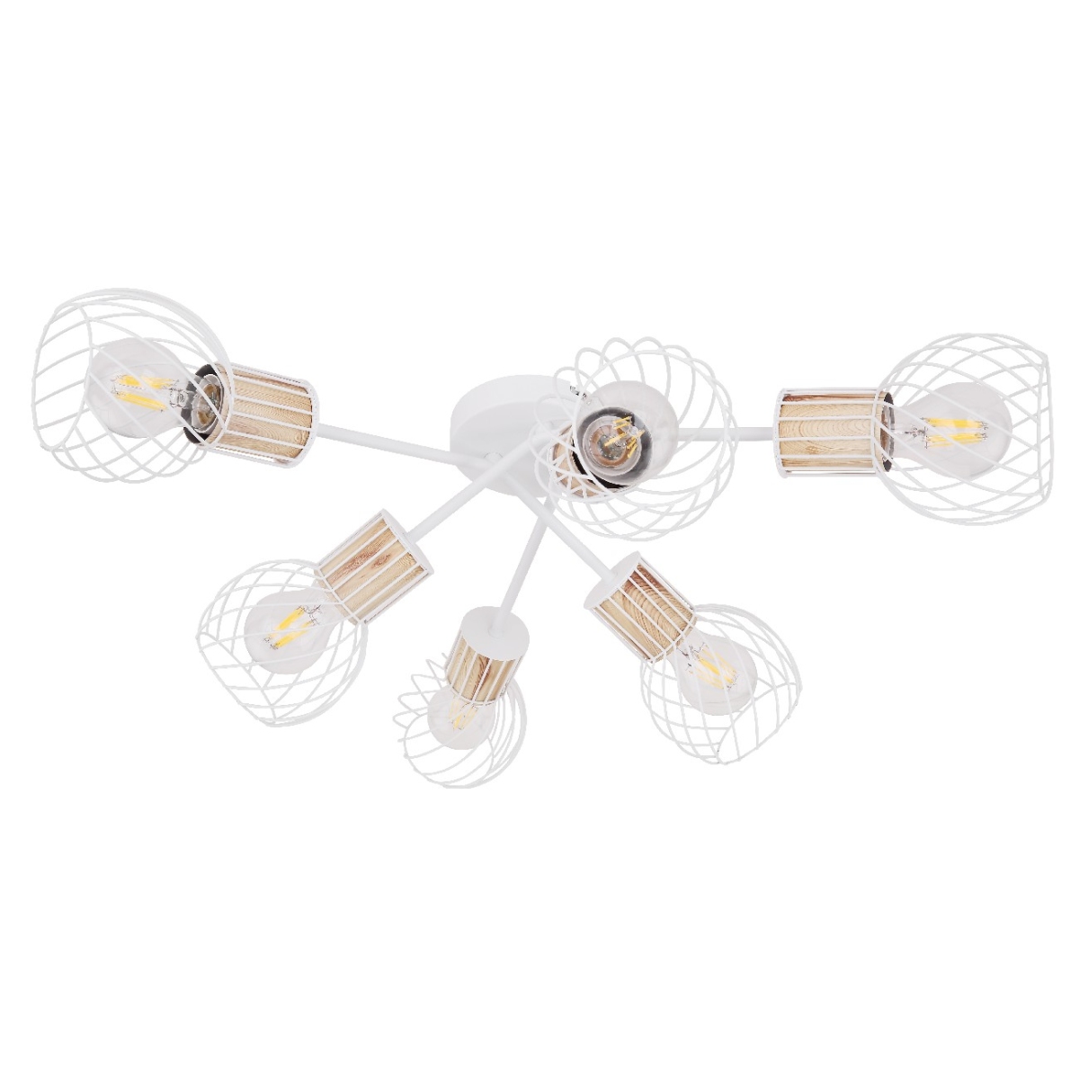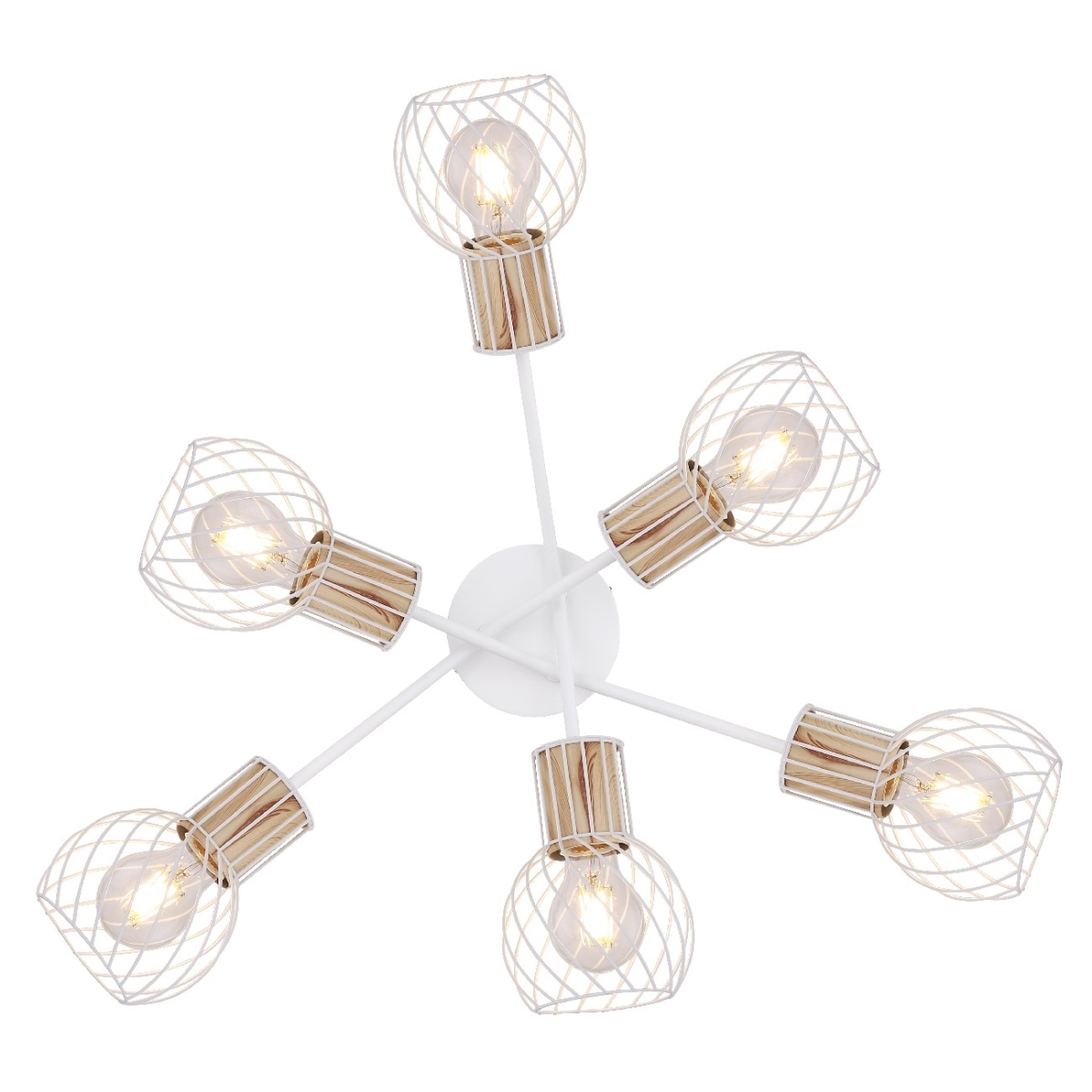 Plafonska lampa (Ø70cm) serije LUISE impresionira kombinacijom modernih elemenata i retro izgleda. Artikl je belo-drvenog dizajna, abažur se sastoji od zakrivljene žičane mreže. 6 ugrađenih E27 grla dizajnirano je do maksimalnih 40W i omogućavaju i zatamnjive i nezatamnjive sijalice, kao i zmenu sijalica.