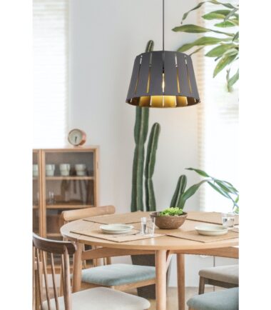 Jednostavna, ali moderna, ovo je moto ove visilica serije LUNA. Prelepi dekorativni abažur (Ø35cm) u mat crnoj boji prekriva grlo E27, koje visi na crnom užetu sa dodatnim delom nalik drvetu 1,2m od plafona. Grlo E27 vam omogućava da slobodno odaberete sijalicu do maksimalne snage od 40 vati.