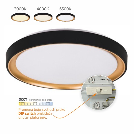 3 Boje svetlosti. Promena boje svetlosti preko DIP switch prekidača unutar plafonjere.