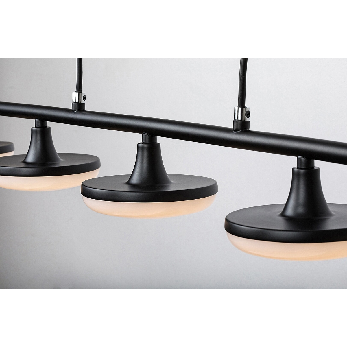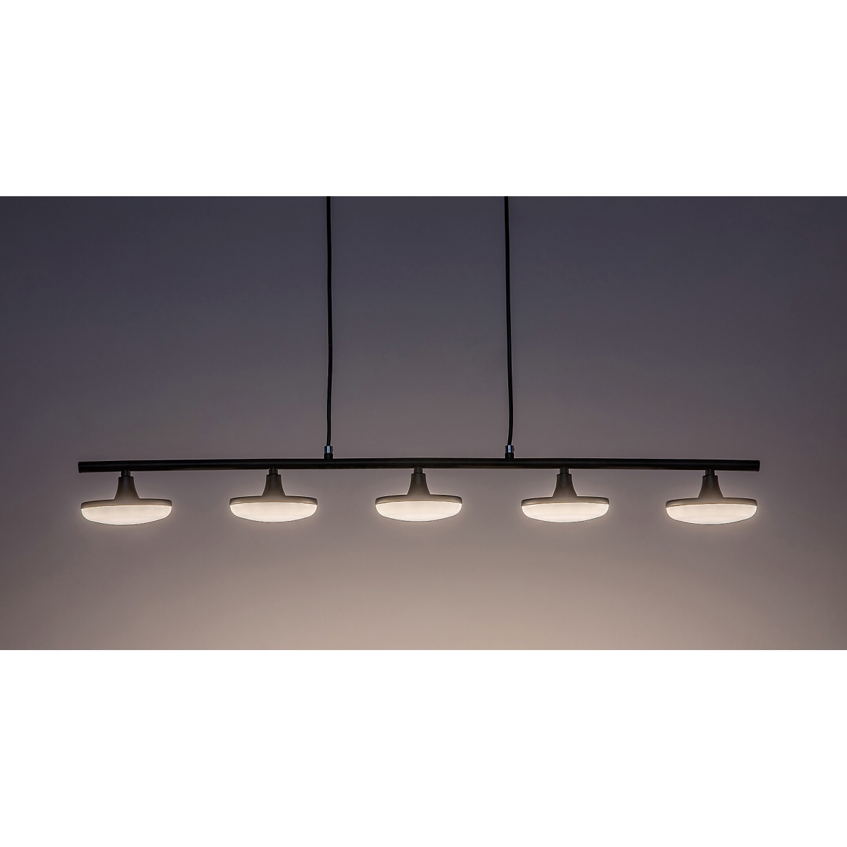 Sa svojim značajnim svetlosnim tokom i estetskim izgledom, moderan Madi privezak sa 5 sijalica je odličan izbor za prostraniji dnevni boravak ili trpezariju. Mat crni metalni element upotpunjen je belim plastičnim abažurima, a lampa se može pričvrstiti na plafon uz pomoć izdužene, zaobljene dekorativne osnove. Pet okruglih, pločastih glava lampi postavljene su jedna pored druge u nizu na horizontalnoj traci pričvršćenoj za kabl. Kako su glave lampi fleksibilne, njihova svetlost se može usmeravati u prostoriju po želji. Madi ima ugrađene LED izvore svetlosti energetske klase F snage 20 V, svetlosnog toka od 1.850 lumena sa senkom i 2.500 lumena bez senke, i životnog veka od 30.000 sati. Temperatura boje izvora svetlosti je 3.000 K i zrače toplo belo svetlo koje vam pomaže da stvorite ugodnu, intimnu atmosferu i opuštajuće za vaše oči. Dimenzije Madi priveska sa 5 sijalica su sledeće: širina 920 mm, rastojanje od plafona može se podesiti između 800–1.500 mm, prečnik svakog abažura 120 mm.