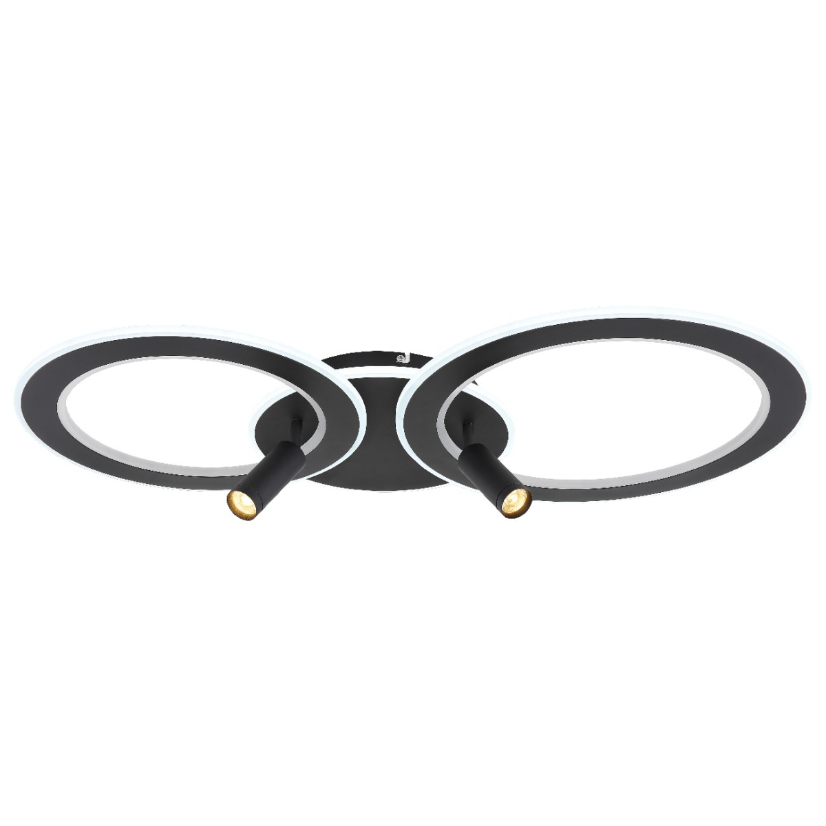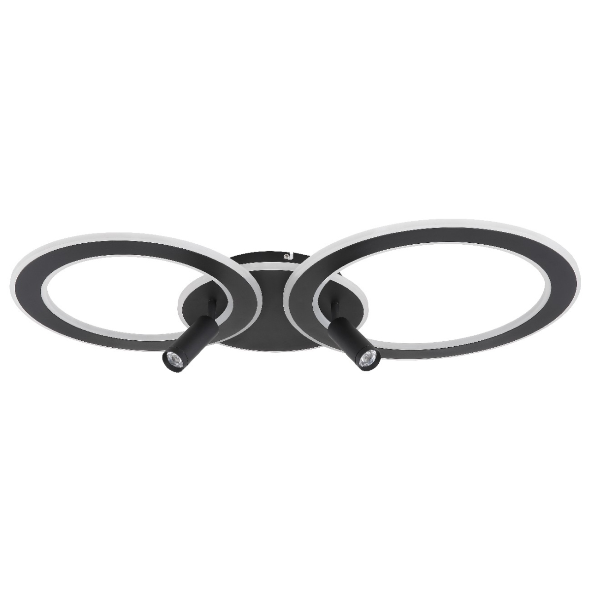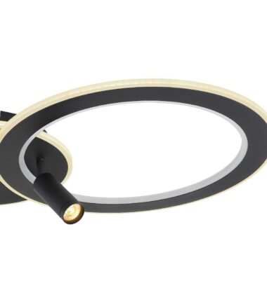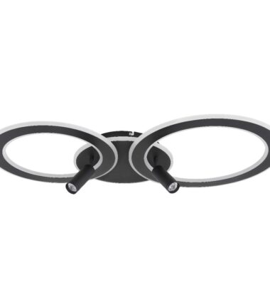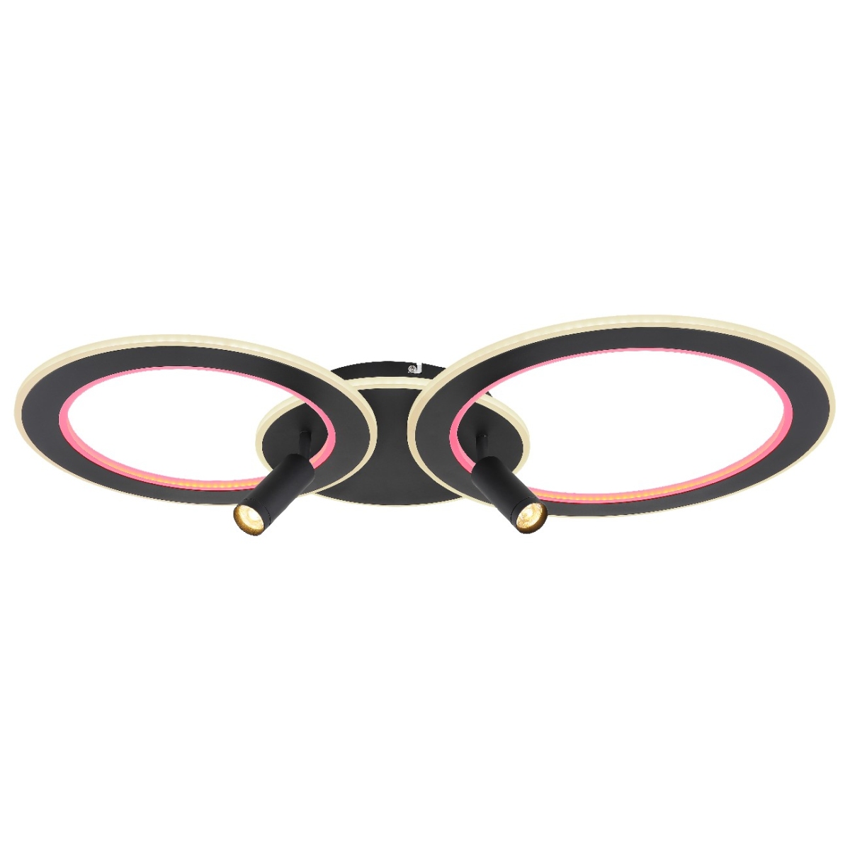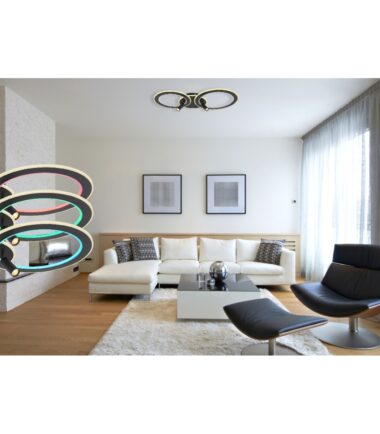 Ova izuzetno moderna plafonska lampa (89x50cm) ubeđuje ne samo svojim izgledom, već pre svega svojim funkcijama. Lampa se sastoji od dva oblikovana prstena koja su opremljena cilindričnim reflektorom i tri LED panela sa crvenom, zelenom i plavom funkcijom. Ona sija od 2700 Kelvina toplo bele do 6500 Kelvin hladno bele svetlosti i ima funkciju zatamnjivanja, funkciju pamćenja i takođe se mogu menjati boje: crvena, zelena i plava. Daljinski upravljač vam omogućava da sami odredite intenzitet svetlosti i boju svetlosti i na taj način stvorite sjajnu atmosferu.