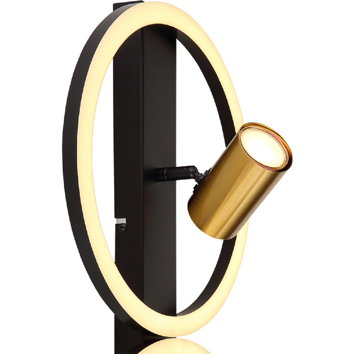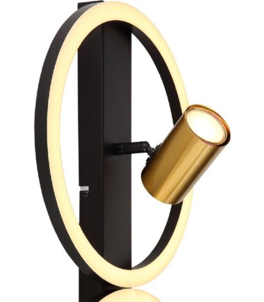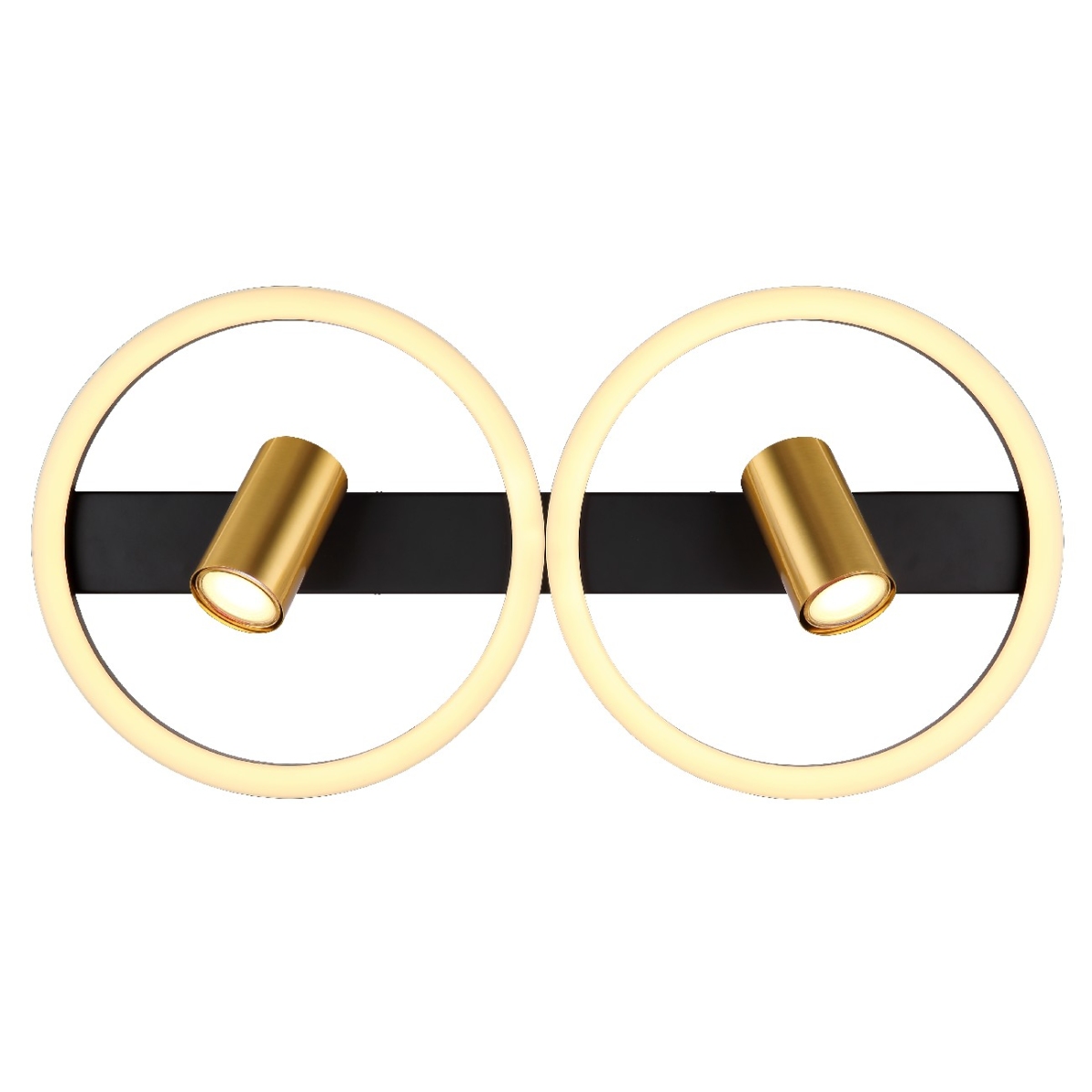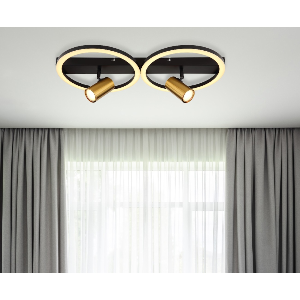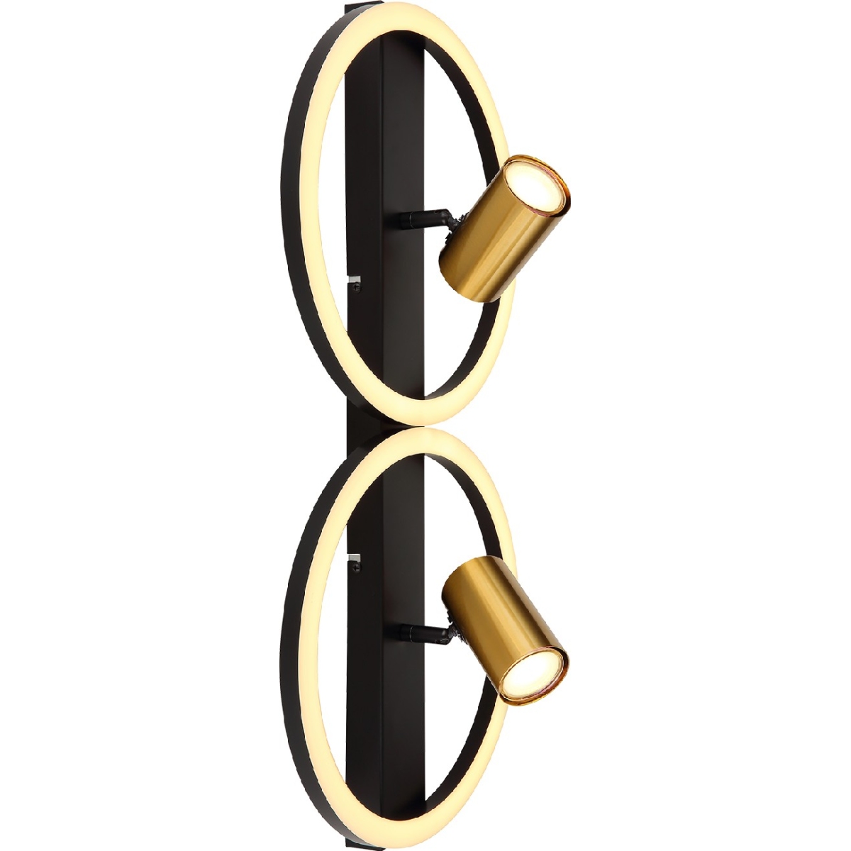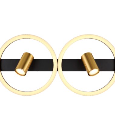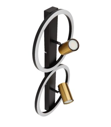 Ova moderna zidna lampa inspiriše svojim sjajnim dizajnom. Dva GU10 grla sa mesinganim kućištem i dva oblikovana okrugla LED panela (Ø30 cm) proističu iz crne zidne osnove. Proizvodi 3000 Kelvina toplo belu svetlost i tako osigurava prijatnu sobnu atmosferu.