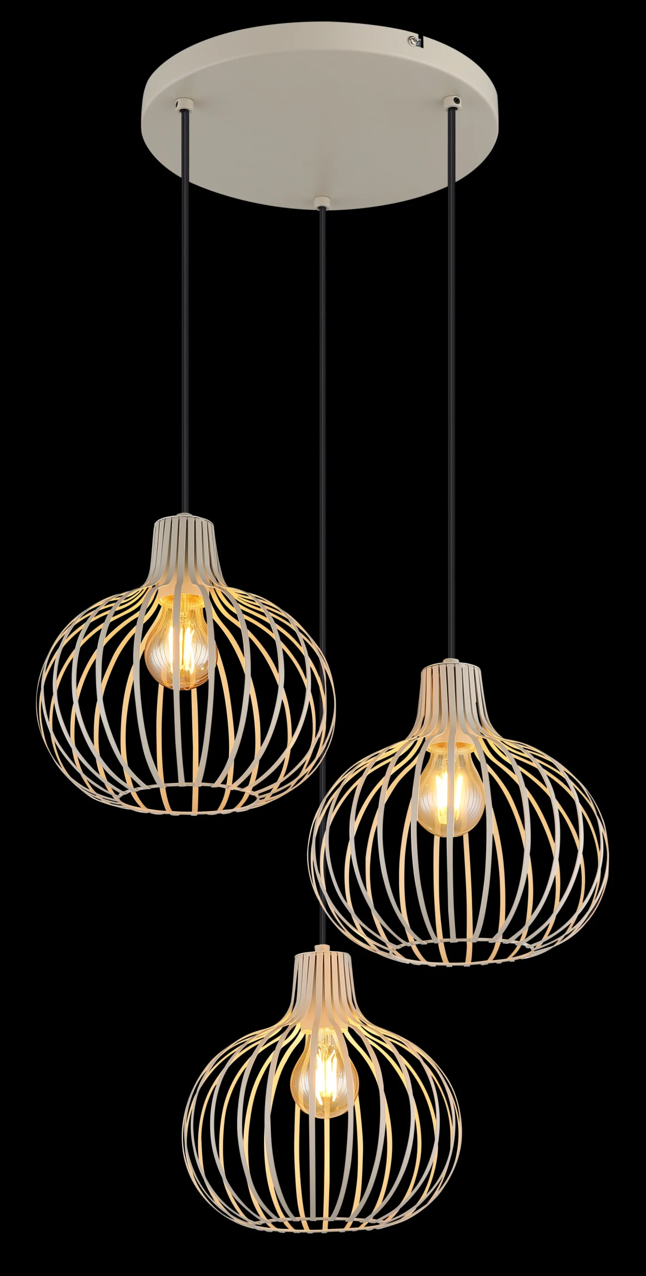 Viseća lampa MATEO kombinuje jednostavnu eleganciju sa modernim dizajnerskim jezikom i postaje stilski ukras u vašem dnevnom boravku ili trpezariji. Abažur napravljen od kremasto obojenog metala daje lampi topao, skladan izgled koji se može kombinovati na mnogo načina – bilo da je klasičan, skandinavski ili moderan. Tri E27 grla (sijalice nisu uključene) omogućavaju individualni dizajn osvetljenja po želji – bilo da je u pitanju toplo svetlo sa filantnom strujom ili jarka LED dioda. Crni PVC kabl stvara elegantan kontrast sa abažurom i ističe moderan izgled. Sa prečnikom od 500 mm i ukupnom visinom od 1200 mm, MATEO je idealan za postavljanje iznad trpezarijskog stola ili u prostranim dnevnim boravcima. Vešalica se po potrebi može skratiti i stoga se fleksibilno prilagoditi visini prostorije. Savršena lampa za stilsko osvetljenje sobe sa individualnim karakterom.