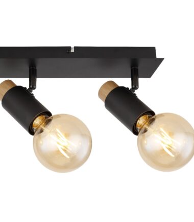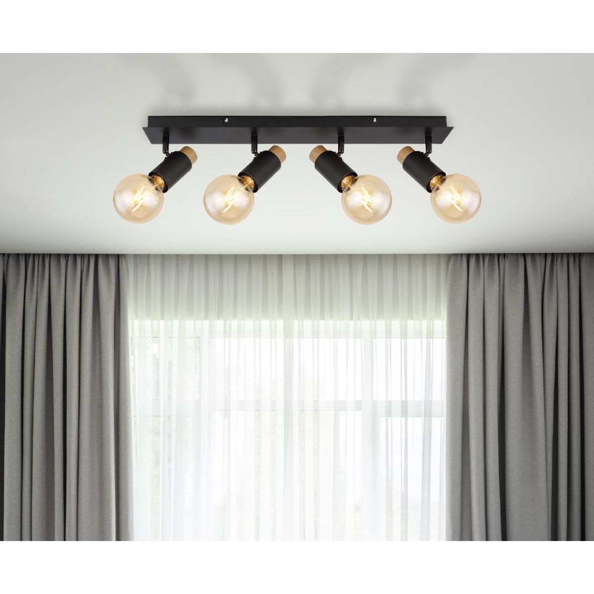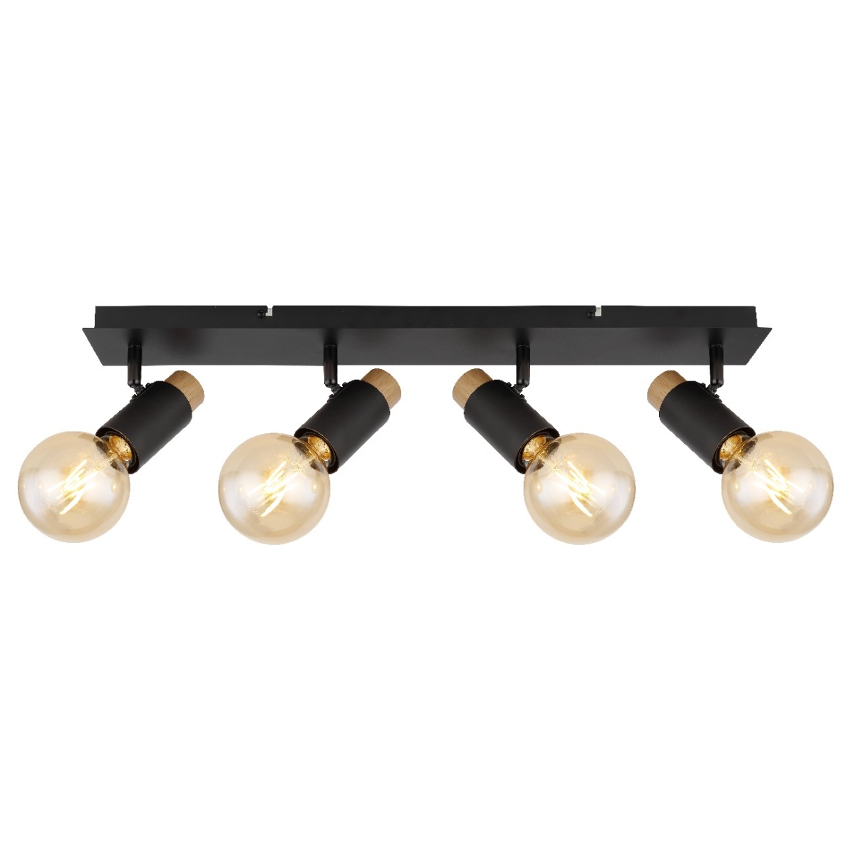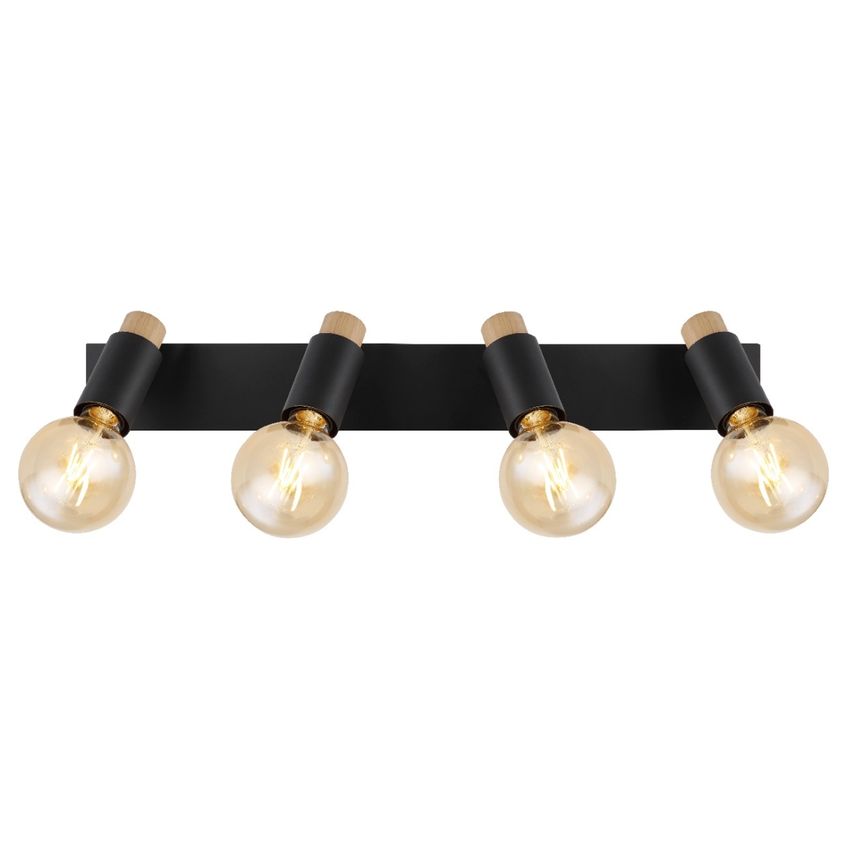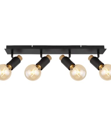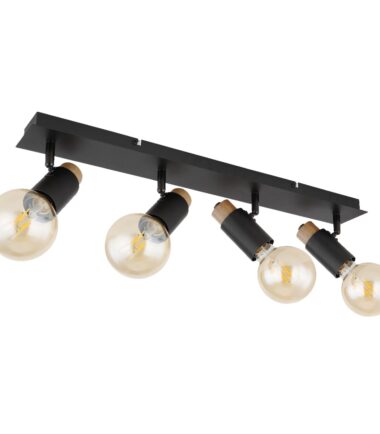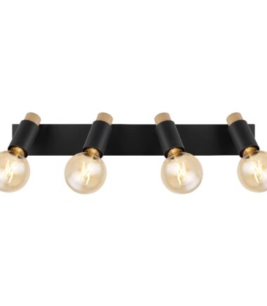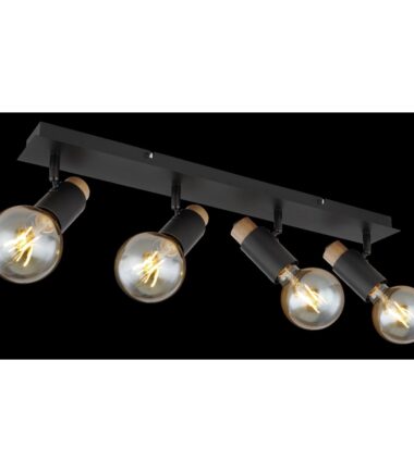 Ovaj prelepi reflektor impresionira svojim jednostavnim dizajnom. Četiri rotirajuća zgloba nastavljaju se na pravougaonu plafonsku osnovu koja je u crno mat boji (8×65,5cm). Na njima su četiri E27 grla sa ukrasima od drveta i metala. E27 grla vam omogućavaju da se odlučite za laganu boju i jačinu do maksimalnog izlaza od 40 vati. Zbog njihove dugovečnosti i uštede energije preporučujemo LED sijalice.
