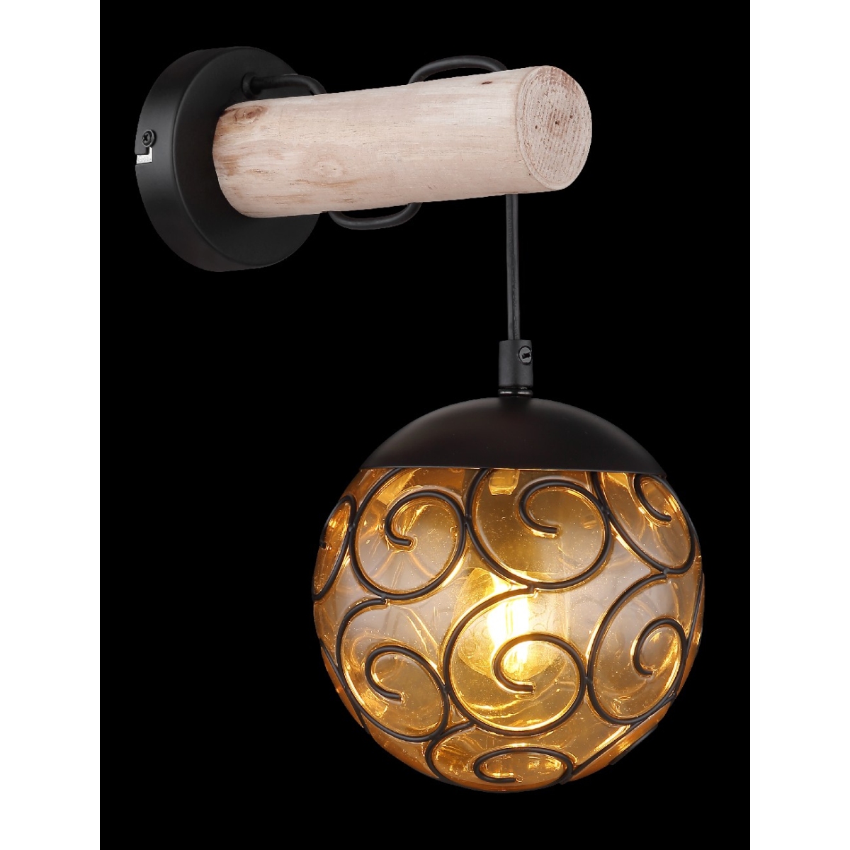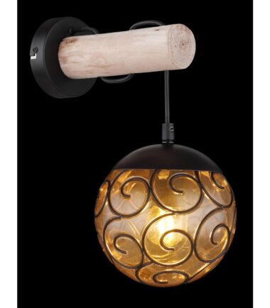 Ova nesvakidašnja zidna lampa inspiriše sjajnim dizajnom. Na okrugloj zidnoj osnovi nalazi se grana sa prepustom od 24,5cm napravljena od drveta. Na njoj je crni kabl koji vodi do E27 LED grla sa dodatnim prelepim dekorativnim staklenim abažurom boje ćilibara. E27 LED grlo vam omogućava da se odlučite za laganu boju i jačinu do maksimalnog izlaza od 9 vati.