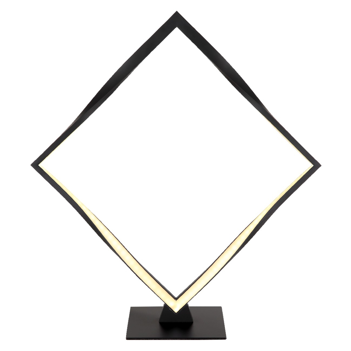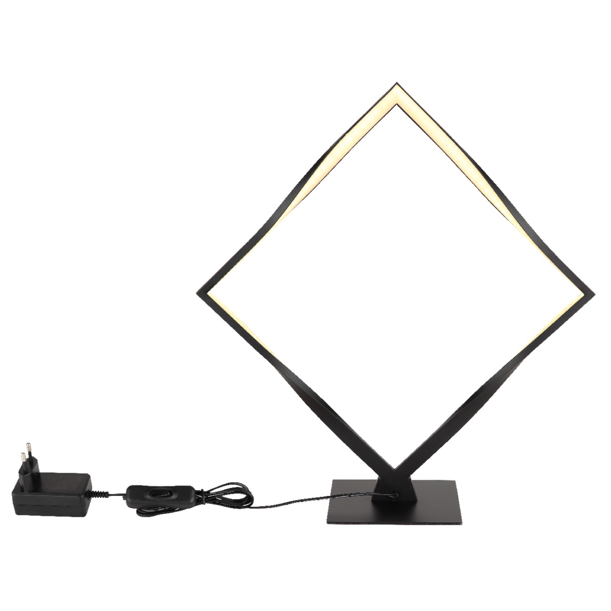 Ova moderna stona lampa uverava svojim odličnim dizajnom. Na crnoj mat osnovi nalazi se kvadratni LED panel sa uvijenim okvirom, koji emituje prijatnu toplu belu svetlost od 3000 Kelvina. Kvadratna stona lampa visine 44 cm je završena mat crnim aluminijumom.