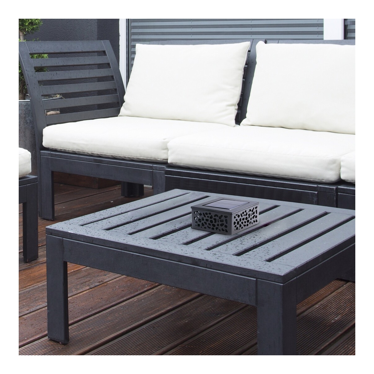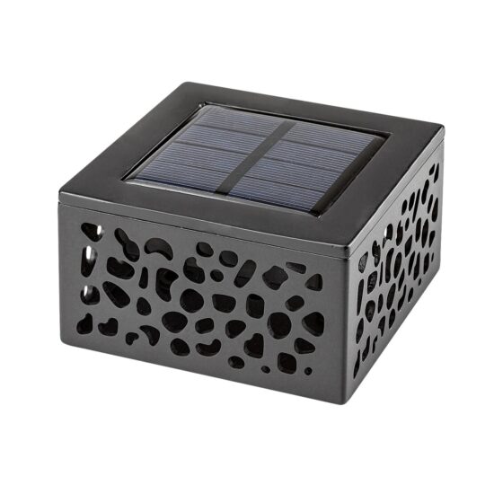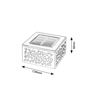 Moderna, kvadratna medulinska spoljna solarna stona lampa je odličan izbor za terasu, posebno kada imate lepu večeru ili letnji večernji razgovor. Ova crna svetiljka napravljena od plastike je perforirana nasumičnim šarama i dopunjena je mlečnim staklenim abažurom. Medulin ima ugrađen LED izvor svetlosti snage 0,5 V, svetlosnog fluksa od 8 lumena sa senkom i 10 lumena bez senke i temperaturom boje od 3.000 K. Sijalica koja emituje toplo belo svetlo ima životni vek od 12.500 sati. Ova stona lampa ima širinu od 85 mm i visinu od 50 mm. Solarna lampa Medulin ima IP44 zaštitu koja obezbeđuje da je zaštićena od upada predmeta prečnika do 1 mm i od prskanja vode iz bilo kog smera. AA solarna ćelija ima napon od 1,2 V i kapacitet od 600 mAh.