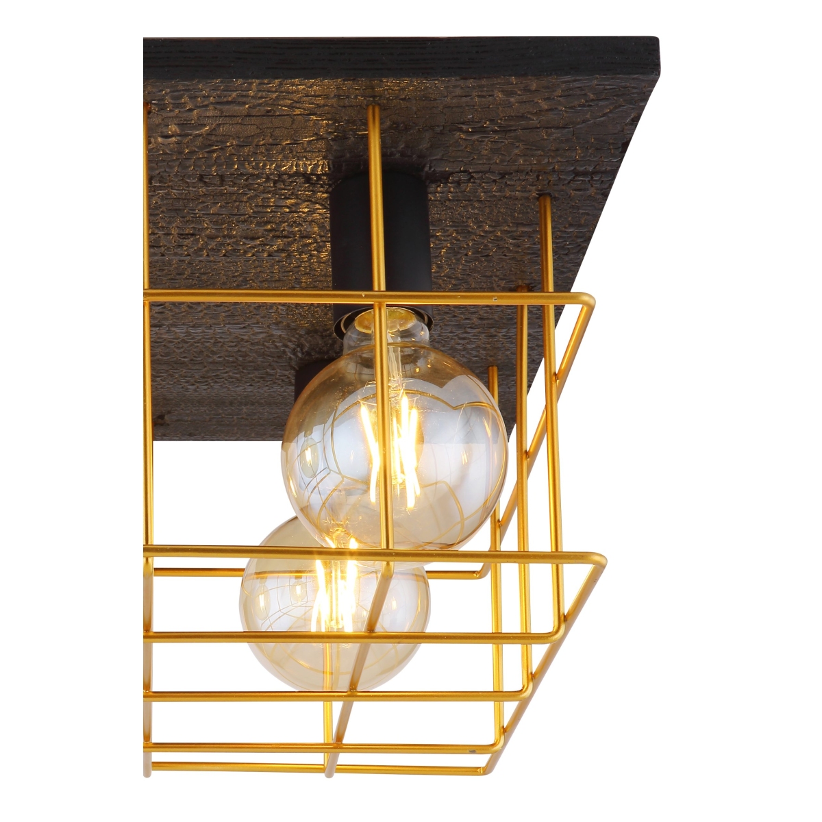 Ova kvadratna plafonska lampa iz serije MERRIL (40×40 cm) ističe se svojim stilskim dizajnom napravljenim od drveta i metala zlatne boje. Plafonska lampa dužine 26 cm sastoji se od crnog drvenog vrha, na koji je fiksirana zlatna metalna mreža. Ovim su obuhvaćena četiri E27 grla, koje mogu biti opremljena odgovarajućim sijalicama po vašem izboru, što vam pruža mogućnost da pojedinačno odredite boju svetla i jačinu. Sa ostalim artiklima iste serije možete da dovršite celokupnu sliku u svom enterijeru.