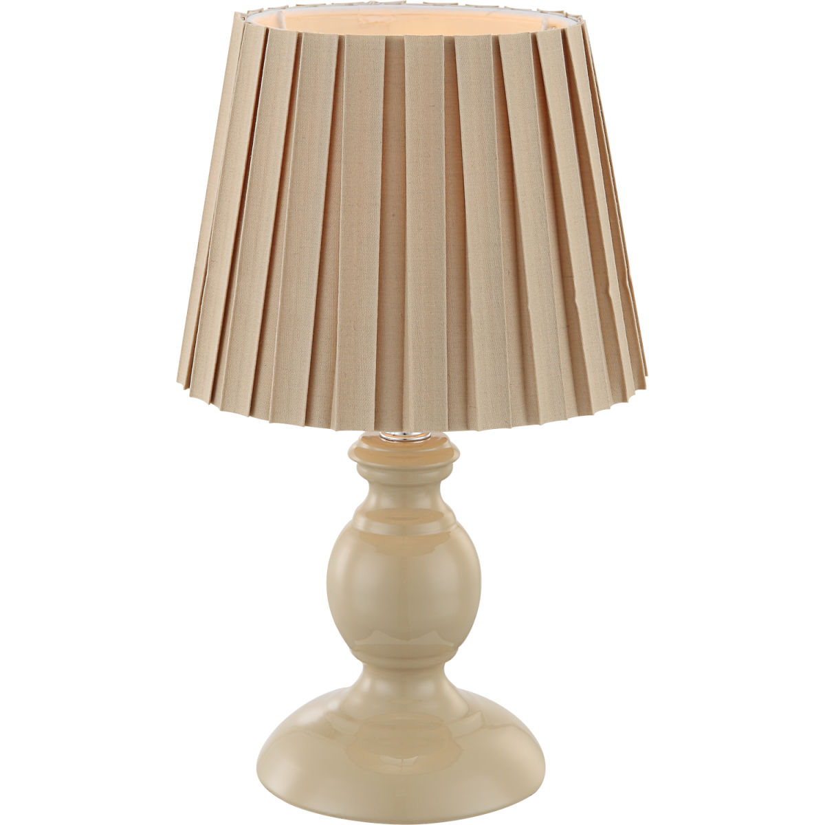 Tradicionalna okrugla stona lampa METALIC serije može se lako integrisati u bilo koju prostoriju. Nosač u boji peska i tekstilni abažur u boji peska su prijatna kombinacija. Ispod abažura je E14 grlo, koje se kontroliše prekidačem za isključivanje i omogućava slobodan izbor izvora svetlosti (max. 40W). Preporučujemo LED sijalice zbog njihove uštede energije i trajnosti.
