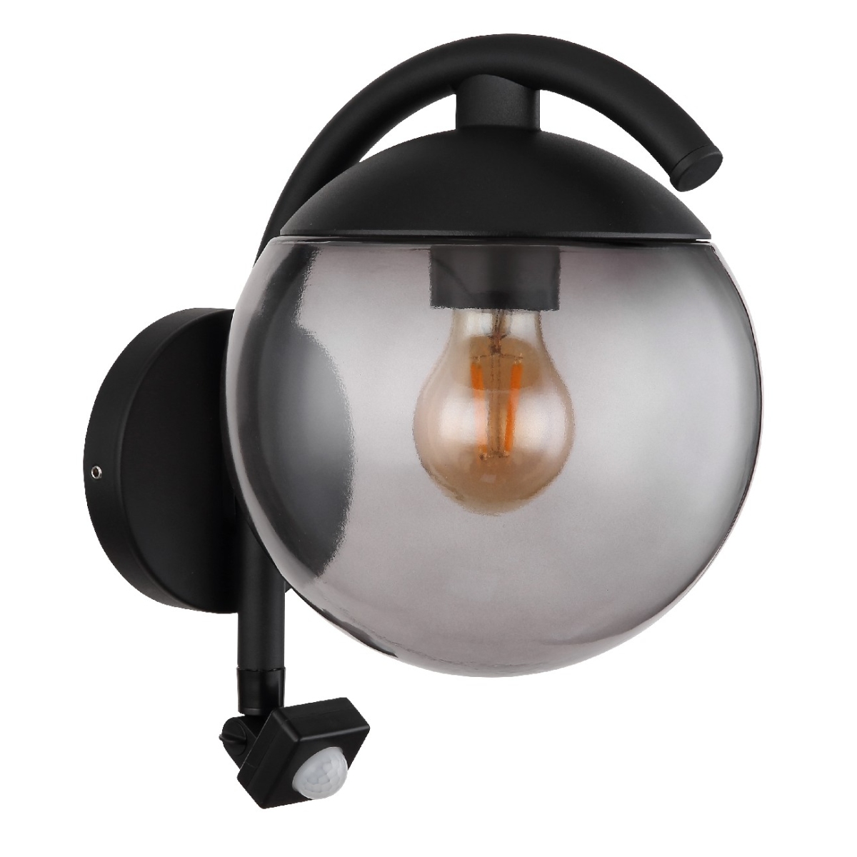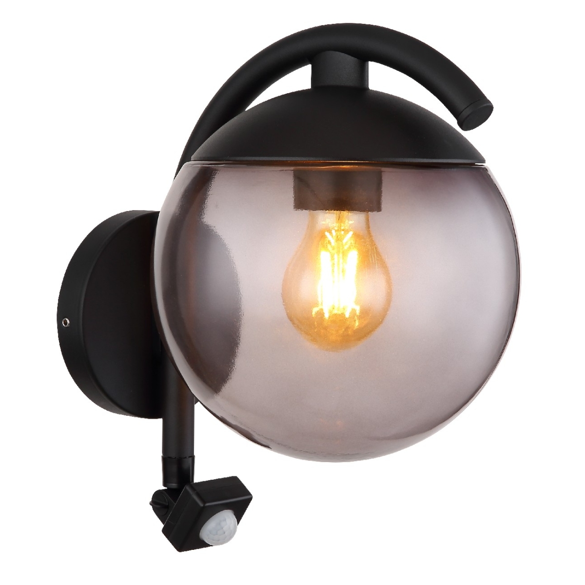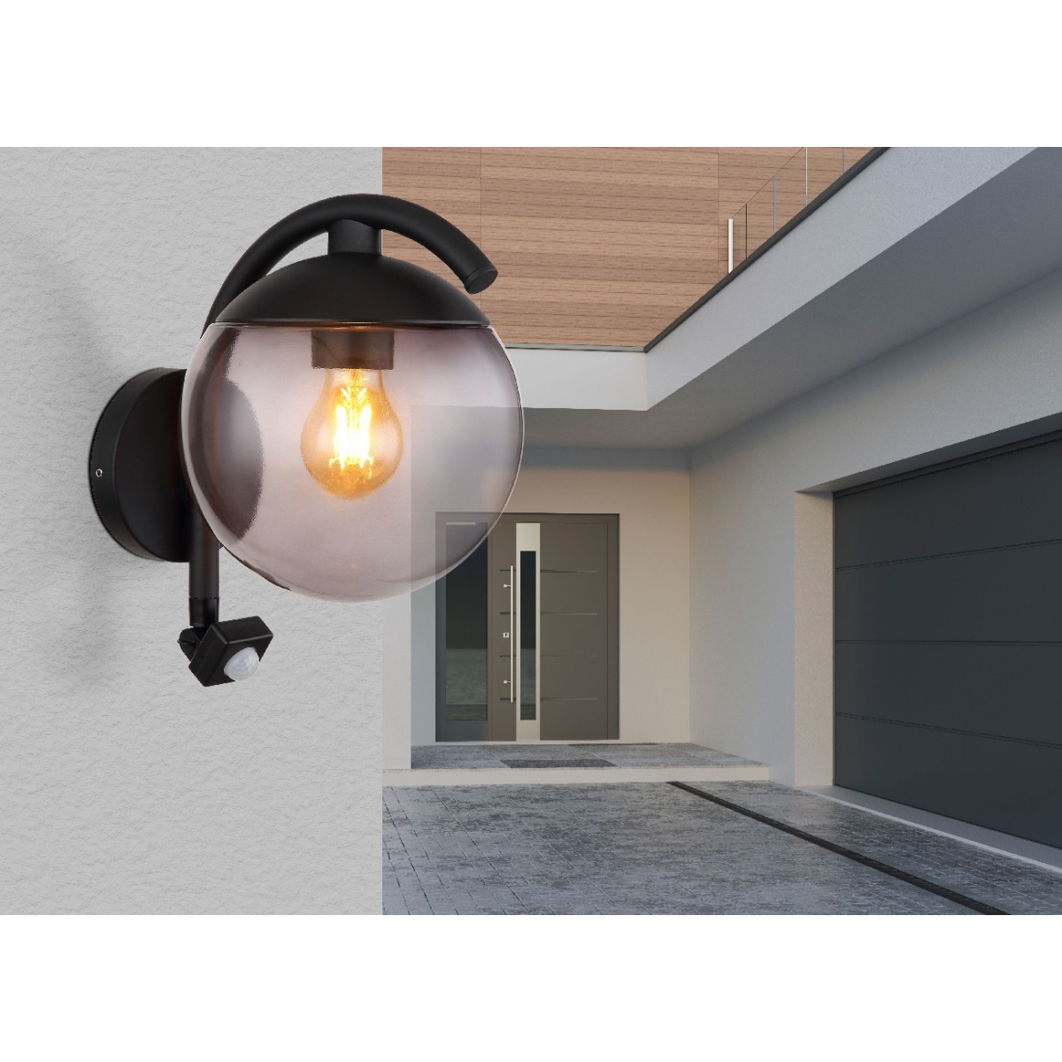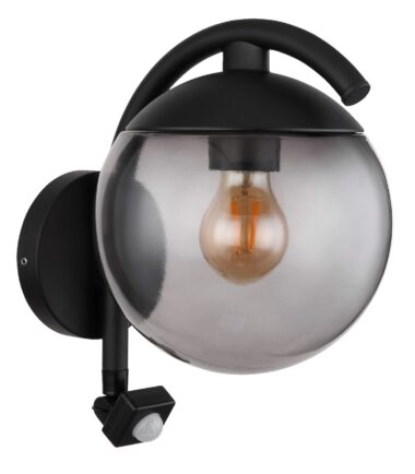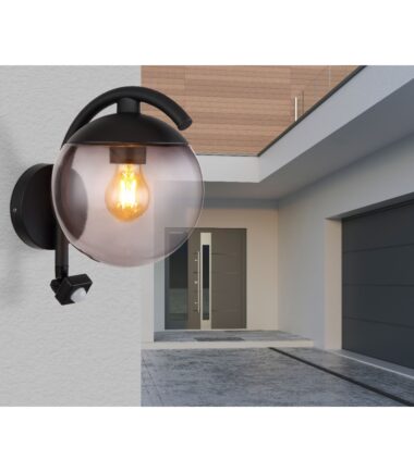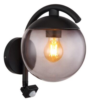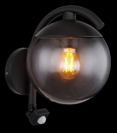Ova oblikovana zidna lampa inspiriše modernim dizajnom i tehnologijom. Crna mat metalna šipka prodire sa okruglog zidnog nosača, na kojoj se nalazi E27 grlo sa prepustom od 26 cm i ukrašeno je staklenim abažurom u boji dima. Grlo E27 vam daje mogućnost da sami odredite boju svetla i jačinu do maksimalne snage od 40 vati. Zbog dugovečnosti i uštede energije preporučujemo LED sijalice. Pored toga, ova zidna lampa ima senzor u opsegu od 2-8 m i 105°.