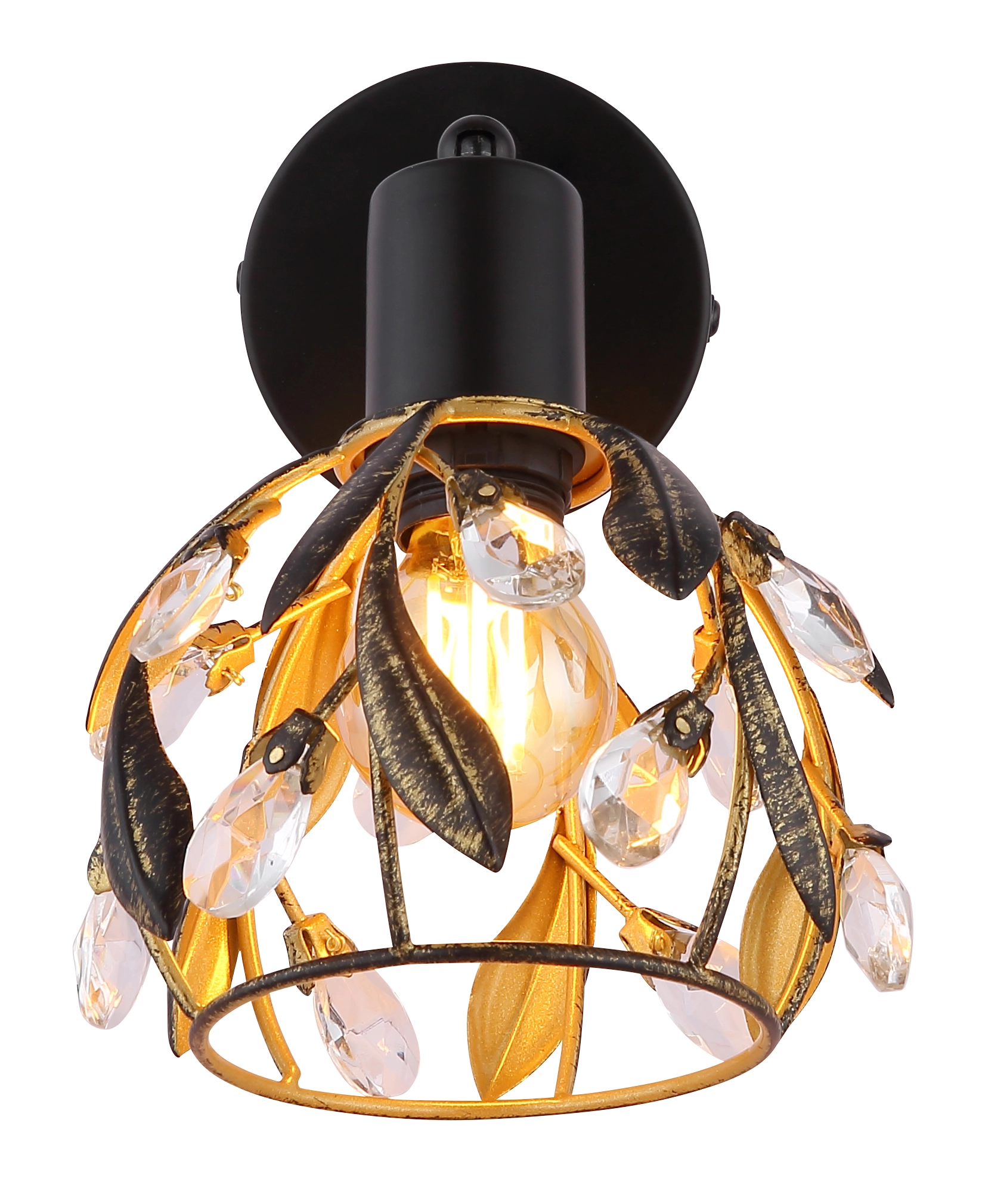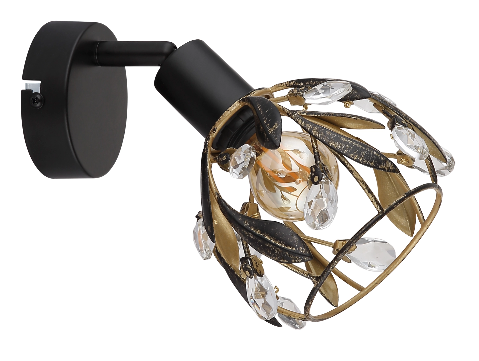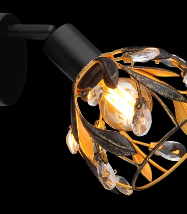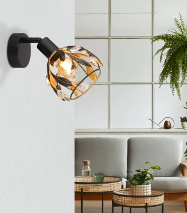 Otkrijte elegantni zidni znak MIKA sa jedinstvenim dizajnom koji nudi harmoničnu mešavinu tradicije i stila. Okrugli abažur je umetnički dizajniran sa dekorativnim listovima i blistavim kristalima. Telo lampe je napravljeno od visokokvalitetnog, crnog, mat metala, dok je abažur završen u atraktivnoj zlatnoj i patiniranoj crnoj boji. Ova kombinacija daje reflektoru poseban dodir i stvara prijatnu atmosferu u svakoj prostoriji. Prozirni akrilni kristali reflektuju svetlost i stvaraju impresivne igre svetlosti. Reflektor je opremljen grlom za sijalicu E14, koja nije uključena, tako da možete podesiti intenzitet svetlosti po svojoj želji. Idealan za klasične i moderne enterijere, ovaj elegantni komad se besprekorno uklapa u vaš dekor i dodaje stilske akcente. Unesite tu posebnost u svoj dom pomoću ovog impresivnog zidnog znaka!