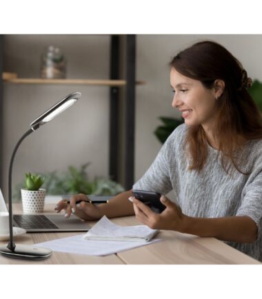 Ova stona lampa je jednostavna i kvalitativna, iz serije MINEA I, koja se izdvaja po svom kvalitetu. U izradi ove stone lampe izabrana je prelepa plastika u crnoj boji i boji hroma, što ovu lampu čini jedinstvenom po svom izgledu. Spot postavlja elegantan akcenat, podesiv je i na taj način služi individualnoj upotrebi. Tu je i dimer osetljiv na dodir, koji je dostupan za regulisanje svetline. LED od 5 vati osigurava pravu jačinu, svetlosna boja od 5500K se doživljava kao hladno bela, a intenzitet svetlosti od 280 lumena se savršeno slaže. Ovaj artikl se takođe može veoma dobro kombinovati sa drugim proizvodima iz iste serije.