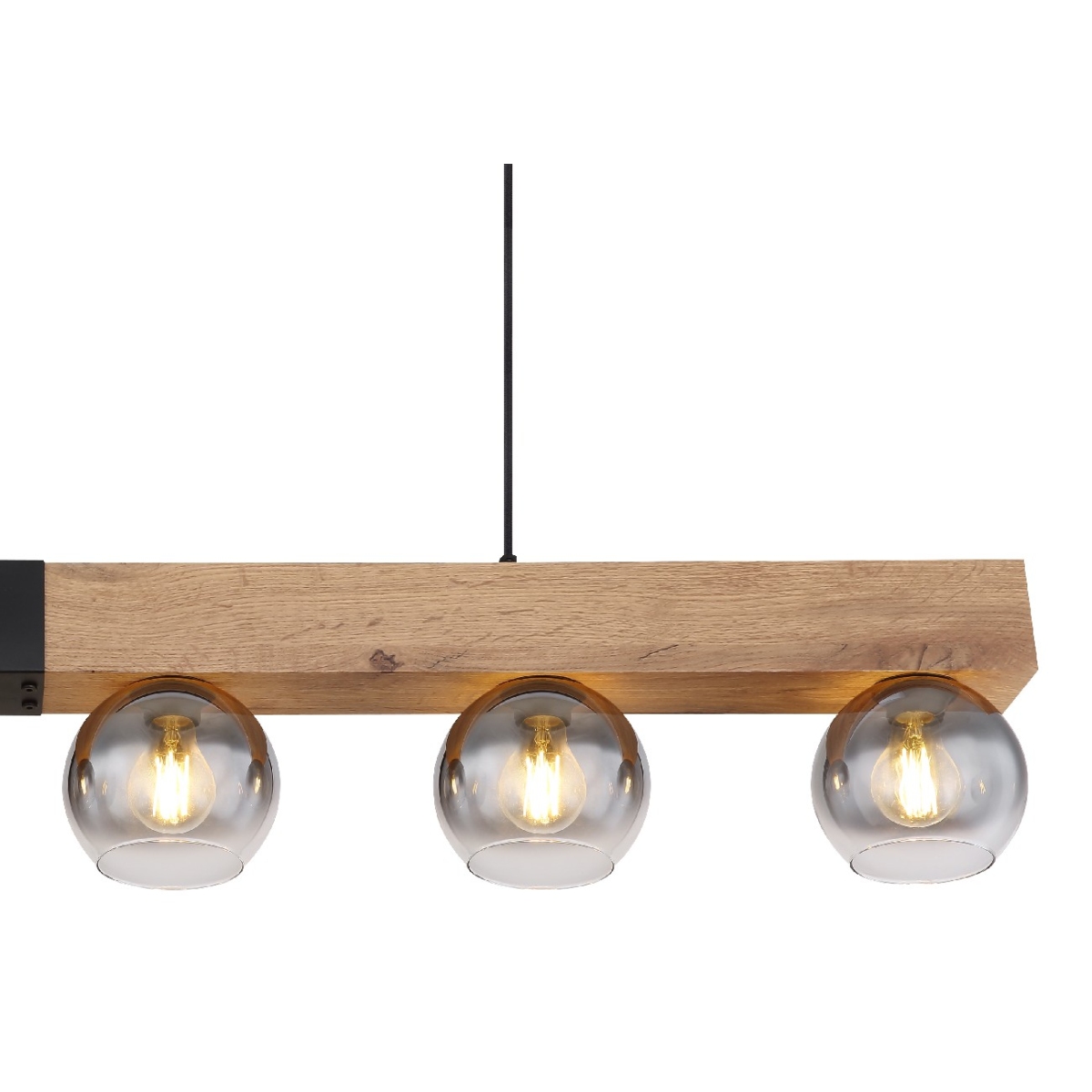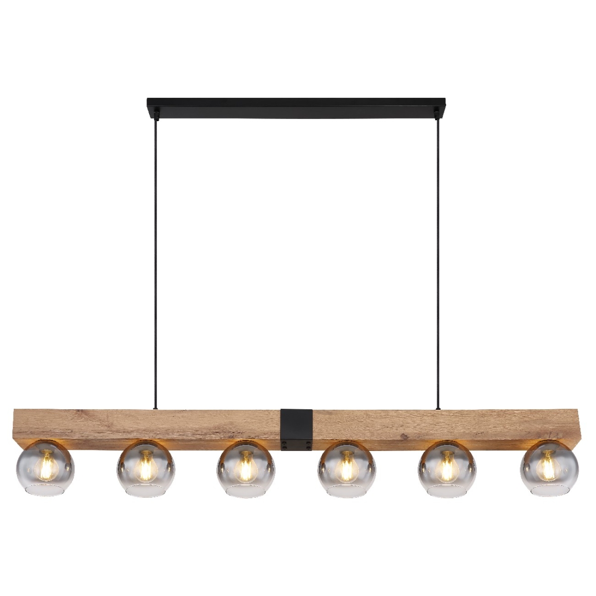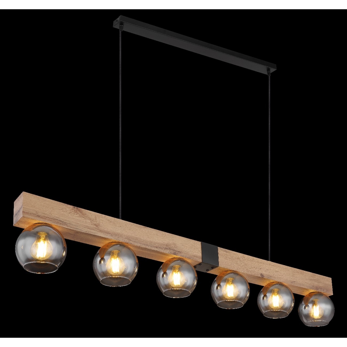 Ova prelepa visilica MOITAS serije inspiriše sjajnim dizajnom. Od crne pravougaone plafonske osnove, dva crna kabla dužine 1,2m prodiru do grede nakil drvetu (140x15cm). Postoji šest E27 grla, svako sa staklenom kuglom u boji dima. E27 grla vam omogućavaju da se sami odlučite za laganu boju i jačinu do maksimalne snage od 40 vati.