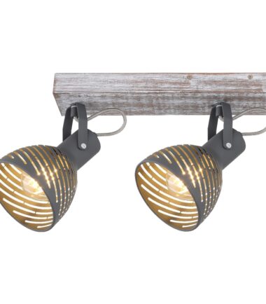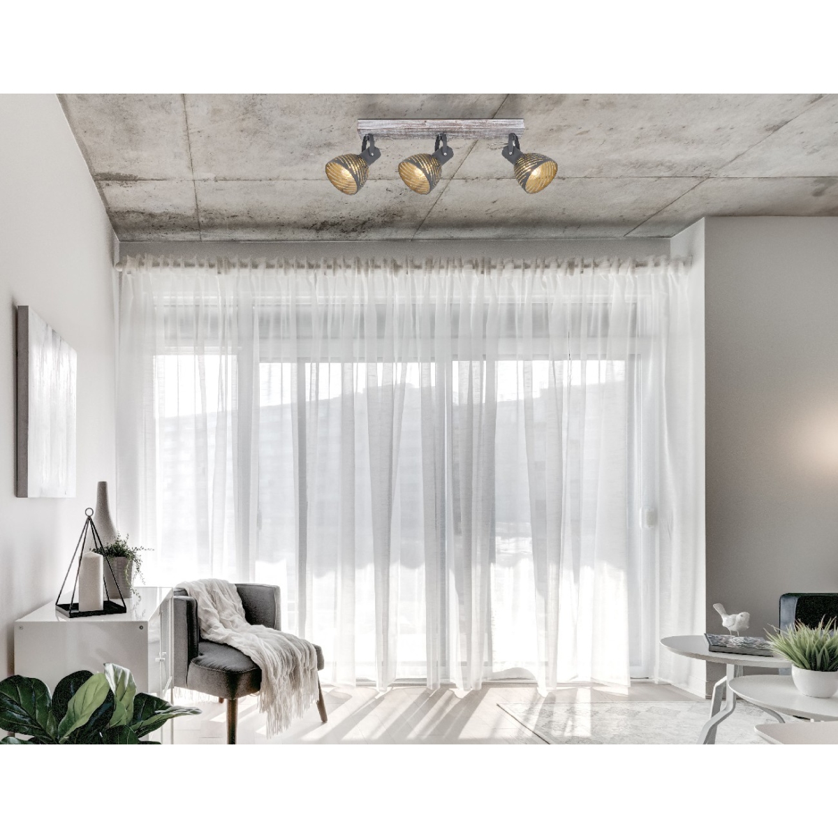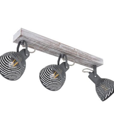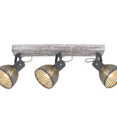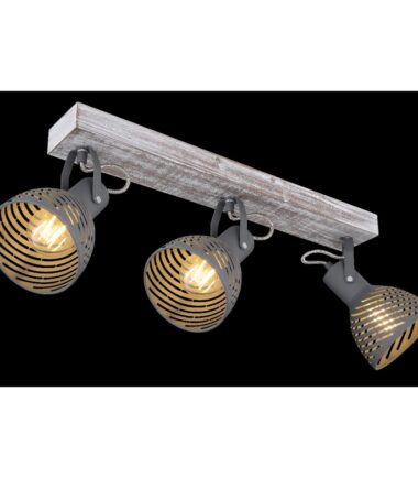Ova plafonska lampa iz serije MORI (54×12,5 cm) divno se uklapa u ambijent raznih stilova života. Sastoji se od bele oprane drvene grede, koja ima tri pokretna, siva metalna abažura sa linearnom šarom. Oni mogu biti opremljeni E27 sijalicama po vašem izboru, što vam pruža mogućnost da pojedinačno odredite laganu boju i jačinu. Sa ostalim modelima iste serije možete upotpuniti celokupnu sliku u svoja četiri zida.