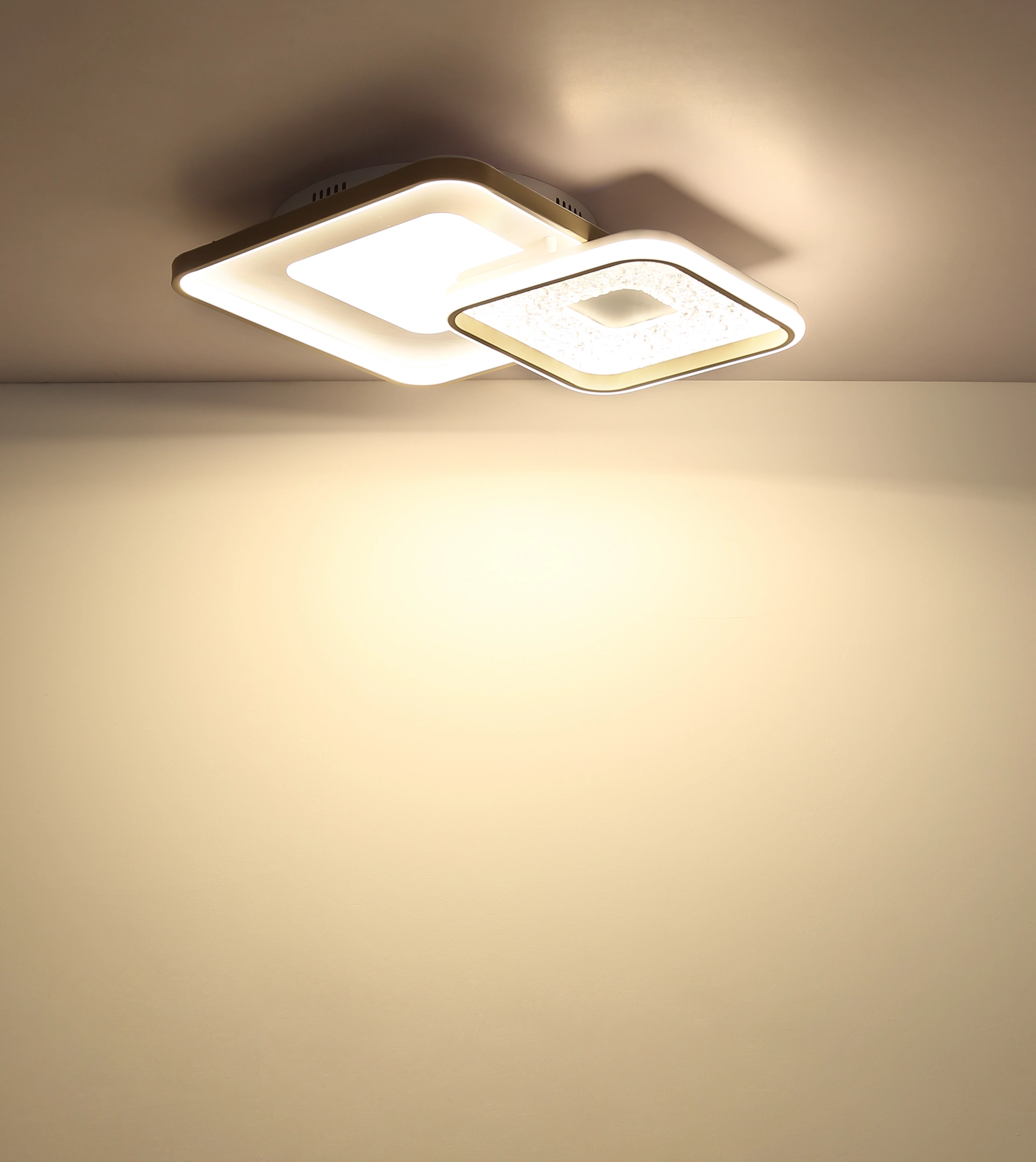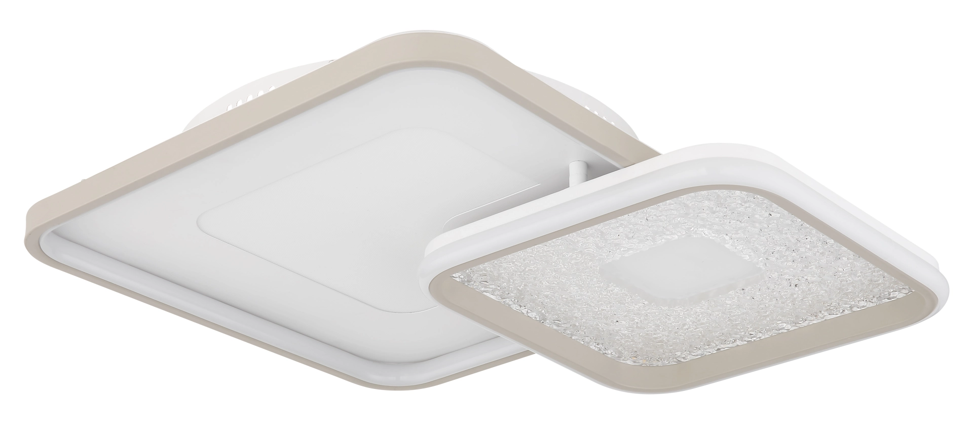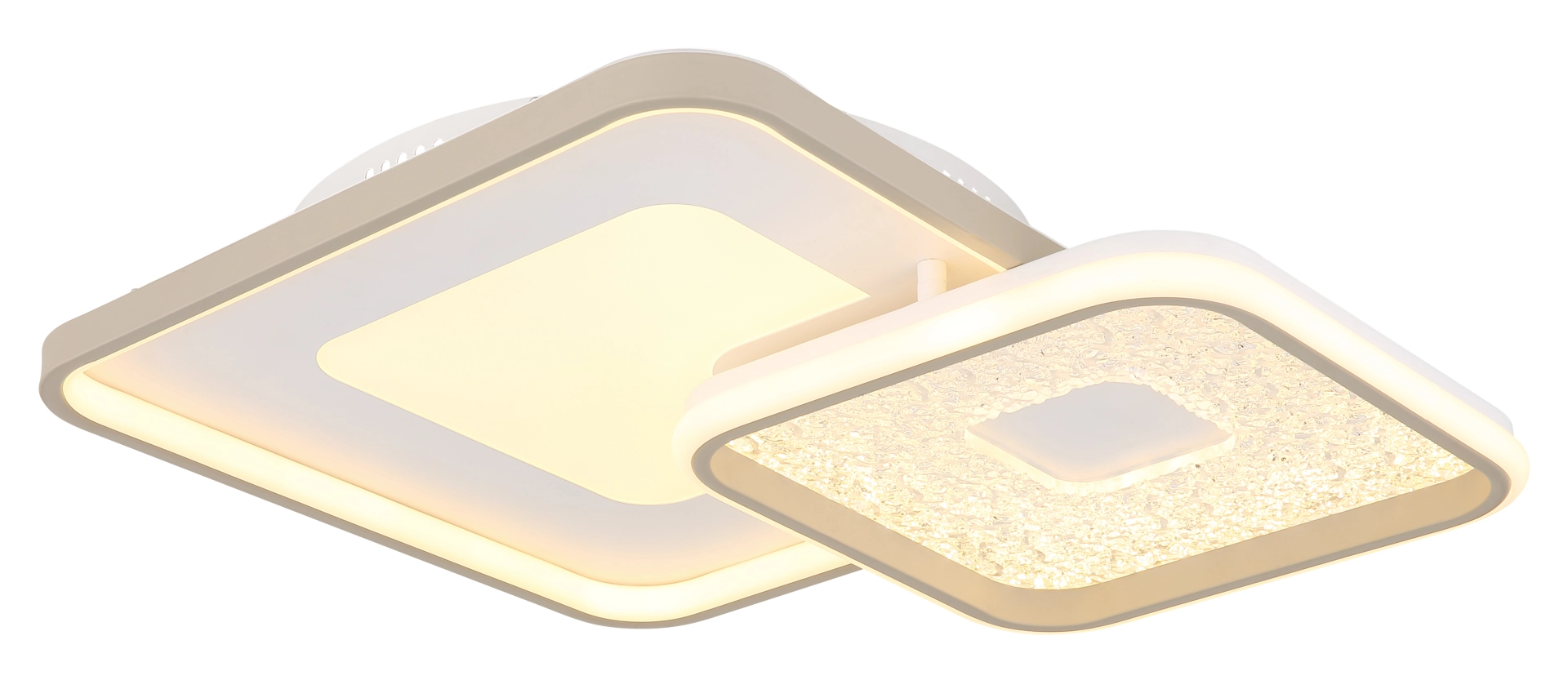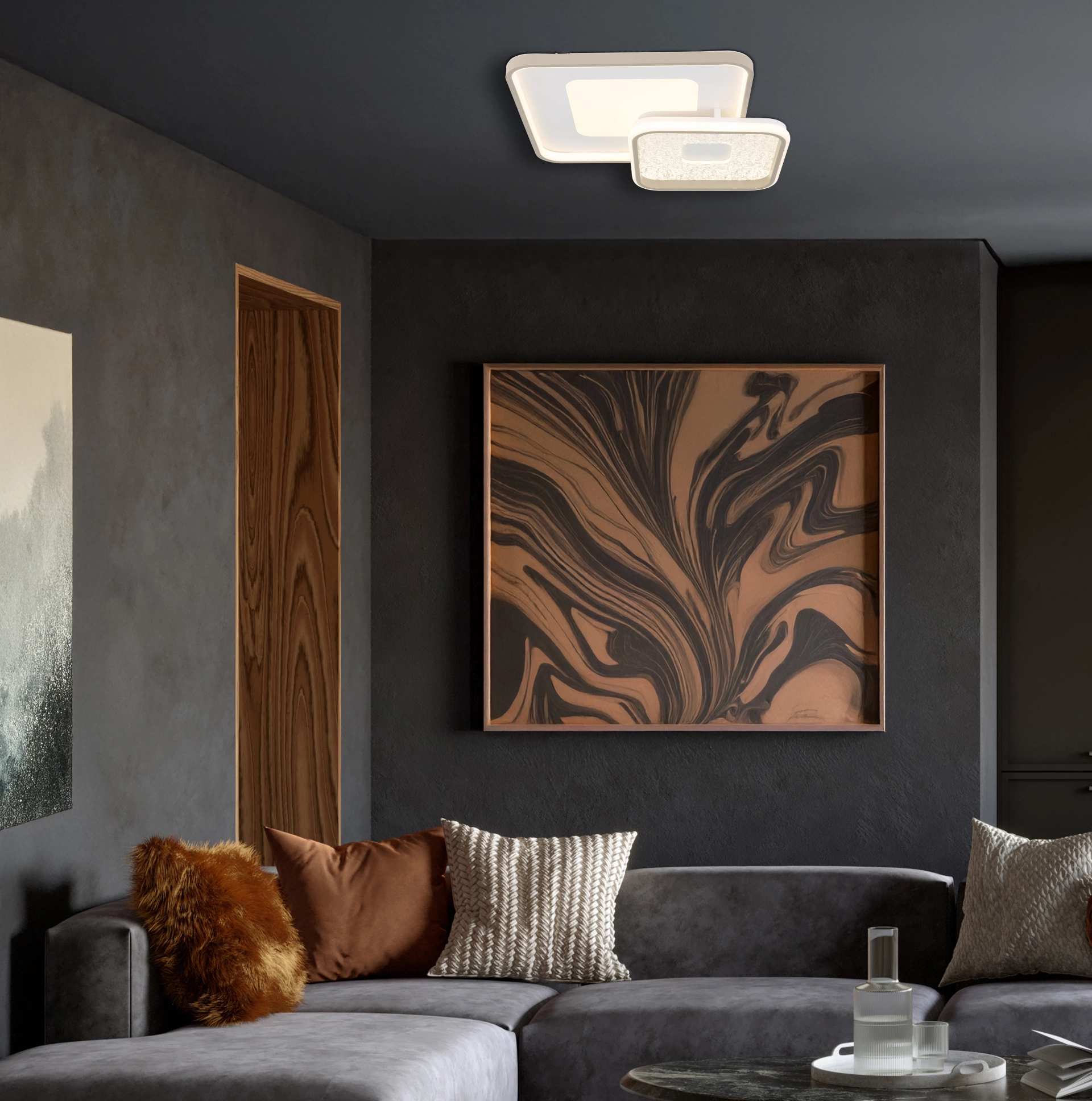 Kvadratna plafonska lampa MOSAIKO impresionira svojim modernim dizajnom i čistim, strukturiranim linijama. Dva preklapajuća kvadrata, pomerana jedan od drugog, formiraju karakterističan dizajnerski element, dajući lampi arhitektonski dodir. Telo napravljeno od mat bele i mat metala boje peska dodaje eleganciju, dok abažuri od opal akrila i providni akrilni dekor obezbeđuju ravnomernu raspodelu svetlosti sa dekorativnim akcentima. Sa dimenzijama D: 500 mm i Š: 500 mm sa svetlosnim izlazom od 2394 lumena, MOSAIKO je savršen za osvetljavanje dnevnih ili radnih prostora. Integrisana LED tehnologija (ukl.) garantuje energetsku efikasnost i izdržljivost. Sa uključenim daljinskim upravljačem, svetlo je jednostavno za rukovanje: može se prigušiti, sa fiksnim bojama, praktičnom funkcijom memorije i dodatnim noćnim svetlom. CCT funkcija omogućava fleksibilno podešavanje temperature boje između toplo bele 2700 K i dnevne bele 6000 K. Moderno rešenje za osvetljenje koje kombinuje stil i funkcionalnost.