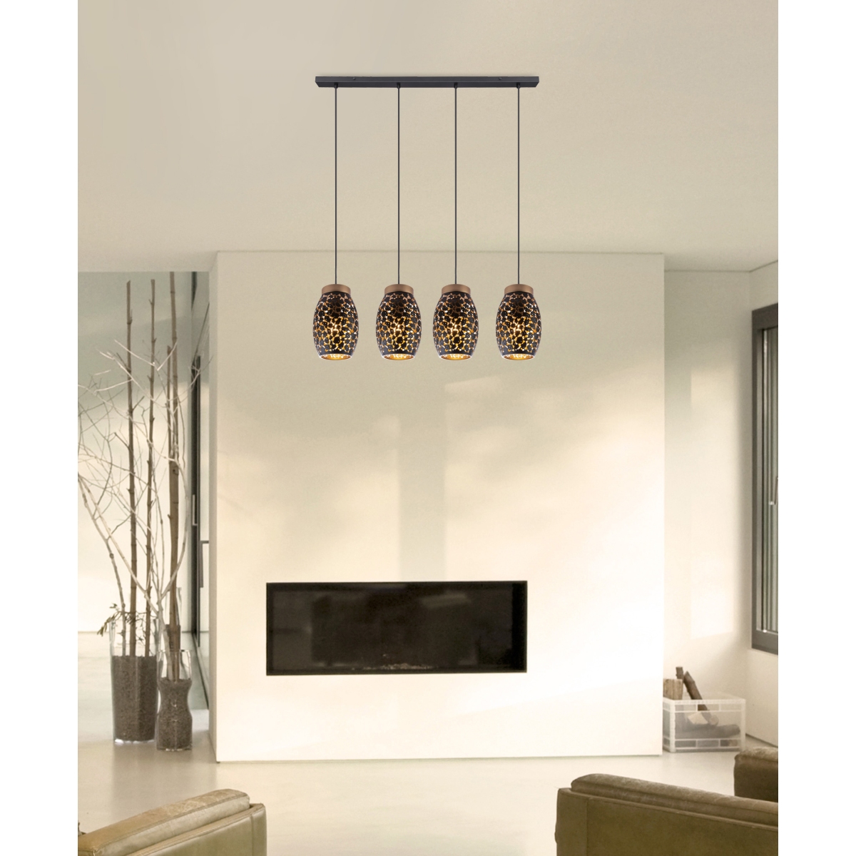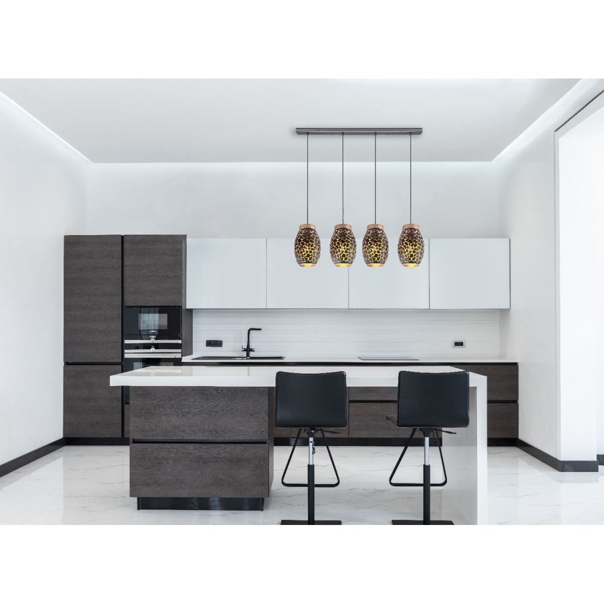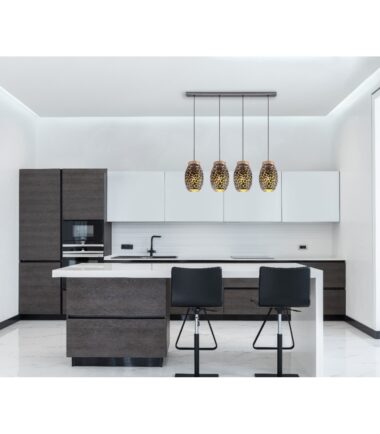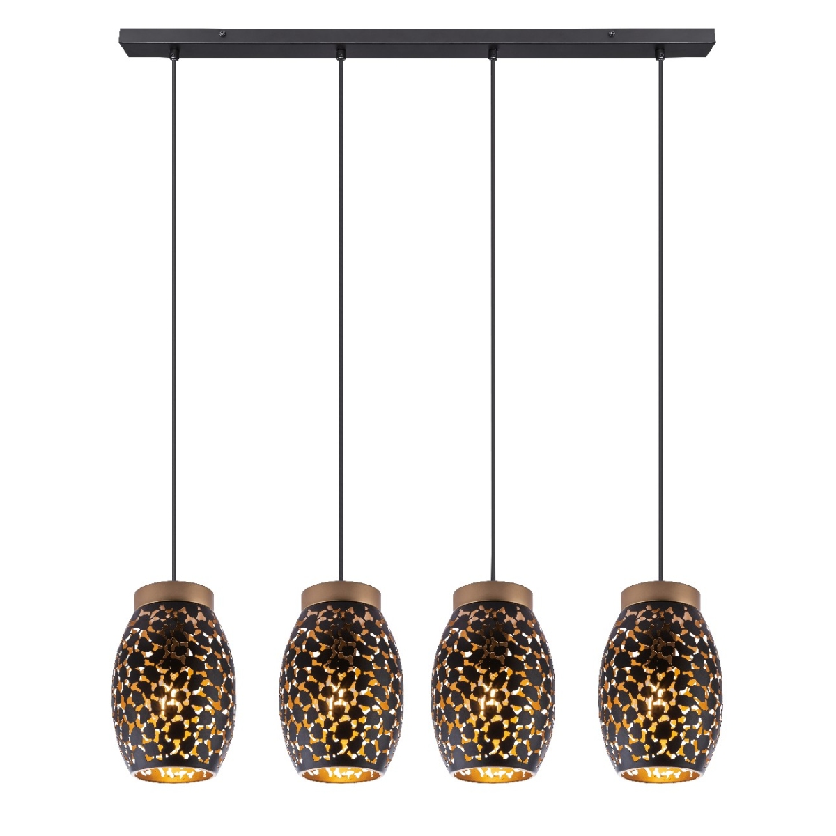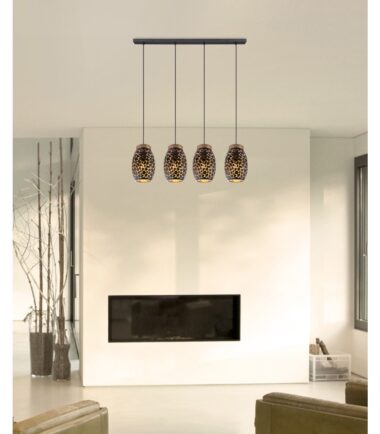 NARRI vislica je elegantan dodatak vašem enterijeru sa prelepim dizajnom metala crne i zlatne boje. Zbog svog izduženog oblika, vislica dugačka 90 cm može se divno montirati preko stola, koji potom doživljava jednoobrazno osvetljenje. Četiri okrugla metalna abažura sa elegantnom šarom su iznutra obojene bojom zlata i vise 1,2 m od plafona. Svaka od njih može biti opremljena E27 sijalicom po vašem izboru. Ovo vam omogućava da odredite boju svetla i jačinu u skladu sa vašim potrebama. Uz Narri možete napraviti udobnu atmosferu u vašem zatvorenom prostoru.
