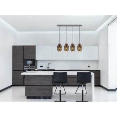 Viseća lampa Nari je stilski dodatak vašem enterijeru sa svojim prelepim dizajnom u crnom mat i zlatnom metalu. Zbog svog izduženog oblika, viseća lampa dužine 90 cm može se divno montirati iznad stola, koji zatim dobija ravnomerno osvetljenje. Četiri okrugla metalna abažura sa stilskim uzorkom su zlatno nijansirana iznutra i vise 1,2 m od plafona. Svaka može biti opremljena sijalicom E27 po vašem izboru. Ovo će vam omogućiti da odredite boju svetlosti i osvetljenost prema vašim željama. Sa Narijem možete stvoriti ugodnu atmosferu u svom zatvorenom prostoru.