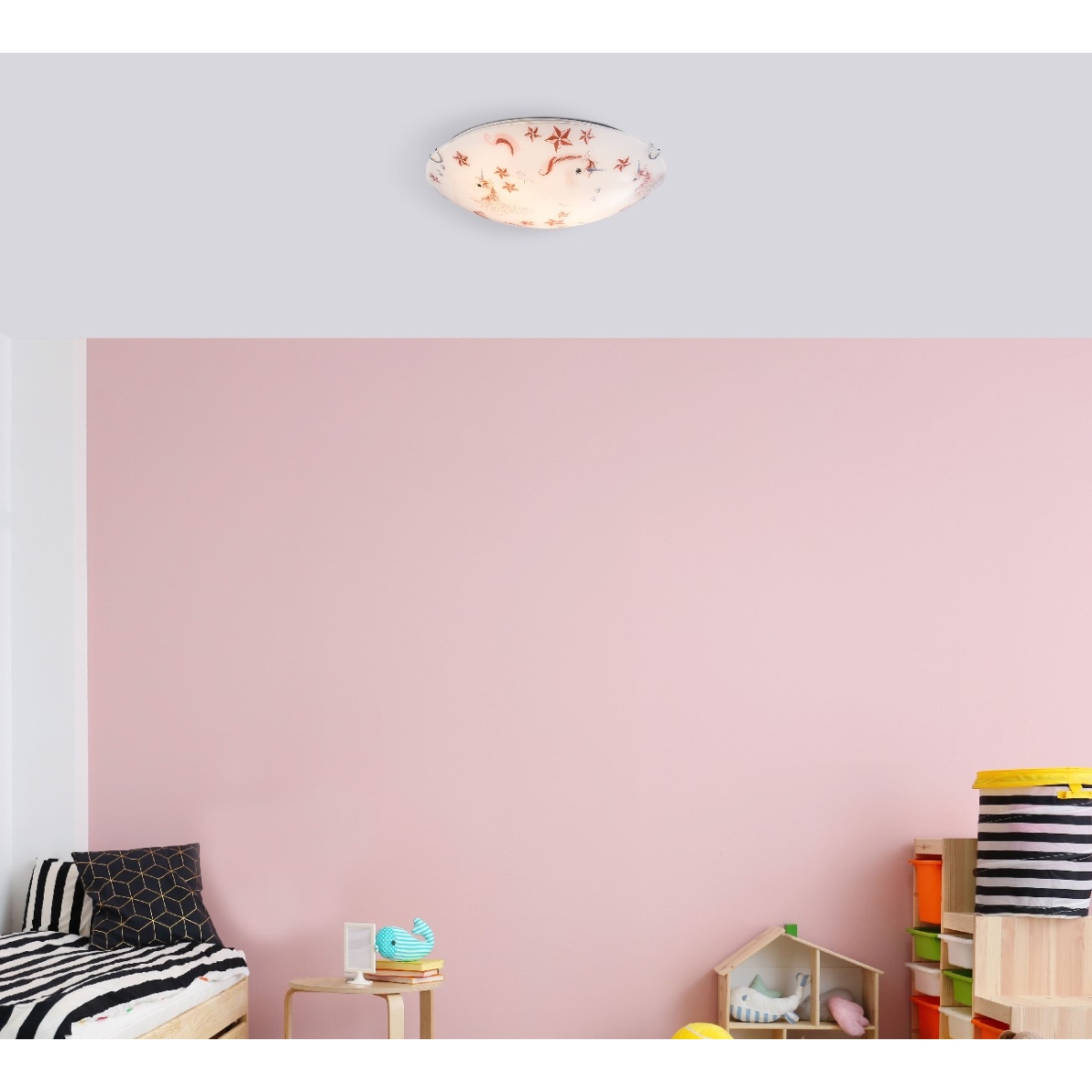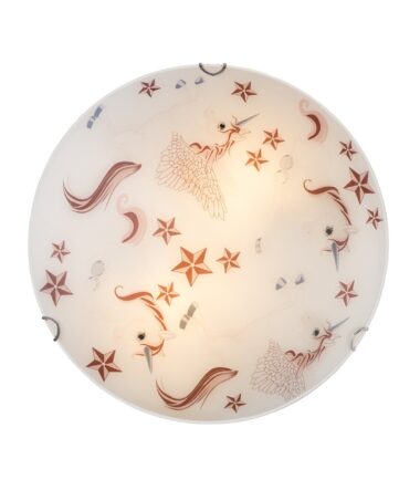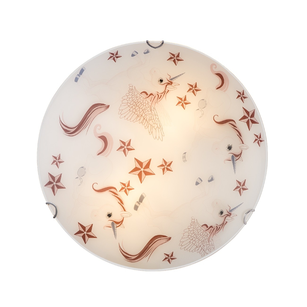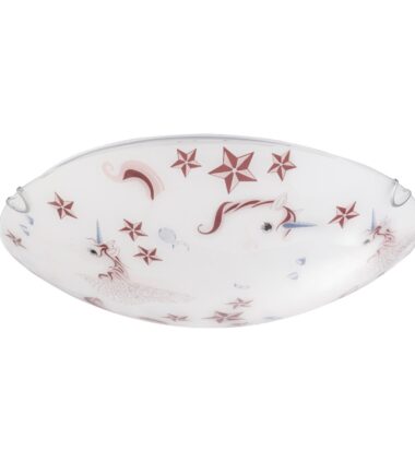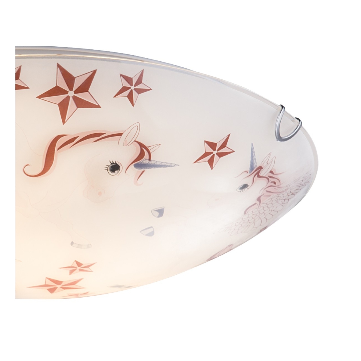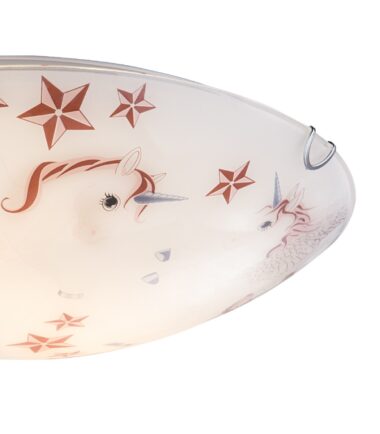 Savršena za svaku dečiju sobu, okruglo zakrivljeno staklo (Ø40cm) ove plafonske lampe nudi prelepe motive jednoroga sa zvezdama koje se podudaraju sa bojama. Dostupno E27 grla ove plafonske lampe omogućavaju vam da sami odaberete sijalicu, a samim tim i intenzitet svetlosti i boju svetlosti ( max.60W). Zbog njihove uštede energije i dugovečnosti preporučujemo LED sijalice. Deca će biti presrećna!
