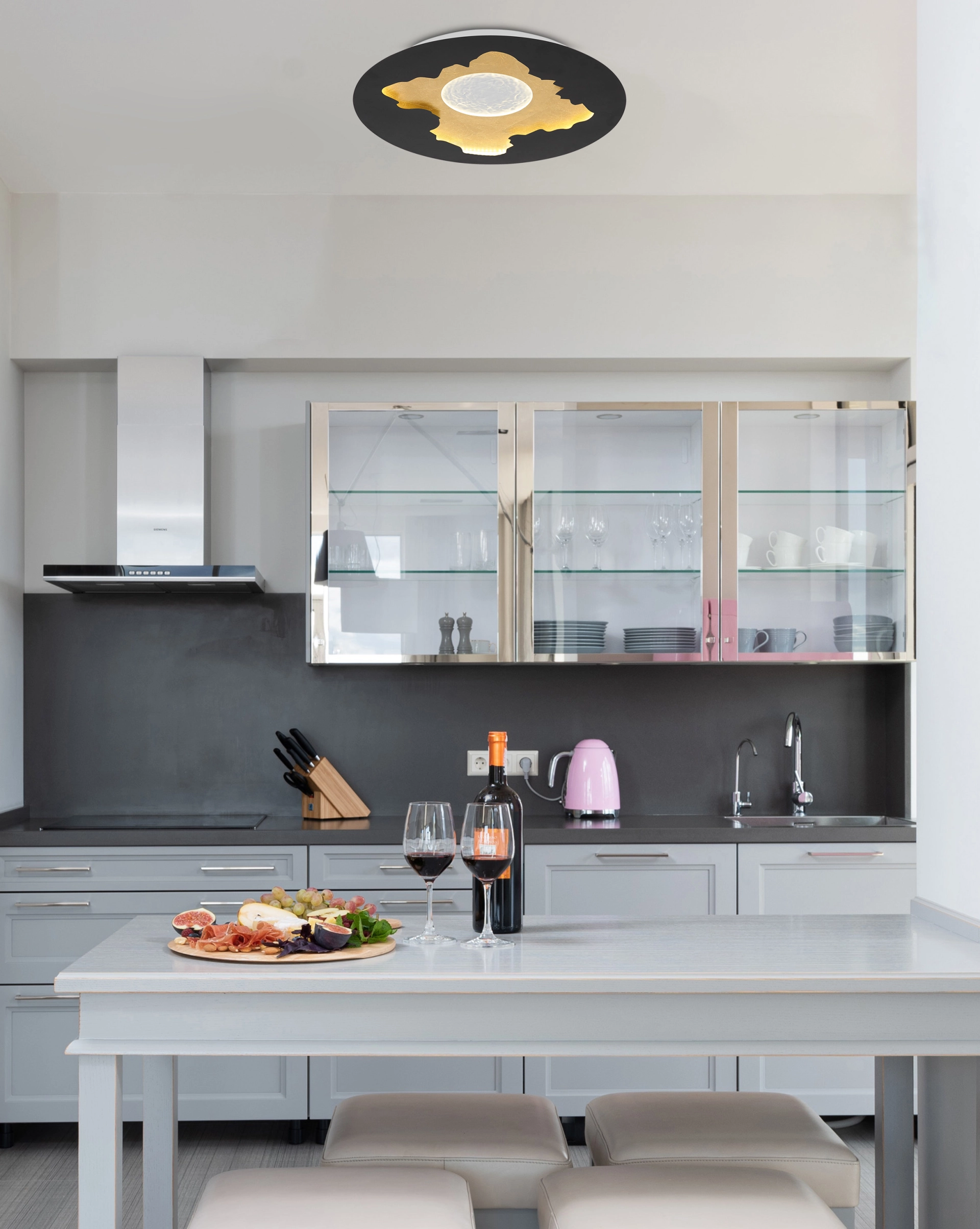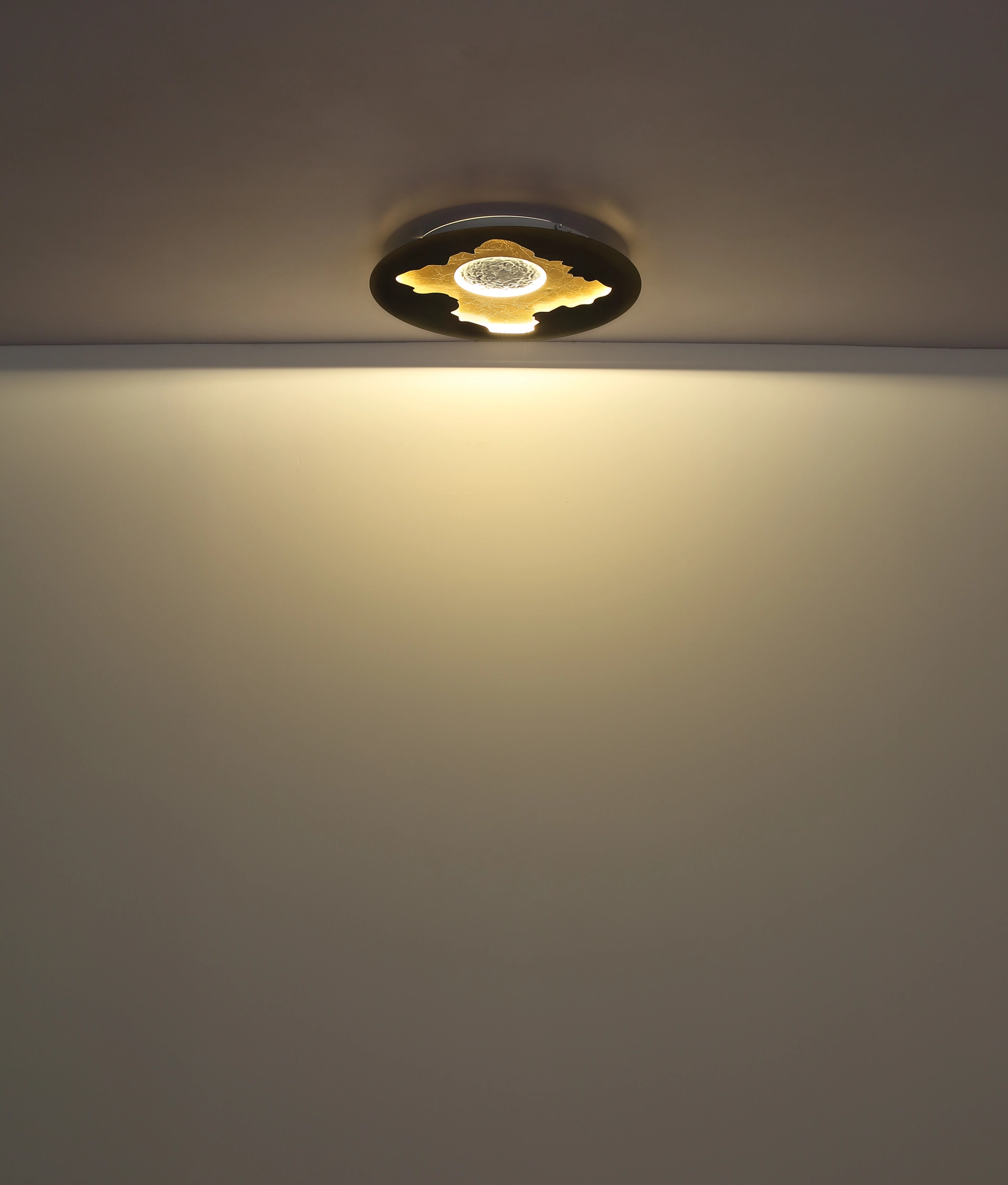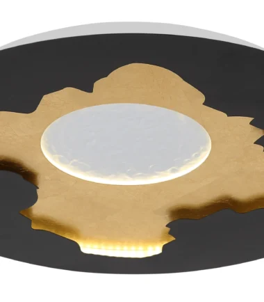Plafonska lampa OBSCURA impresionira svojim jedinstvenim dizajnom i inovativnim funkcijama. Okrugli oblik i telo napravljeno od crnog, mat metala daju lampi elegantan i bezvremenski izgled. Posebno je upečatljiv abažur, koji iznutra ima stilski oblik oblaka i kombinovan je sa zlatnim listićima i opalnim akrilom, što obezbeđuje toplu i harmoničnu raspodelu svetlosti. Sa prečnikom od 450 mm, lampa se savršeno uklapa u različite prostorije i postavlja stilske akcente. Plafonska lampa OBSCURA opremljena je integrisanom LED diodom koja nudi temperaturu boje od 3000 K i pruža prijatno, udobno osvetljenje. Praktična funkcija memorije omogućava kontrolu svetlosti prema vašim individualnim željama. Bilo da je u dnevnoj sobi, hodniku ili spavaćoj sobi – plafonska lampa OBSCURA stvara jedinstvenu atmosferu i kombinuje estetsku lepotu sa funkcionalnim osvetljenjem.