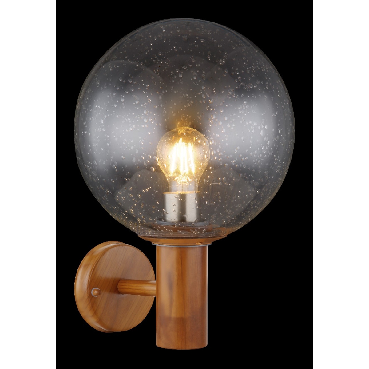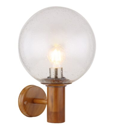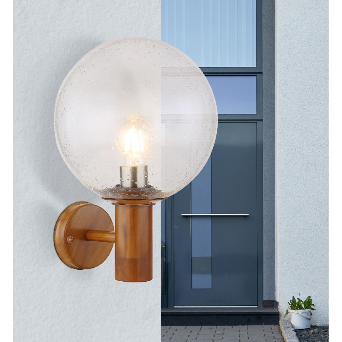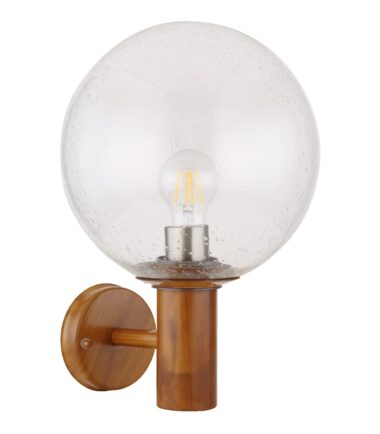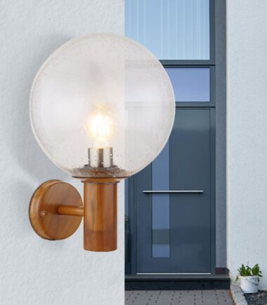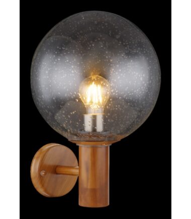Ova vanvremenska spoljašnja lampa (Ø25cm) serije OSSY idealna je kao zidna lampa na otvorenom i pravi odličnu celokupnu sliku zbog prelepog drvenog izgleda. Iz cilindričnog tela u prelepom drvenom izgledu istureno je E27 LED grlo koja može biti opremljeno sijalicom po vašem izboru, do maksimalne snage od 15 vati. Okrugla staklena kugla sa mehurićima prekriva E27 LED grlo i pruža zaštitu od prskanja vodom.