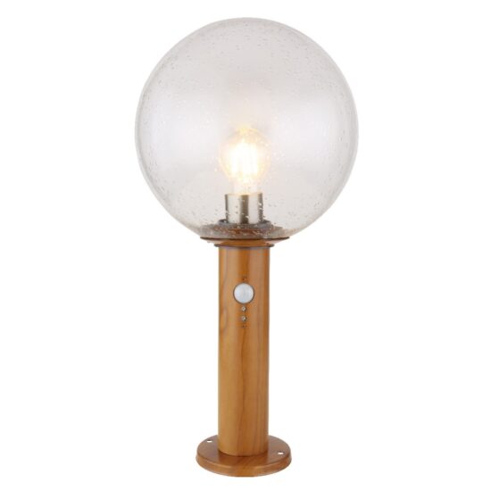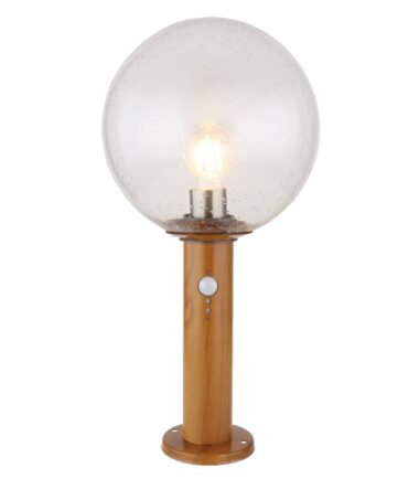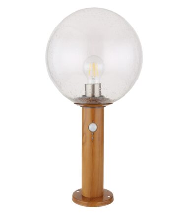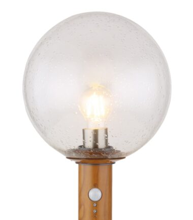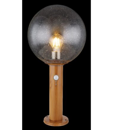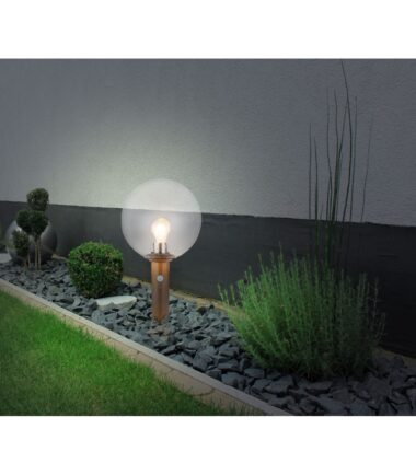Ova vanvremenska spoljašnja lampa (Ø25cm) serije OSSY idealna je sa visinom od 50cm kao podna lampa na otvorenom i pravi odličnu celokupnu sliku zbog prelepog drvenog izgleda. Iz cilindričnog tela u prelepom drvenom izgledu istureno je E27 LED grlo koje može biti opremljeno sijalicom po vašem izboru, do maksimalne snage od 15 vati, a opremljena je detektorom pokreta (0-7m / 90 °). Okrugla staklena kugla sa mehurićima prekriva E27 LED grlo i pruža zaštitu od prskanja vodom.