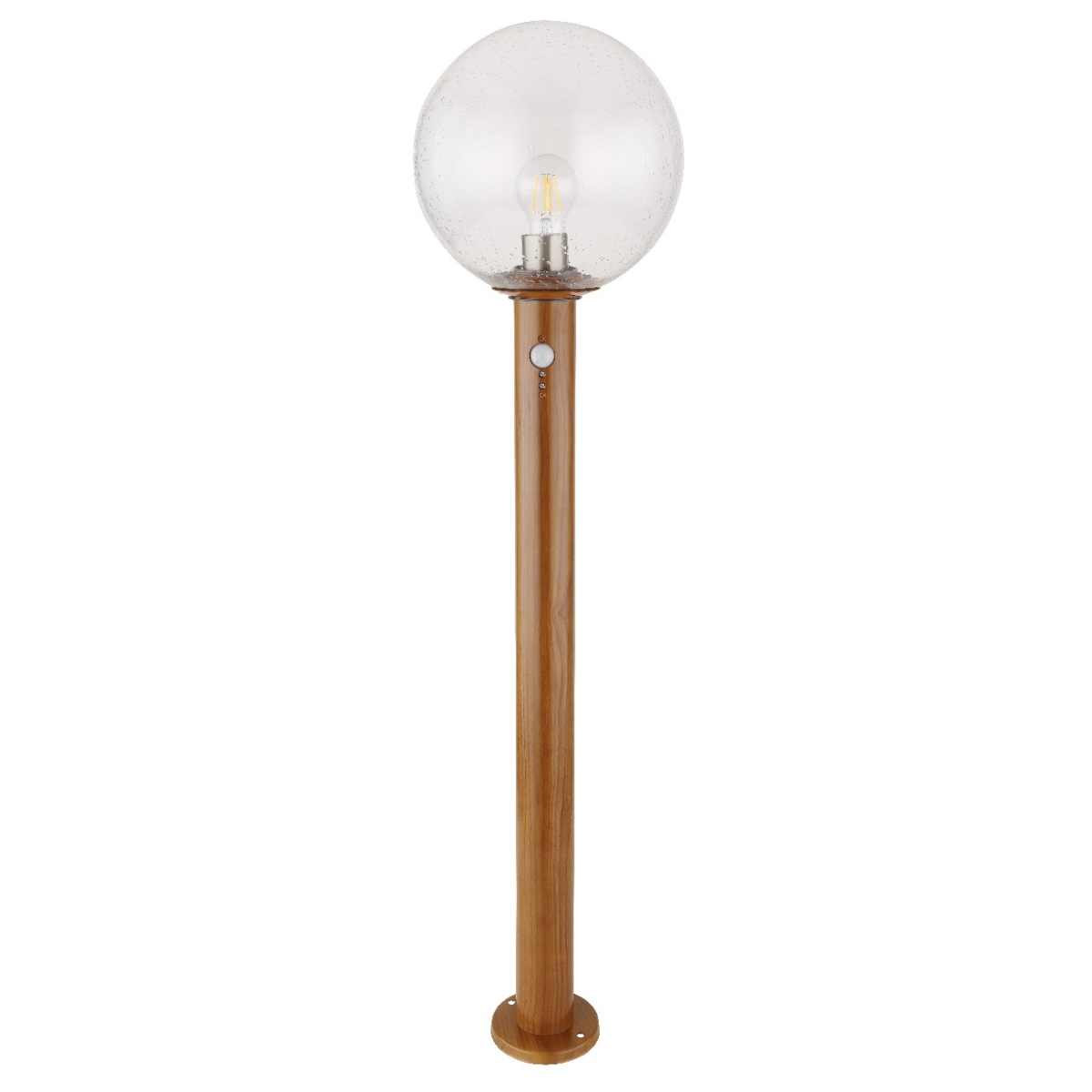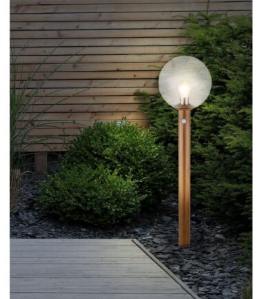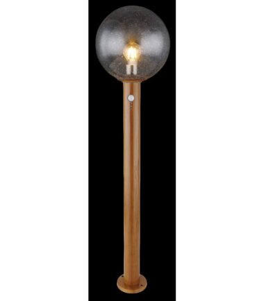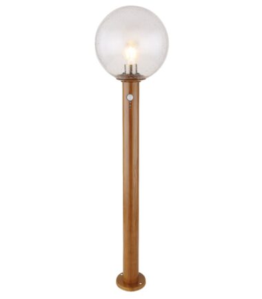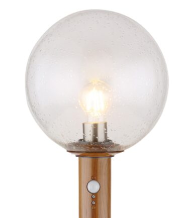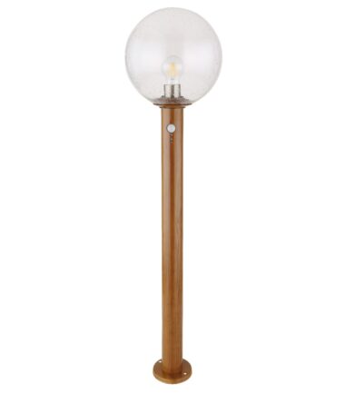Ova vanvremenska spoljašnja lampa (Ø25cm) serije OSSY idealna je sa visinom od 100cm kao podna lampa na otvorenom i pravi odličnu celokupnu sliku zbog prelepog drvenog izgleda. Iz cilindričnog tela u prelepom drvenom izgledu istureno je E27 LED grlo koja može biti opremljeno sijalicom po vašem izboru, do maksimalne snage od 15 vati, a opremljena je detektorom pokreta (0-7m / 90 °). Okrugla staklena kugla sa mehurićima prekriva E27 LED grlo i pruža zaštitu od prskanja vodom.