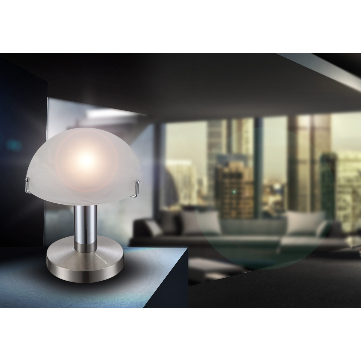 Stona lampa OTTI sastoji se od nikl-mat i delimično hromirane metalne podloge, kao i hemisfere napravljene od belog stakla u alabasterskom izgledu (Ø15 cm). Ova velika stona lampa od skoro 23 cm daje 195 lumena jako svetlo sa prijatnom svetlom bojom od 3000K. Uključivanje i isključivanje pomoću funkcije dodira.