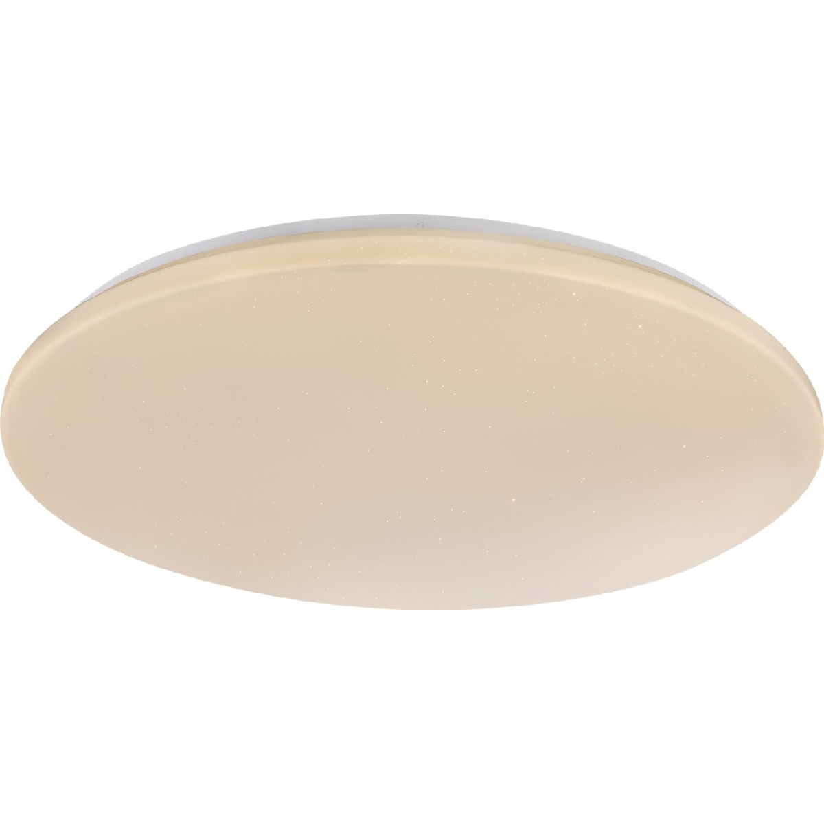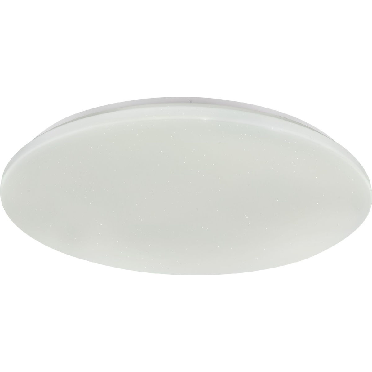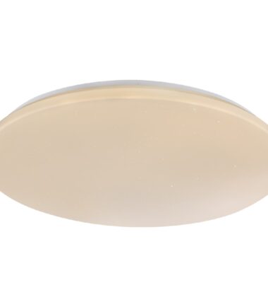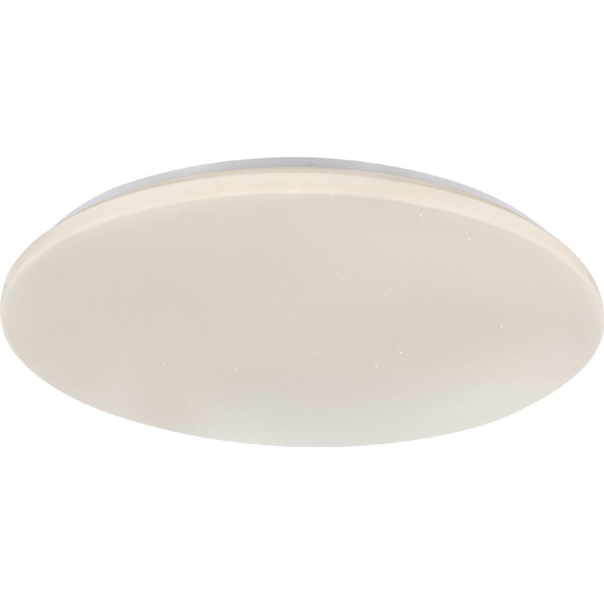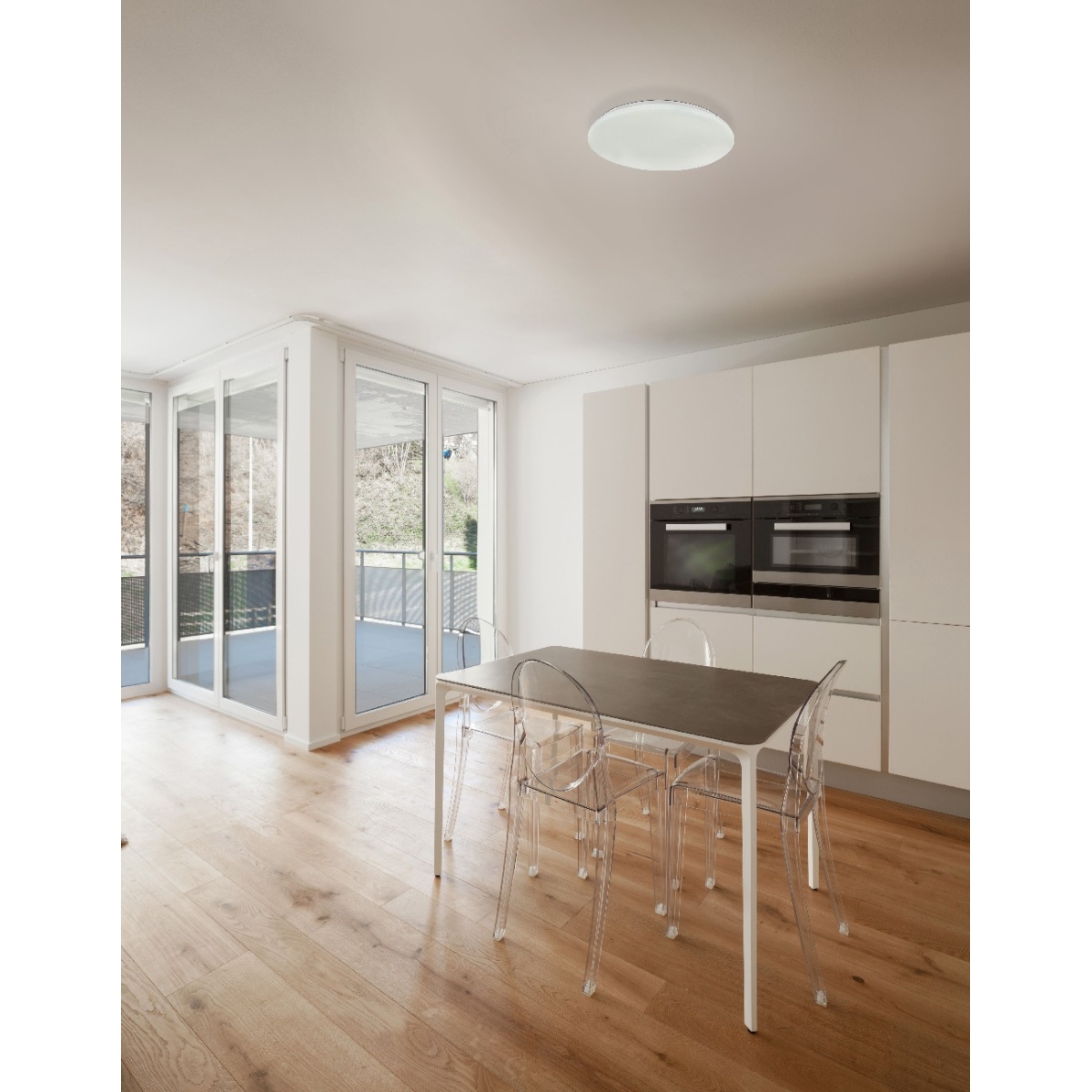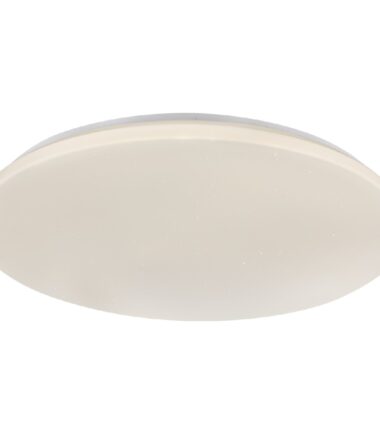Ova okrugla (55cm) plafonska lampa postiže rezultate svojom funkcionalnošću. Napravljena od belog metala i belog akrila sa svetlucavom efektom, ova unutrašnja lampa ima uključen daljinski upravljač sa nekoliko funkcija. Možete da prigušite maksimalnih 3800 lumena do 145 lumena po želji, kao i da promenite boju svetla po potrebi (topla bela 3000K- hladna bela 6000K).