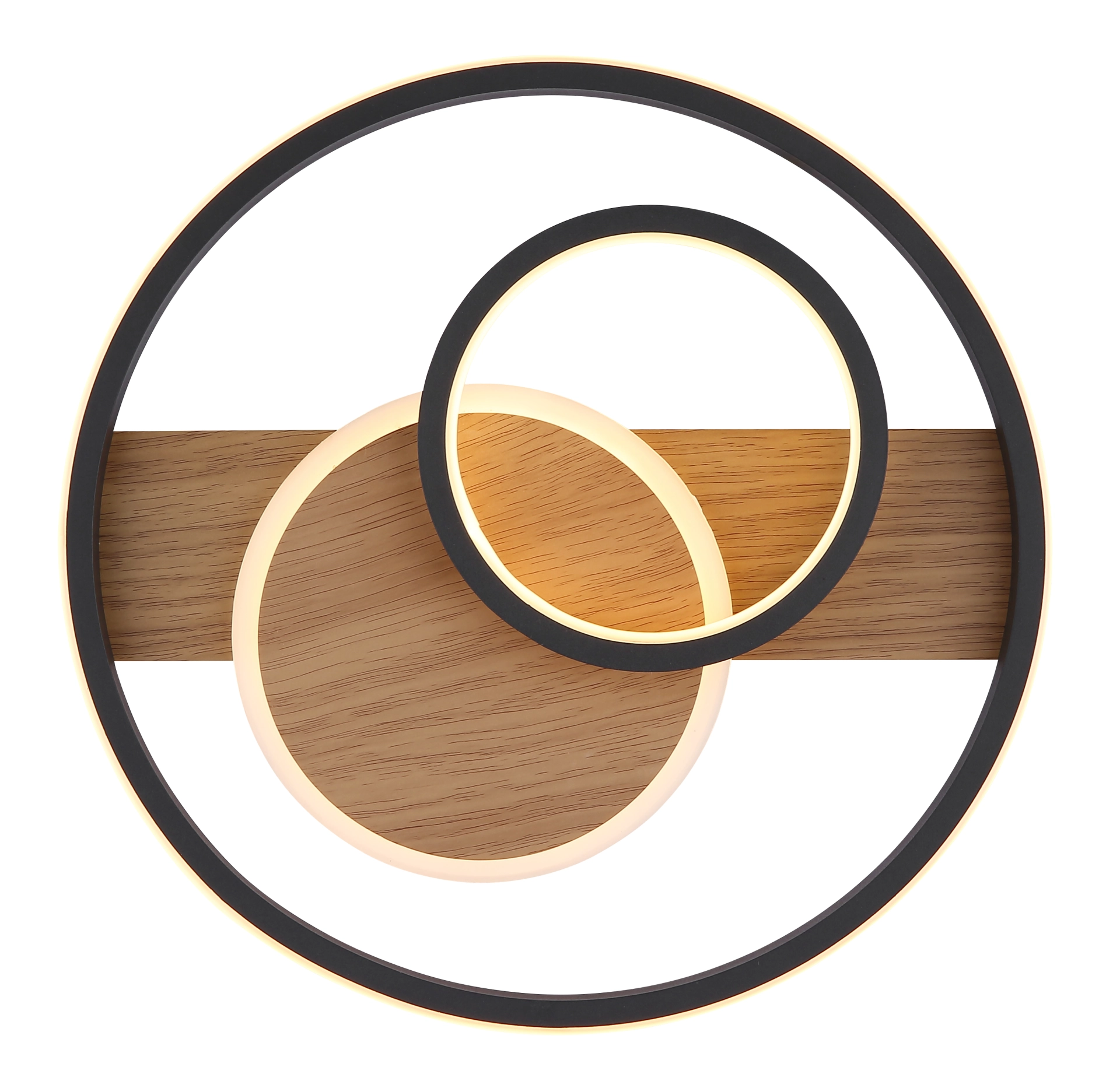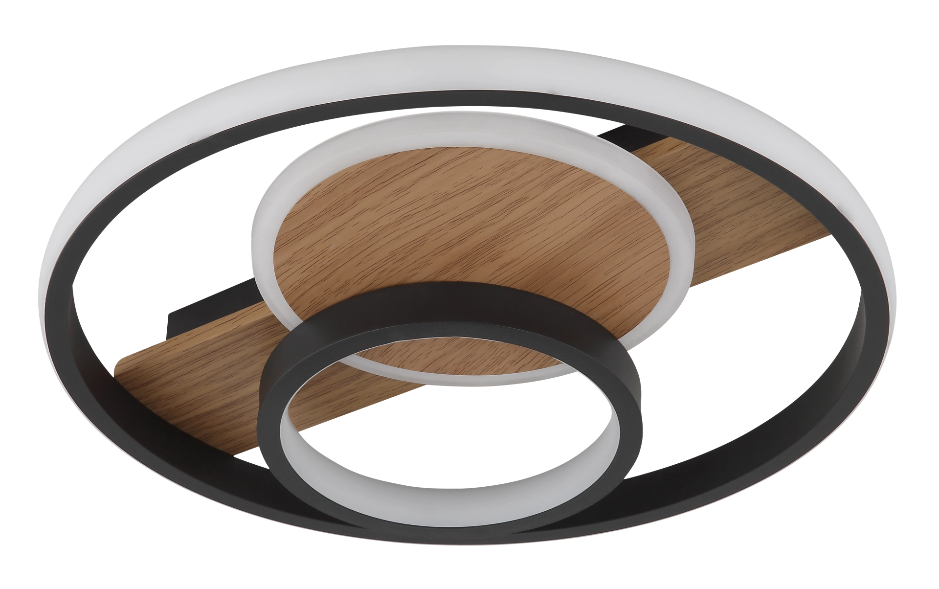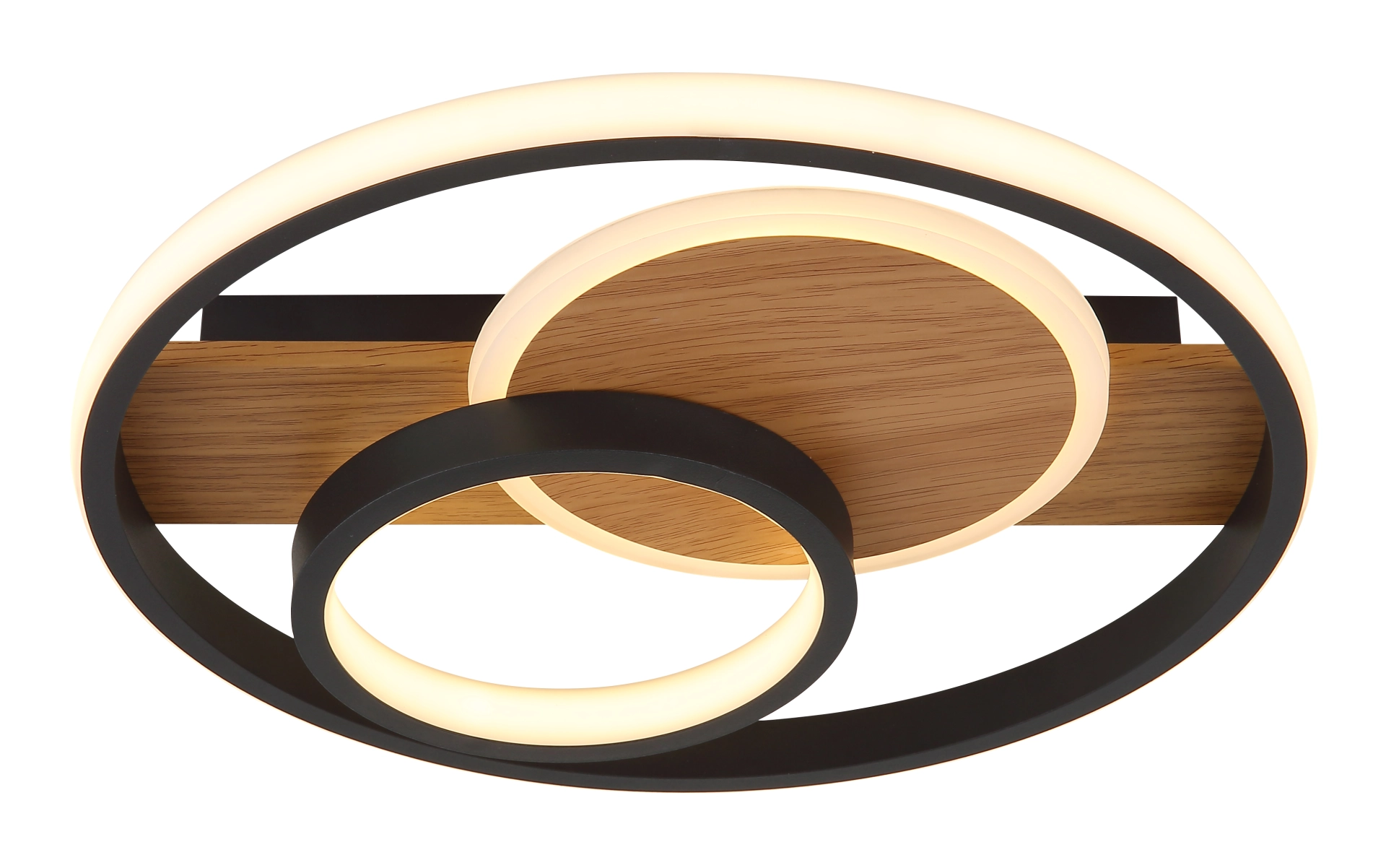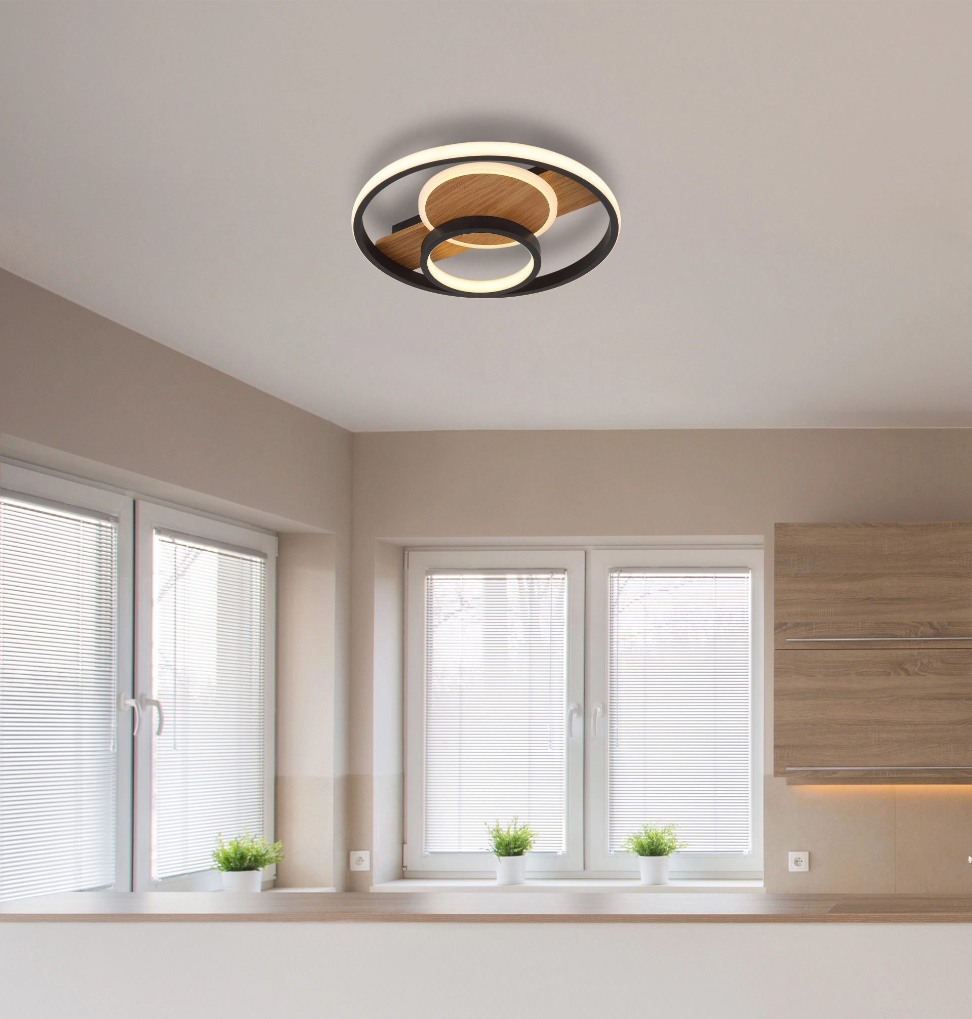 Plafonska lampa PIKARA sa tri prstena kombinuje stilski dizajn i modernu LED tehnologiju. Okruglo metalno kućište sa izgledom drveta daje lampi topao i prirodan izgled, dok tri crna mat aluminijumska abažura daju joj elegantan i bezvremenski izgled. Elementi abažura od satenskog akrila i opal silikona nežno i ravnomerno raspršuju svetlost po celoj prostoriji. Sa prečnikom od 345 mm i svetlosnim izlazom od 1000 lumena, PIKARA pruža prijatno, toplo belo svetlo na 3000 K, što je idealno za dnevne sobe ili trpezarije. Integrisana LED tehnologija ne samo da nudi visoku energetsku efikasnost, već i dug vek trajanja. Tri dekorativna prstena plafonske lampe stvaraju zanimljiv svetlosni prikaz koji vizuelno poboljšava svaku prostoriju i stvara privlačnu atmosferu. PIKARA je savršen izbor za one koji žele da kombinuju dizajn i funkcionalnost.