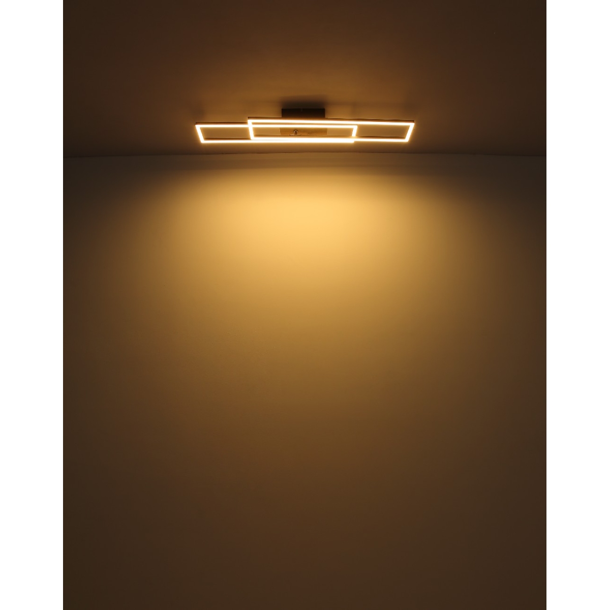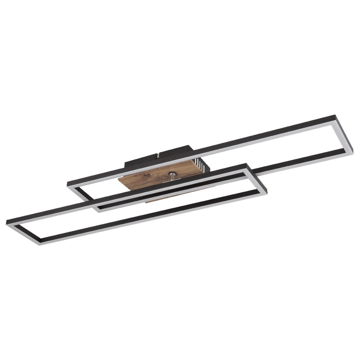 Izdužena plafonska lampa, impresionira svojim modernim i elegantnim dizajnom. Sa dva pravougaonika raspoređena jedan na drugom, od kojih se jedan može rotirati, postavlja moderne akcente u prostoriji. Telo izrađeno od crnog mat metala u kombinaciji sa tamnim izgledom drveta daje lampi plemenit izgled. Abazur napravljen od crnog mat aluminijuma i opal plastike, što osigurava prijatnu distribuciju svetlosti. Sa dimenzijama od 800 mm dužine i 600 mm širine i snagom od 30W, ovo plafonsko svetlo nudi izlaz od 1370 lumena. Temperatura tople bele boje od 3000K stvara prijatnu atmosferu i idealna je za dnevne i spavaće sobe.